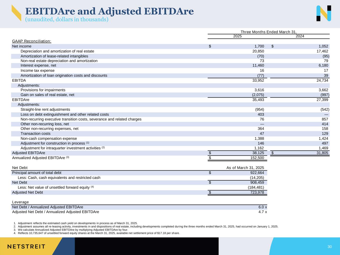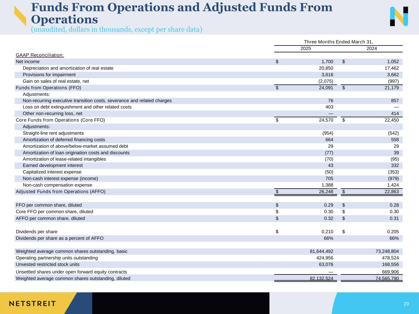 Three Months Ended March 31, 2025 2024 GAAP Reconciliation: Net income $ 1,700 $ 1,052 Depreciation and amortization of real estate 20,850 17,462 Provisions for impairment 3,616 3,662 Gain on sales of real estate, net (2,075) (997) Funds from Operations (FFO) $ 24,091 $ 21,179 Adjustments: Non-recurring executive transition costs, severance and related charges 76 857 Loss on debt extinguishment and other related costs 403 — Other non-recurring loss, net — 414 Core Funds from Operations (Core FFO) $ 24,570 $ 22,450 Adjustments: Straight-line rent adjustments (954) (542) Amortization of deferred financing costs 664 558 Amortization of above/below-market assumed debt 29 29 Amortization of loan origination costs and discounts (77) 39 Amortization of lease-related intangibles (70) (95) Earned development interest 43 332 Capitalized interest expense (50) (353) Non-cash interest expense (income) 705 (979) Non-cash compensation expense 1,388 1,424 Adjusted Funds from Operations (AFFO) $ 26,248 $ 22,863 FFO per common share, diluted $ 0.29 $ 0.28 Core FFO per common share, diluted $ 0.30 $ 0.30 AFFO per common share, diluted $ 0.32 $ 0.31 Dividends per share $ 0.210 $ 0.205 Dividends per share as a percent of AFFO 66% 66% Weighted average common shares outstanding, basic 81,644,492 73,248,804 Operating partnership units outstanding 424,956 478,524 Unvested restricted stock units 63,076 168,556 Unsettled shares under open forward equity contracts — 669,906 Weighted average common shares outstanding, diluted 82,132,524 74,565,790 29 Funds From Operations and Adjusted Funds From Operations (unaudited, dollars in thousands, except per share data)