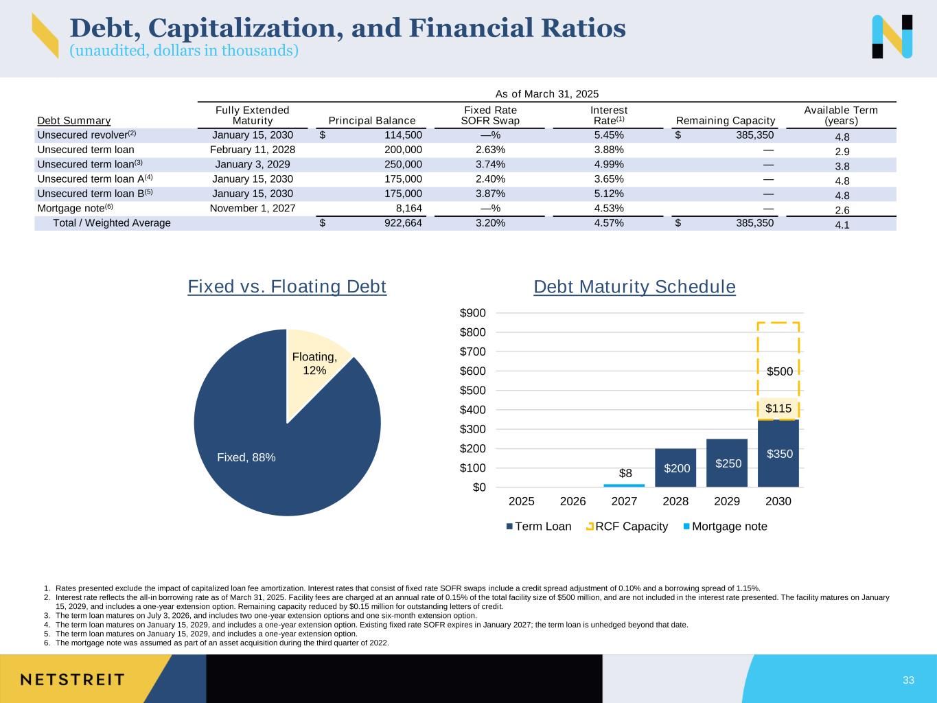 1. Rates presented exclude the impact of capitalized loan fee amortization. Interest rates that consist of fixed rate SOFR swaps include a credit spread adjustment of 0.10% and a borrowing spread of 1.15%. 2. Interest rate reflects the all-in borrowing rate as of March 31, 2025. Facility fees are charged at an annual rate of 0.15% of the total facility size of $500 million, and are not included in the interest rate presented. The facility matures on January 15, 2029, and includes a one-year extension option. Remaining capacity reduced by $0.15 million for outstanding letters of credit. 3. The term loan matures on July 3, 2026, and includes two one-year extension options and one six-month extension option. 4. The term loan matures on January 15, 2029, and includes a one-year extension option. Existing fixed rate SOFR expires in January 2027; the term loan is unhedged beyond that date. 5. The term loan matures on January 15, 2029, and includes a one-year extension option. 6. The mortgage note was assumed as part of an asset acquisition during the third quarter of 2022. As of March 31, 2025 Debt Summary Fully Extended Maturity Principal Balance Fixed Rate SOFR Swap Interest Rate(1) Remaining Capacity Available Term (years) Unsecured revolver(2) January 15, 2030 $ 114,500 —% 5.45% $ 385,350 4.8 Unsecured term loan February 11, 2028 200,000 2.63% 3.88% — 2.9 Unsecured term loan(3) January 3, 2029 250,000 3.74% 4.99% — 3.8 Unsecured term loan A(4) January 15, 2030 175,000 2.40% 3.65% — 4.8 Unsecured term loan B(5) January 15, 2030 175,000 3.87% 5.12% — 4.8 Mortgage note(6) November 1, 2027 8,164 —% 4.53% — 2.6 Total / Weighted Average $ 922,664 3.20% 4.57% $ 385,350 4.1 33 Debt, Capitalization, and Financial Ratios (unaudited, dollars in thousands) Floating, 12% Fixed, 88% Fixed vs. Floating Debt $200 $250 $350 $500 $8 $0 $100 $200 $300 $400 $500 $600 $700 $800 $900 2025 2026 2027 2028 2029 2030 Debt Maturity Schedule Term Loan RCF Capacity Mortgage note $115