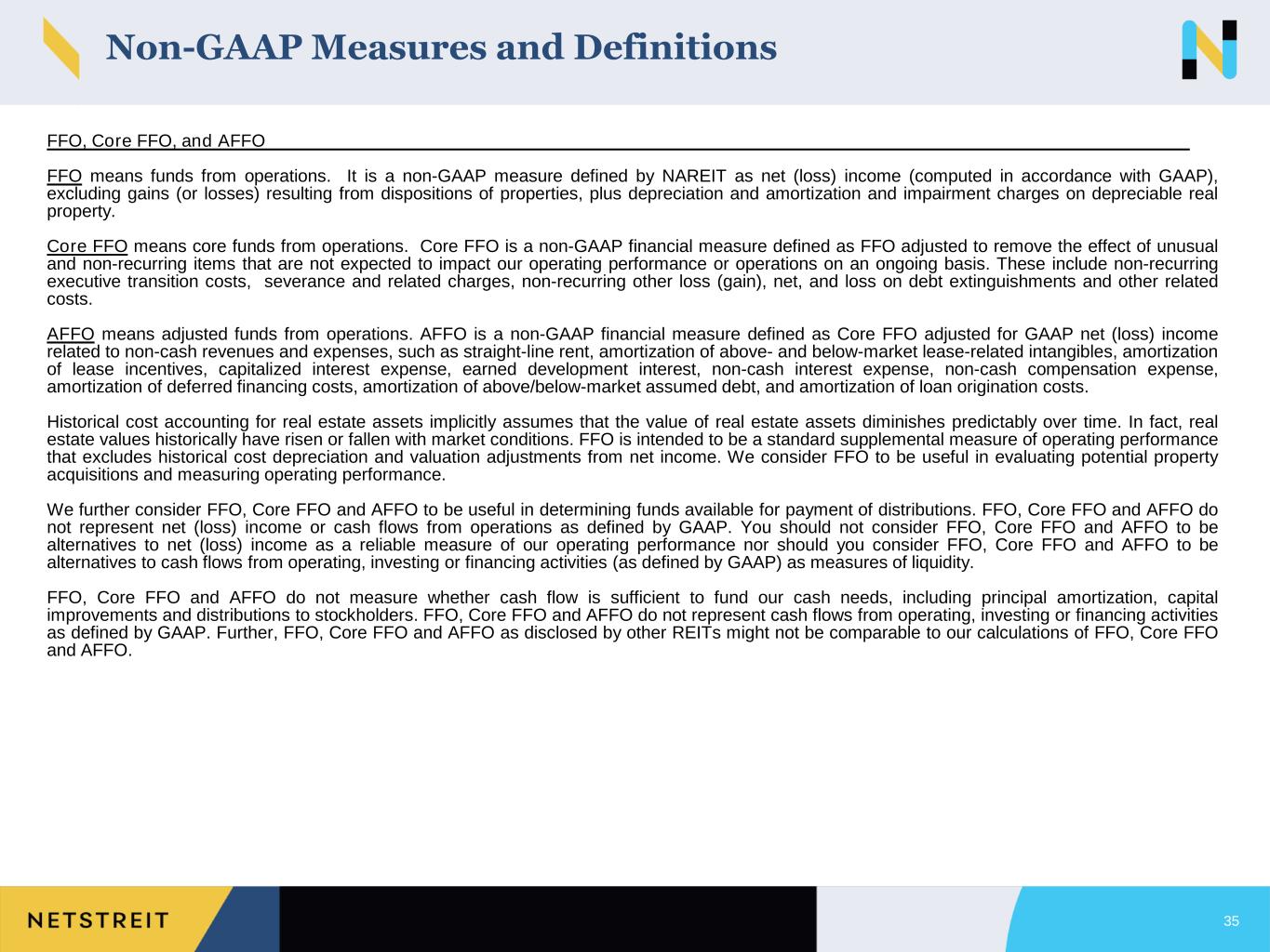 FFO, Core FFO, and AFFO FFO means funds from operations. It is a non-GAAP measure defined by NAREIT as net (loss) income (computed in accordance with GAAP), excluding gains (or losses) resulting from dispositions of properties, plus depreciation and amortization and impairment charges on depreciable real property. Core FFO means core funds from operations. Core FFO is a non-GAAP financial measure defined as FFO adjusted to remove the effect of unusual and non-recurring items that are not expected to impact our operating performance or operations on an ongoing basis. These include non-recurring executive transition costs, severance and related charges, non-recurring other loss (gain), net, and loss on debt extinguishments and other related costs. AFFO means adjusted funds from operations. AFFO is a non-GAAP financial measure defined as Core FFO adjusted for GAAP net (loss) income related to non-cash revenues and expenses, such as straight-line rent, amortization of above- and below-market lease-related intangibles, amortization of lease incentives, capitalized interest expense, earned development interest, non-cash interest expense, non-cash compensation expense, amortization of deferred financing costs, amortization of above/below-market assumed debt, and amortization of loan origination costs. Historical cost accounting for real estate assets implicitly assumes that the value of real estate assets diminishes predictably over time. In fact, real estate values historically have risen or fallen with market conditions. FFO is intended to be a standard supplemental measure of operating performance that excludes historical cost depreciation and valuation adjustments from net income. We consider FFO to be useful in evaluating potential property acquisitions and measuring operating performance. We further consider FFO, Core FFO and AFFO to be useful in determining funds available for payment of distributions. FFO, Core FFO and AFFO do not represent net (loss) income or cash flows from operations as defined by GAAP. You should not consider FFO, Core FFO and AFFO to be alternatives to net (loss) income as a reliable measure of our operating performance nor should you consider FFO, Core FFO and AFFO to be alternatives to cash flows from operating, investing or financing activities (as defined by GAAP) as measures of liquidity. FFO, Core FFO and AFFO do not measure whether cash flow is sufficient to fund our cash needs, including principal amortization, capital improvements and distributions to stockholders. FFO, Core FFO and AFFO do not represent cash flows from operating, investing or financing activities as defined by GAAP. Further, FFO, Core FFO and AFFO as disclosed by other REITs might not be comparable to our calculations of FFO, Core FFO and AFFO. 35 Non-GAAP Measures and Definitions