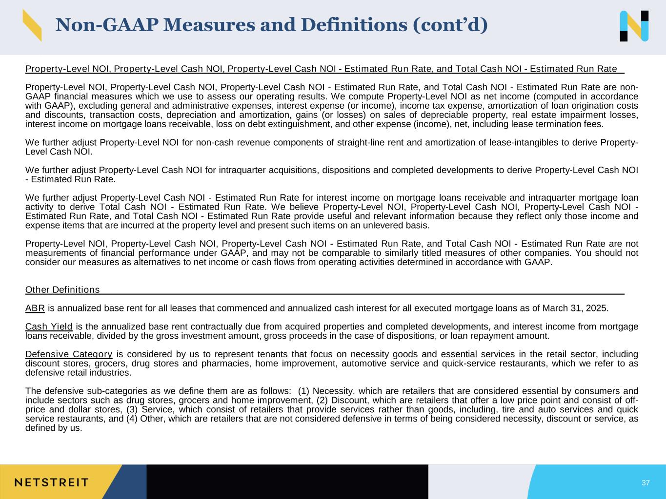 37 Non-GAAP Measures and Definitions (cont’d) Property-Level NOI, Property-Level Cash NOI, Property-Level Cash NOI - Estimated Run Rate, and Total Cash NOI - Estimated Run Rate Property-Level NOI, Property-Level Cash NOI, Property-Level Cash NOI - Estimated Run Rate, and Total Cash NOI - Estimated Run Rate are non- GAAP financial measures which we use to assess our operating results. We compute Property-Level NOI as net income (computed in accordance with GAAP), excluding general and administrative expenses, interest expense (or income), income tax expense, amortization of loan origination costs and discounts, transaction costs, depreciation and amortization, gains (or losses) on sales of depreciable property, real estate impairment losses, interest income on mortgage loans receivable, loss on debt extinguishment, and other expense (income), net, including lease termination fees. We further adjust Property-Level NOI for non-cash revenue components of straight-line rent and amortization of lease-intangibles to derive Property- Level Cash NOI. We further adjust Property-Level Cash NOI for intraquarter acquisitions, dispositions and completed developments to derive Property-Level Cash NOI - Estimated Run Rate. We further adjust Property-Level Cash NOI - Estimated Run Rate for interest income on mortgage loans receivable and intraquarter mortgage loan activity to derive Total Cash NOI - Estimated Run Rate. We believe Property-Level NOI, Property-Level Cash NOI, Property-Level Cash NOI - Estimated Run Rate, and Total Cash NOI - Estimated Run Rate provide useful and relevant information because they reflect only those income and expense items that are incurred at the property level and present such items on an unlevered basis. Property-Level NOI, Property-Level Cash NOI, Property-Level Cash NOI - Estimated Run Rate, and Total Cash NOI - Estimated Run Rate are not measurements of financial performance under GAAP, and may not be comparable to similarly titled measures of other companies. You should not consider our measures as alternatives to net income or cash flows from operating activities determined in accordance with GAAP. Other Definitions ABR is annualized base rent for all leases that commenced and annualized cash interest for all executed mortgage loans as of March 31, 2025. Cash Yield is the annualized base rent contractually due from acquired properties and completed developments, and interest income from mortgage loans receivable, divided by the gross investment amount, gross proceeds in the case of dispositions, or loan repayment amount. Defensive Category is considered by us to represent tenants that focus on necessity goods and essential services in the retail sector, including discount stores, grocers, drug stores and pharmacies, home improvement, automotive service and quick-service restaurants, which we refer to as defensive retail industries. The defensive sub-categories as we define them are as follows: (1) Necessity, which are retailers that are considered essential by consumers and include sectors such as drug stores, grocers and home improvement, (2) Discount, which are retailers that offer a low price point and consist of off- price and dollar stores, (3) Service, which consist of retailers that provide services rather than goods, including, tire and auto services and quick service restaurants, and (4) Other, which are retailers that are not considered defensive in terms of being considered necessity, discount or service, as defined by us.