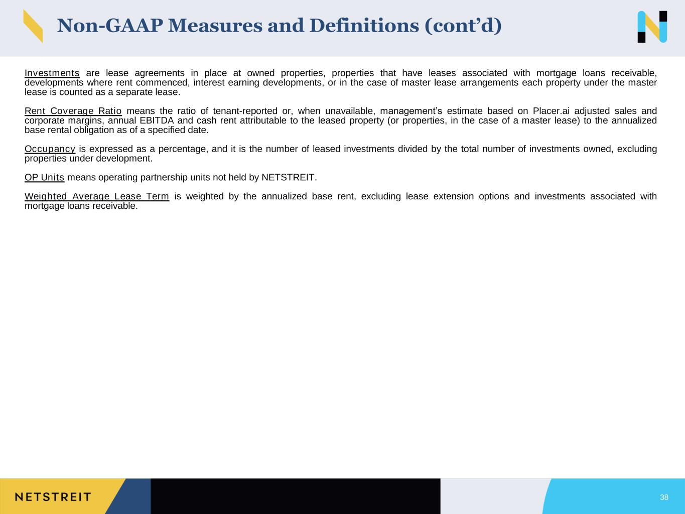 Investments are lease agreements in place at owned properties, properties that have leases associated with mortgage loans receivable, developments where rent commenced, interest earning developments, or in the case of master lease arrangements each property under the master lease is counted as a separate lease. Rent Coverage Ratio means the ratio of tenant-reported or, when unavailable, management’s estimate based on Placer.ai adjusted sales and corporate margins, annual EBITDA and cash rent attributable to the leased property (or properties, in the case of a master lease) to the annualized base rental obligation as of a specified date. Occupancy is expressed as a percentage, and it is the number of leased investments divided by the total number of investments owned, excluding properties under development. OP Units means operating partnership units not held by NETSTREIT. Weighted Average Lease Term is weighted by the annualized base rent, excluding lease extension options and investments associated with mortgage loans receivable. 38 Non-GAAP Measures and Definitions (cont’d)