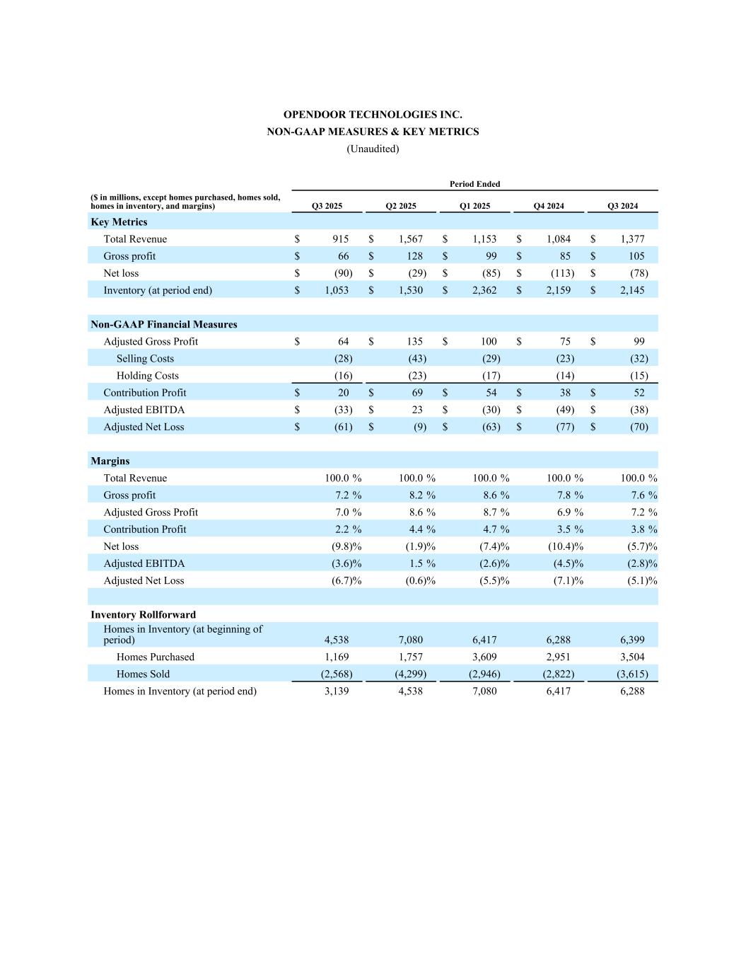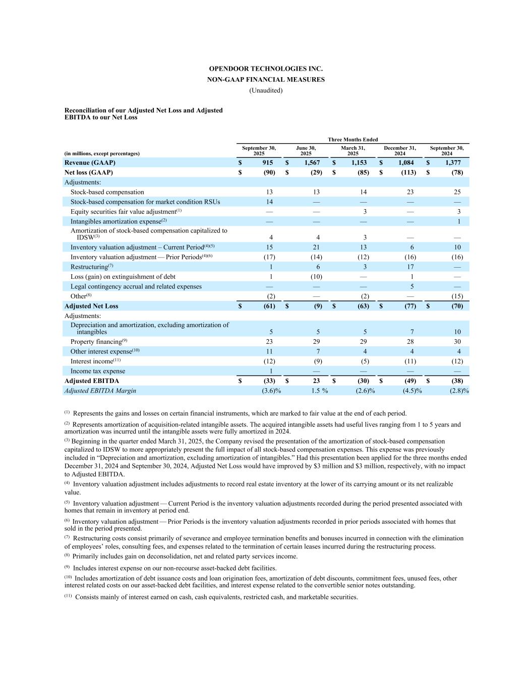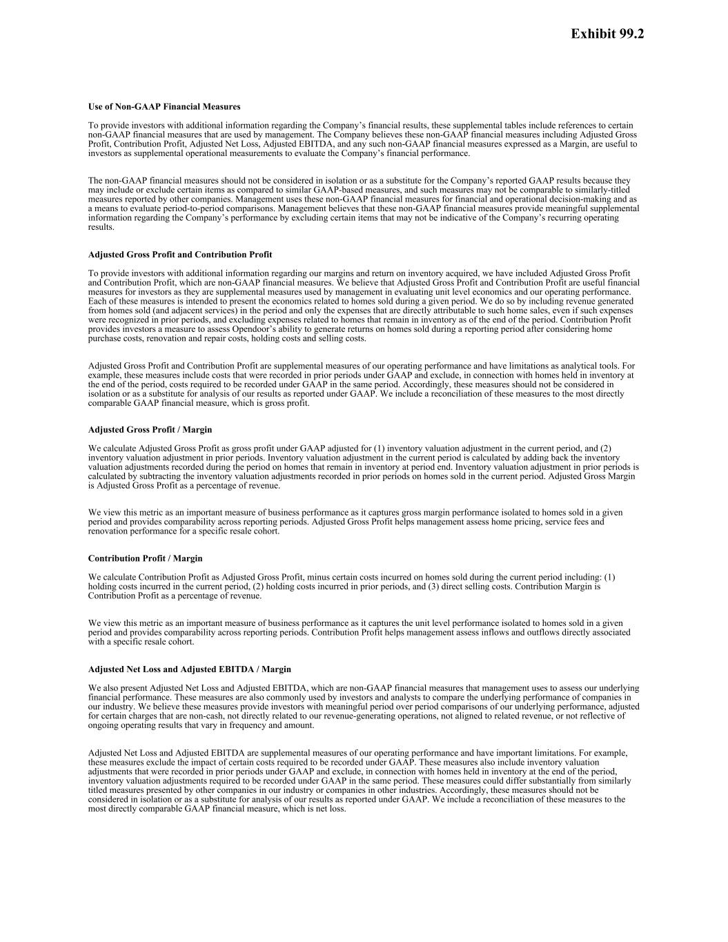 1 Opendoor has not provided a quantitative reconciliation of forecasted Contribution Profit to forecasted GAAP gross profit (loss), forecasted Contribution Margin to forecasted GAAP gross margin, nor a reconciliation of forecasted Adjusted EBITDA to forecasted GAAP net income (loss) within this press release because the Company is unable, without making unreasonable efforts, to calculate certain reconciling items with confidence. These items include, but are not limited to, inventory valuation adjustment and equity securities fair value adjustment. These items, which could materially affect the computation of forward-looking GAAP gross profit (loss), GAAP gross margin, and net income (loss), are inherently uncertain and depend on various factors, some of which are outside of the Company’s control. For more information regarding the non-GAAP financial measures discussed in this press release, please see “Use of Non-GAAP Financial Measures” following the financial tables below.
