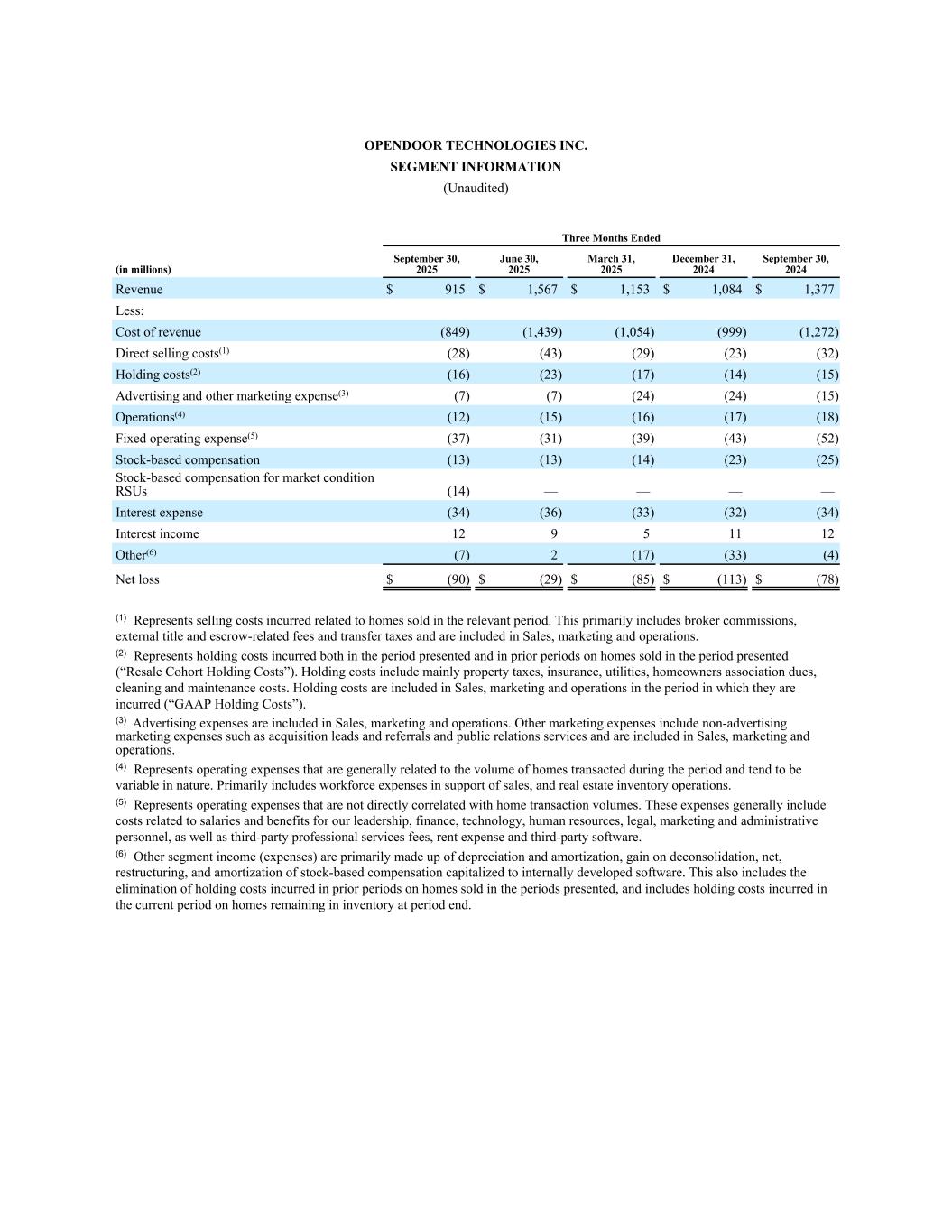 (5)Holding costs include mainly property taxes, insurance, utilities, homeowners association dues, cleaning and maintenance costs. Holding costs are included in Sales, marketing, and operations on the Condensed Consolidated Statements of Operations.
