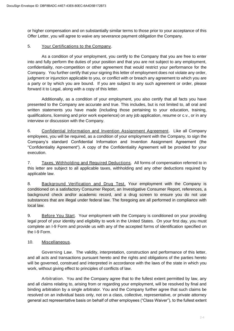 2-4 or higher compensation and on substantially similar terms to those prior to your acceptance of this Offer Letter, you will agree to waive any severance payment obligation the Company. 5. Your Certifications to the Company. As a condition of your employment, you certify to the Company that you are free to enter into and fully perform the duties of your position and that you are not subject to any employment, confidentiality, non-competition or other agreement that would restrict your performance for the Company. You further certify that your signing this letter of employment does not violate any order, judgment or injunction applicable to you, or conflict with or breach any agreement to which you are a party or by which you are bound. If you are subject to any such agreement or order, please forward it to Legal, along with a copy of this letter. Additionally, as a condition of your employment, you also certify that all facts you have presented to the Company are accurate and true. This includes, but is not limited to, all oral and written statements you have made (including those pertaining to your education, training, qualifications, licensing and prior work experience) on any job application, resume or c.v., or in any interview or discussion with the Company. 6. Confidential Information and Invention Assignment Agreement. Like all Company employees, you will be required, as a condition of your employment with the Company, to sign the Company’s standard Confidential Information and Invention Assignment Agreement (the "Confidentiality Agreement"). A copy of the Confidentiality Agreement will be provided for your execution. 7. Taxes, Withholding and Required Deductions. All forms of compensation referred to in this letter are subject to all applicable taxes, withholding and any other deductions required by applicable law. 8. Background Verification and Drug Test. Your employment with the Company is conditioned on a satisfactory Consumer Report, an Investigative Consumer Report, references, a background check and/or academic record, and a drug screen to ensure you do not use substances that are illegal under federal law. The foregoing are all performed in compliance with local law. 9. Before You Start. Your employment with the Company is conditioned on your providing legal proof of your identity and eligibility to work in the United States. On your first day, you must complete an I-9 Form and provide us with any of the accepted forms of identification specified on the I-9 Form. 10. Miscellaneous. Governing Law. The validity, interpretation, construction and performance of this letter, and all acts and transactions pursuant hereto and the rights and obligations of the parties hereto will be governed, construed and interpreted in accordance with the laws of the state in which you work, without giving effect to principles of conflicts of law. Arbitration. You and the Company agree that to the fullest extent permitted by law, any and all claims relating to, arising from or regarding your employment, will be resolved by final and binding arbitration by a single arbitrator. You and the Company further agree that such claims be resolved on an individual basis only, not on a class, collective, representative, or private attorney general act representative basis on behalf of other employees (“Class Waiver”), to the fullest extent DocuSign Envelope ID: DBF8BADC-44E7-43E6-80EC-6A4D5B172B73