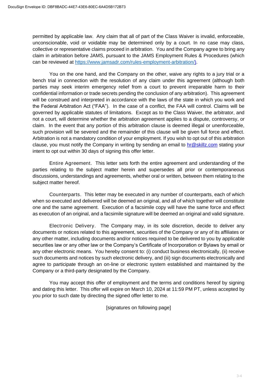 3-4 permitted by applicable law. Any claim that all of part of the Class Waiver is invalid, enforceable, unconscionable, void or voidable may be determined only by a court. In no case may class, collective or representative claims proceed in arbitration. You and the Company agree to bring any claim in arbitration before JAMS, pursuant to the JAMS Employment Rules & Procedures (which can be reviewed at https://www.jamsadr.com/rules-employment-arbitration/). You on the one hand, and the Company on the other, waive any rights to a jury trial or a bench trial in connection with the resolution of any claim under this agreement (although both parties may seek interim emergency relief from a court to prevent irreparable harm to their confidential information or trade secrets pending the conclusion of any arbitration). This agreement will be construed and interpreted in accordance with the laws of the state in which you work and the Federal Arbitration Act (“FAA”). In the case of a conflict, the FAA will control. Claims will be governed by applicable statutes of limitations. Except as to the Class Waiver, the arbitrator, and not a court, will determine whether the arbitration agreement applies to a dispute, controversy, or claim. In the event that any portion of this arbitration clause is deemed illegal or unenforceable, such provision will be severed and the remainder of this clause will be given full force and effect. Arbitration is not a mandatory condition of your employment. If you wish to opt out of this arbitration clause, you must notify the Company in writing by sending an email to hr@skillz.com stating your intent to opt out within 30 days of signing this offer letter. Entire Agreement. This letter sets forth the entire agreement and understanding of the parties relating to the subject matter herein and supersedes all prior or contemporaneous discussions, understandings and agreements, whether oral or written, between them relating to the subject matter hereof. Counterparts. This letter may be executed in any number of counterparts, each of which when so executed and delivered will be deemed an original, and all of which together will constitute one and the same agreement. Execution of a facsimile copy will have the same force and effect as execution of an original, and a facsimile signature will be deemed an original and valid signature. Electronic Delivery. The Company may, in its sole discretion, decide to deliver any documents or notices related to this agreement, securities of the Company or any of its affiliates or any other matter, including documents and/or notices required to be delivered to you by applicable securities law or any other law or the Company’s Certificate of Incorporation or Bylaws by email or any other electronic means. You hereby consent to: (i) conduct business electronically, (ii) receive such documents and notices by such electronic delivery, and (iii) sign documents electronically and agree to participate through an on-line or electronic system established and maintained by the Company or a third-party designated by the Company. You may accept this offer of employment and the terms and conditions hereof by signing and dating this letter. This offer will expire on March 10, 2024 at 11:59 PM PT, unless accepted by you prior to such date by directing the signed offer letter to me. [signatures on following page] DocuSign Envelope ID: DBF8BADC-44E7-43E6-80EC-6A4D5B172B73
