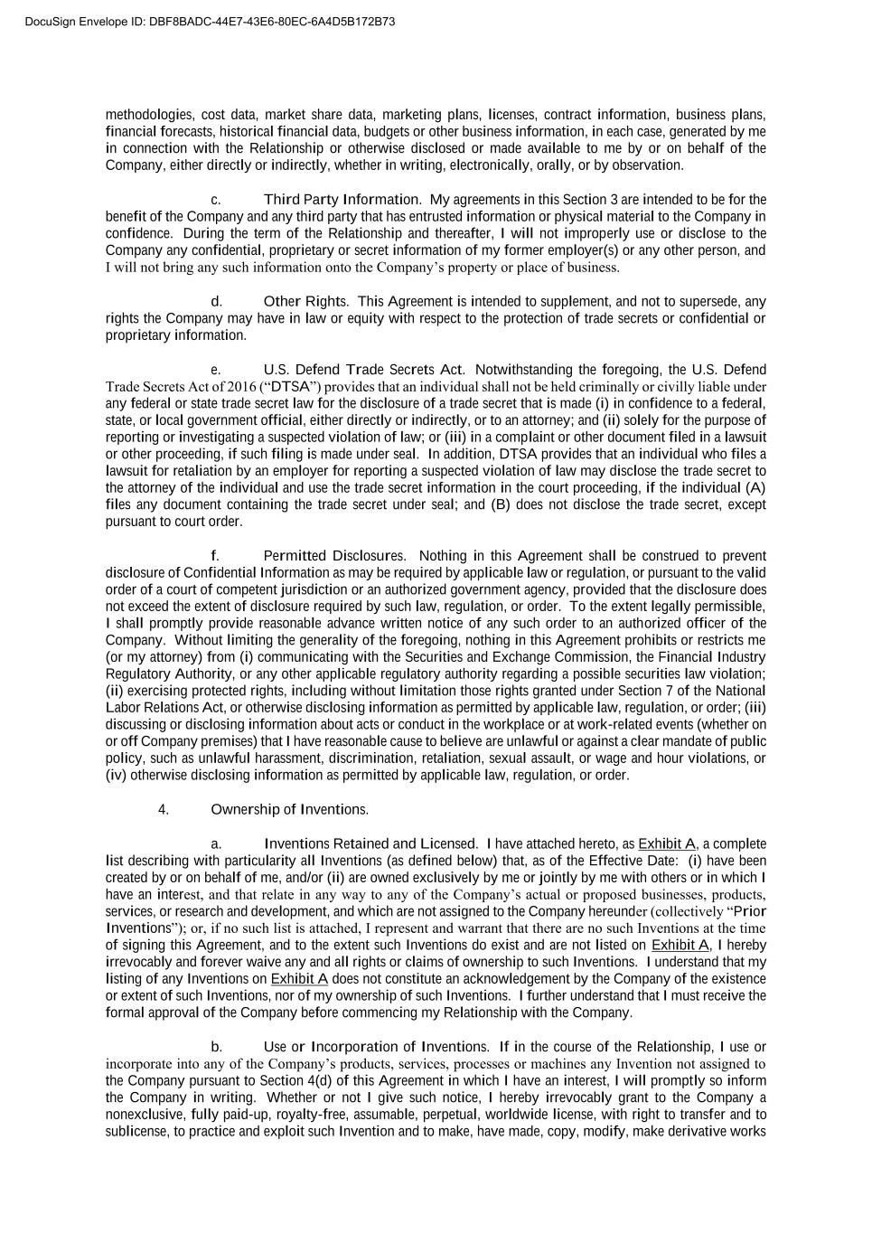 methodologies, cost data, market share data, marketing plans, licenses, contract information, business plans, financial forecasts, historical financial data, budgets or other business information, in each case, generated by me in connection with the Relationship or otherwise disclosed or made available to me by or on behalf of the Company, either directly or indirectly, whether in writing, electronically, orally, or by observation. c. Third Party Information. My agreements in this Section 3 are intended to be for the benefit of the Company and any third party that has entrusted information or physical material to the Company in confidence. During the term of the Relationship and thereafter, I will not improperly use or disclose to the Company any confidential, proprietary or secret information of my former employer(s) or any other person, and I will not bring any such information onto the Company’s property or place of business. d. Other Rights. This Agreement is intended to supplement, and not to supersede, any rights the Company may have in law or equity with respect to the protection of trade secrets or confidential or proprietary information. e. U.S. Defend Trade Secrets Act. Notwithstanding the foregoing, the U.S. Defend Trade Secrets Act of 2016 (“DTSA”) provides that an individual shall not be held criminally or civilly liable under any federal or state trade secret law for the disclosure of a trade secret that is made (i) in confidence to a federal, state, or local government official, either directly or indirectly, or to an attorney; and (ii) solely for the purpose of reporting or investigating a suspected violation of law; or (iii) in a complaint or other document filed in a lawsuit or other proceeding, if such filing is made under seal. In addition, DTSA provides that an individual who files a lawsuit for retaliation by an employer for reporting a suspected violation of law may disclose the trade secret to the attorney of the individual and use the trade secret information in the court proceeding, if the individual (A) files any document containing the trade secret under seal; and (B) does not disclose the trade secret, except pursuant to court order. f. Permitted Disclosures. Nothing in this Agreement shall be construed to prevent disclosure of Confidential Information as may be required by applicable law or regulation, or pursuant to the valid order of a court of competent jurisdiction or an authorized government agency, provided that the disclosure does not exceed the extent of disclosure required by such law, regulation, or order. To the extent legally permissible, I shall promptly provide reasonable advance written notice of any such order to an authorized officer of the Company. Without limiting the generality of the foregoing, nothing in this Agreement prohibits or restricts me (or my attorney) from (i) communicating with the Securities and Exchange Commission, the Financial Industry Regulatory Authority, or any other applicable regulatory authority regarding a possible securities law violation; (ii) exercising protected rights, including without limitation those rights granted under Section 7 of the National Labor Relations Act, or otherwise disclosing information as permitted by applicable law, regulation, or order; (iii) discussing or disclosing information about acts or conduct in the workplace or at work-related events (whether on or off Company premises) that I have reasonable cause to believe are unlawful or against a clear mandate of public policy, such as unlawful harassment, discrimination, retaliation, sexual assault, or wage and hour violations, or (iv) otherwise disclosing information as permitted by applicable law, regulation, or order. 4. Ownership of Inventions. a. Inventions Retained and Licensed. I have attached hereto, as Exhibit A, a complete list describing with particularity all Inventions (as defined below) that, as of the Effective Date: (i) have been created by or on behalf of me, and/or (ii) are owned exclusively by me or jointly by me with others or in which I have an interest, and that relate in any way to any of the Company’s actual or proposed businesses, products, services, or research and development, and which are not assigned to the Company hereunder (collectively “Prior Inventions”); or, if no such list is attached, I represent and warrant that there are no such Inventions at the time of signing this Agreement, and to the extent such Inventions do exist and are not listed on Exhibit A, I hereby irrevocably and forever waive any and all rights or claims of ownership to such Inventions. I understand that my listing of any Inventions on Exhibit A does not constitute an acknowledgement by the Company of the existence or extent of such Inventions, nor of my ownership of such Inventions. I further understand that I must receive the formal approval of the Company before commencing my Relationship with the Company. b. Use or Incorporation of Inventions. If in the course of the Relationship, I use or incorporate into any of the Company’s products, services, processes or machines any Invention not assigned to the Company pursuant to Section 4(d) of this Agreement in which I have an interest, I will promptly so inform the Company in writing. Whether or not I give such notice, I hereby irrevocably grant to the Company a nonexclusive, fully paid-up, royalty-free, assumable, perpetual, worldwide license, with right to transfer and to sublicense, to practice and exploit such Invention and to make, have made, copy, modify, make derivative works DocuSign Envelope ID: DBF8BADC-44E7-43E6-80EC-6A4D5B172B73