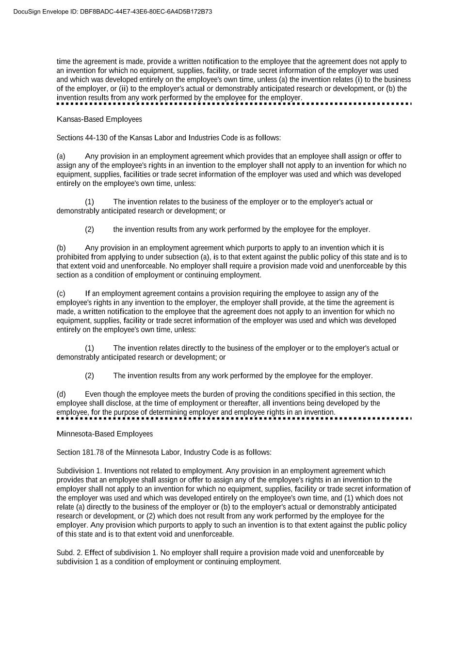 time the agreement is made, provide a written notification to the employee that the agreement does not apply to an invention for which no equipment, supplies, facility, or trade secret information of the employer was used and which was developed entirely on the employee's own time, unless (a) the invention relates (i) to the business of the employer, or (ii) to the employer's actual or demonstrably anticipated research or development, or (b) the invention results from any work performed by the employee for the employer. Kansas-Based Employees Sections 44-130 of the Kansas Labor and Industries Code is as follows: (a) Any provision in an employment agreement which provides that an employee shall assign or offer to assign any of the employee's rights in an invention to the employer shall not apply to an invention for which no equipment, supplies, facilities or trade secret information of the employer was used and which was developed entirely on the employee's own time, unless: (1) The invention relates to the business of the employer or to the employer's actual or demonstrably anticipated research or development; or (2) the invention results from any work performed by the employee for the employer. (b) Any provision in an employment agreement which purports to apply to an invention which it is prohibited from applying to under subsection (a), is to that extent against the public policy of this state and is to that extent void and unenforceable. No employer shall require a provision made void and unenforceable by this section as a condition of employment or continuing employment. (c) If an employment agreement contains a provision requiring the employee to assign any of the employee's rights in any invention to the employer, the employer shall provide, at the time the agreement is made, a written notification to the employee that the agreement does not apply to an invention for which no equipment, supplies, facility or trade secret information of the employer was used and which was developed entirely on the employee's own time, unless: (1) The invention relates directly to the business of the employer or to the employer's actual or demonstrably anticipated research or development; or (2) The invention results from any work performed by the employee for the employer. (d) Even though the employee meets the burden of proving the conditions specified in this section, the employee shall disclose, at the time of employment or thereafter, all inventions being developed by the employee, for the purpose of determining employer and employee rights in an invention. Minnesota-Based Employees Section 181.78 of the Minnesota Labor, Industry Code is as follows: Subdivision 1. Inventions not related to employment. Any provision in an employment agreement which provides that an employee shall assign or offer to assign any of the employee's rights in an invention to the employer shall not apply to an invention for which no equipment, supplies, facility or trade secret information of the employer was used and which was developed entirely on the employee's own time, and (1) which does not relate (a) directly to the business of the employer or (b) to the employer's actual or demonstrably anticipated research or development, or (2) which does not result from any work performed by the employee for the employer. Any provision which purports to apply to such an invention is to that extent against the public policy of this state and is to that extent void and unenforceable. Subd. 2. Effect of subdivision 1. No employer shall require a provision made void and unenforceable by subdivision 1 as a condition of employment or continuing employment. DocuSign Envelope ID: DBF8BADC-44E7-43E6-80EC-6A4D5B172B73