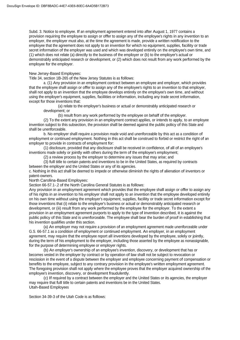 Subd. 3. Notice to employee. If an employment agreement entered into after August 1, 1977 contains a provision requiring the employee to assign or offer to assign any of the employee's rights in any invention to an employer, the employer must also, at the time the agreement is made, provide a written notification to the employee that the agreement does not apply to an invention for which no equipment, supplies, facility or trade secret information of the employer was used and which was developed entirely on the employee's own time, and (1) which does not relate (a) directly to the business of the employer or (b) to the employer's actual or demonstrably anticipated research or development, or (2) which does not result from any work performed by the employee for the employer. New Jersey-Based Employees: Title 34, section 1B-265 of the New Jersey Statutes is as follows: a. (1) Any provision in an employment contract between an employee and employer, which provides that the employee shall assign or offer to assign any of the employee's rights to an invention to that employer, shall not apply to an invention that the employee develops entirely on the employee's own time, and without using the employer's equipment, supplies, facilities or information, including any trade secret information, except for those inventions that: (a) relate to the employer's business or actual or demonstrably anticipated research or development; or (b) result from any work performed by the employee on behalf of the employer. (2) To the extent any provision in an employment contract applies, or intends to apply, to an employee invention subject to this subsection, the provision shall be deemed against the public policy of this State and shall be unenforceable. b. No employer shall require a provision made void and unenforceable by this act as a condition of employment or continued employment. Nothing in this act shall be construed to forbid or restrict the right of an employer to provide in contracts of employment for: (1) disclosure, provided that any disclosure shall be received in confidence, of all of an employee's inventions made solely or jointly with others during the term of the employee's employment; (2) a review process by the employer to determine any issues that may arise; and (3) full title to certain patents and inventions to be in the United States, as required by contracts between the employer and the United States or any of its agencies. c. Nothing in this act shall be deemed to impede or otherwise diminish the rights of alienation of inventors or patent-owners. North Carolina-Based Employees: Section 66-57.1-.2 of the North Carolina General Statutes is as follows: Any provision in an employment agreement which provides that the employee shall assign or offer to assign any of his rights in an invention to his employer shall not apply to an invention that the employee developed entirely on his own time without using the employer's equipment, supplies, facility or trade secret information except for those inventions that (i) relate to the employer's business or actual or demonstrably anticipated research or development, or (ii) result from any work performed by the employee for the employer. To the extent a provision in an employment agreement purports to apply to the type of invention described, it is against the public policy of this State and is unenforceable. The employee shall bear the burden of proof in establishing that his invention qualifies under this section. (a) An employer may not require a provision of an employment agreement made unenforceable under G.S. 66-57.1 as a condition of employment or continued employment. An employer, in an employment agreement, may require that the employee report all inventions developed by the employee, solely or jointly, during the term of his employment to the employer, including those asserted by the employee as nonassignable, for the purpose of determining employee or employer rights. (b) An employer's ownership of an employee's invention, discovery, or development that has or becomes vested in the employer by contract or by operation of law shall not be subject to revocation or rescission in the event of a dispute between the employer and employee concerning payment of compensation or benefits to the employee, subject to any contrary provision in the employee's written employment agreement. The foregoing provision shall not apply where the employee proves that the employer acquired ownership of the employee's invention, discovery, or development fraudulently. (c) If required by a contract between the employer and the United States or its agencies, the employer may require that full title to certain patents and inventions be in the United States. Utah-Based Employees Section 34-39-3 of the Utah Code is as follows: DocuSign Envelope ID: DBF8BADC-44E7-43E6-80EC-6A4D5B172B73