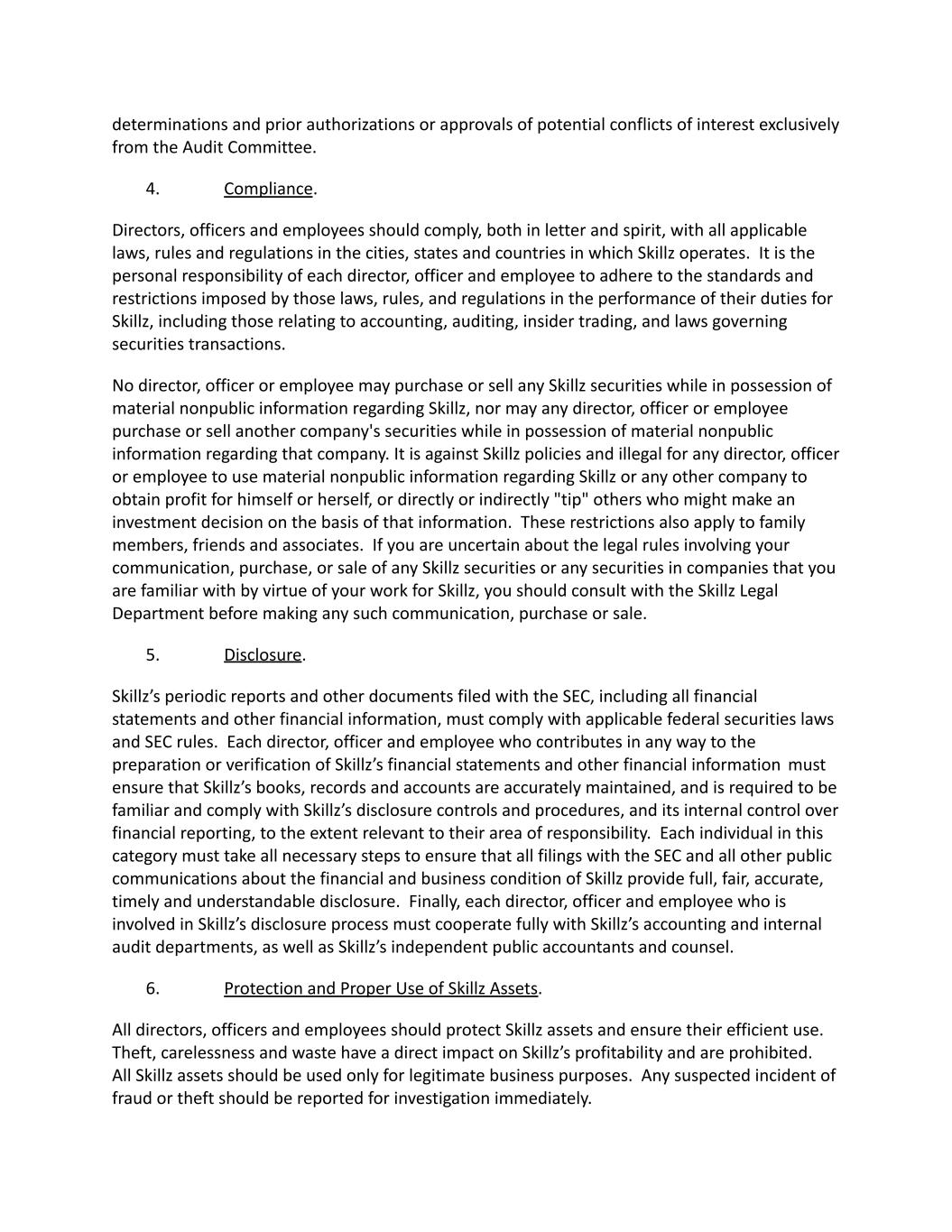 determinations and prior authorizations or approvals of potential conflicts of interest exclusively from the Audit Committee. 4. Compliance. Directors, officers and employees should comply, both in letter and spirit, with all applicable laws, rules and regulations in the cities, states and countries in which Skillz operates. It is the personal responsibility of each director, officer and employee to adhere to the standards and restrictions imposed by those laws, rules, and regulations in the performance of their duties for Skillz, including those relating to accounting, auditing, insider trading, and laws governing securities transactions. No director, officer or employee may purchase or sell any Skillz securities while in possession of material nonpublic information regarding Skillz, nor may any director, officer or employee purchase or sell another company's securities while in possession of material nonpublic information regarding that company. It is against Skillz policies and illegal for any director, officer or employee to use material nonpublic information regarding Skillz or any other company to obtain profit for himself or herself, or directly or indirectly "tip" others who might make an investment decision on the basis of that information. These restrictions also apply to family members, friends and associates. If you are uncertain about the legal rules involving your communication, purchase, or sale of any Skillz securities or any securities in companies that you are familiar with by virtue of your work for Skillz, you should consult with the Skillz Legal Department before making any such communication, purchase or sale. 5. Disclosure. Skillz’s periodic reports and other documents filed with the SEC, including all financial statements and other financial information, must comply with applicable federal securities laws and SEC rules. Each director, officer and employee who contributes in any way to the preparation or verification of Skillz’s financial statements and other financial information must ensure that Skillz’s books, records and accounts are accurately maintained, and is required to be familiar and comply with Skillz’s disclosure controls and procedures, and its internal control over financial reporting, to the extent relevant to their area of responsibility. Each individual in this category must take all necessary steps to ensure that all filings with the SEC and all other public communications about the financial and business condition of Skillz provide full, fair, accurate, timely and understandable disclosure. Finally, each director, officer and employee who is involved in Skillz’s disclosure process must cooperate fully with Skillz’s accounting and internal audit departments, as well as Skillz’s independent public accountants and counsel. 6. Protection and Proper Use of Skillz Assets. All directors, officers and employees should protect Skillz assets and ensure their efficient use. Theft, carelessness and waste have a direct impact on Skillz’s profitability and are prohibited. All Skillz assets should be used only for legitimate business purposes. Any suspected incident of fraud or theft should be reported for investigation immediately.