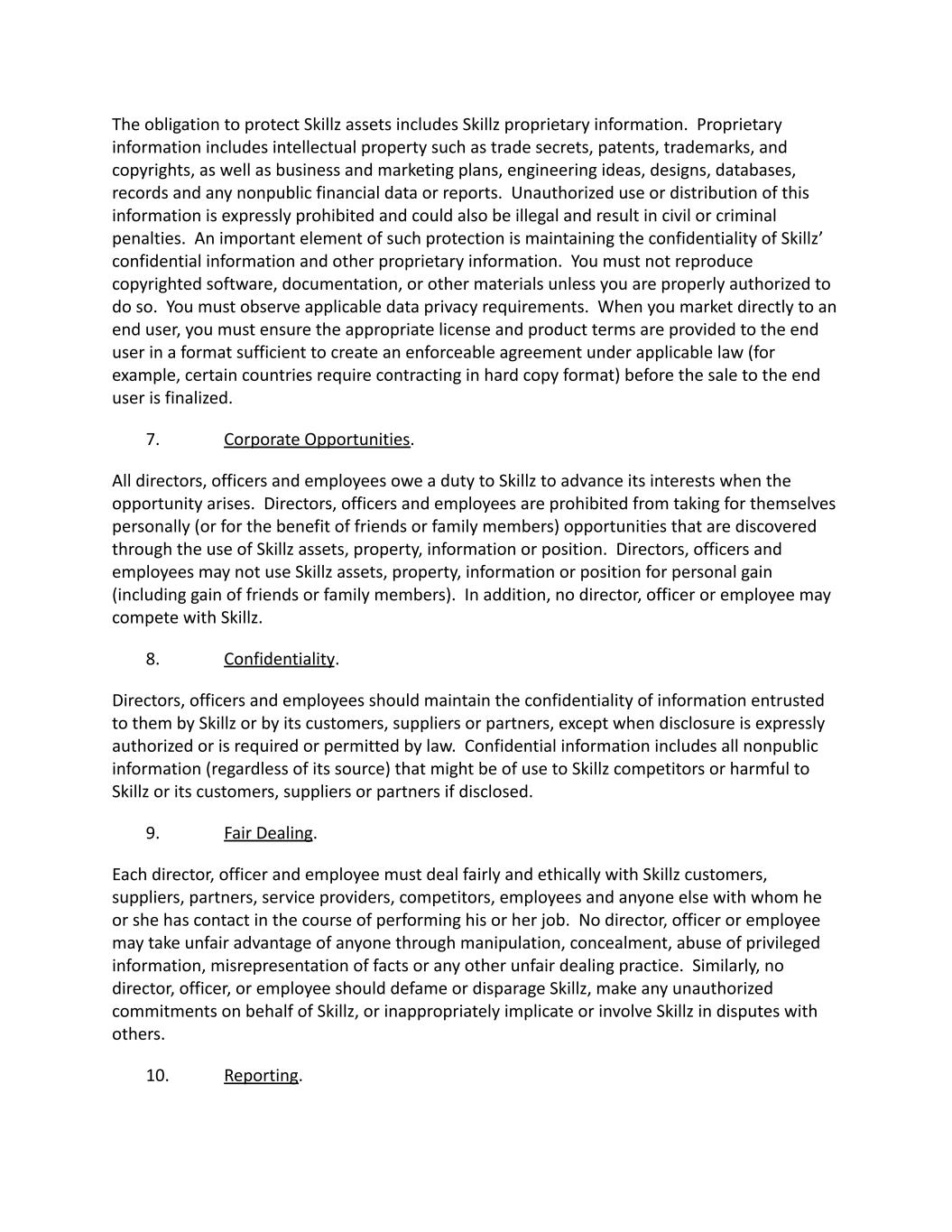 The obligation to protect Skillz assets includes Skillz proprietary information. Proprietary information includes intellectual property such as trade secrets, patents, trademarks, and copyrights, as well as business and marketing plans, engineering ideas, designs, databases, records and any nonpublic financial data or reports. Unauthorized use or distribution of this information is expressly prohibited and could also be illegal and result in civil or criminal penalties. An important element of such protection is maintaining the confidentiality of Skillz’ confidential information and other proprietary information. You must not reproduce copyrighted software, documentation, or other materials unless you are properly authorized to do so. You must observe applicable data privacy requirements. When you market directly to an end user, you must ensure the appropriate license and product terms are provided to the end user in a format sufficient to create an enforceable agreement under applicable law (for example, certain countries require contracting in hard copy format) before the sale to the end user is finalized. 7. Corporate Opportunities. All directors, officers and employees owe a duty to Skillz to advance its interests when the opportunity arises. Directors, officers and employees are prohibited from taking for themselves personally (or for the benefit of friends or family members) opportunities that are discovered through the use of Skillz assets, property, information or position. Directors, officers and employees may not use Skillz assets, property, information or position for personal gain (including gain of friends or family members). In addition, no director, officer or employee may compete with Skillz. 8. Confidentiality. Directors, officers and employees should maintain the confidentiality of information entrusted to them by Skillz or by its customers, suppliers or partners, except when disclosure is expressly authorized or is required or permitted by law. Confidential information includes all nonpublic information (regardless of its source) that might be of use to Skillz competitors or harmful to Skillz or its customers, suppliers or partners if disclosed. 9. Fair Dealing. Each director, officer and employee must deal fairly and ethically with Skillz customers, suppliers, partners, service providers, competitors, employees and anyone else with whom he or she has contact in the course of performing his or her job. No director, officer or employee may take unfair advantage of anyone through manipulation, concealment, abuse of privileged information, misrepresentation of facts or any other unfair dealing practice. Similarly, no director, officer, or employee should defame or disparage Skillz, make any unauthorized commitments on behalf of Skillz, or inappropriately implicate or involve Skillz in disputes with others. 10. Reporting.