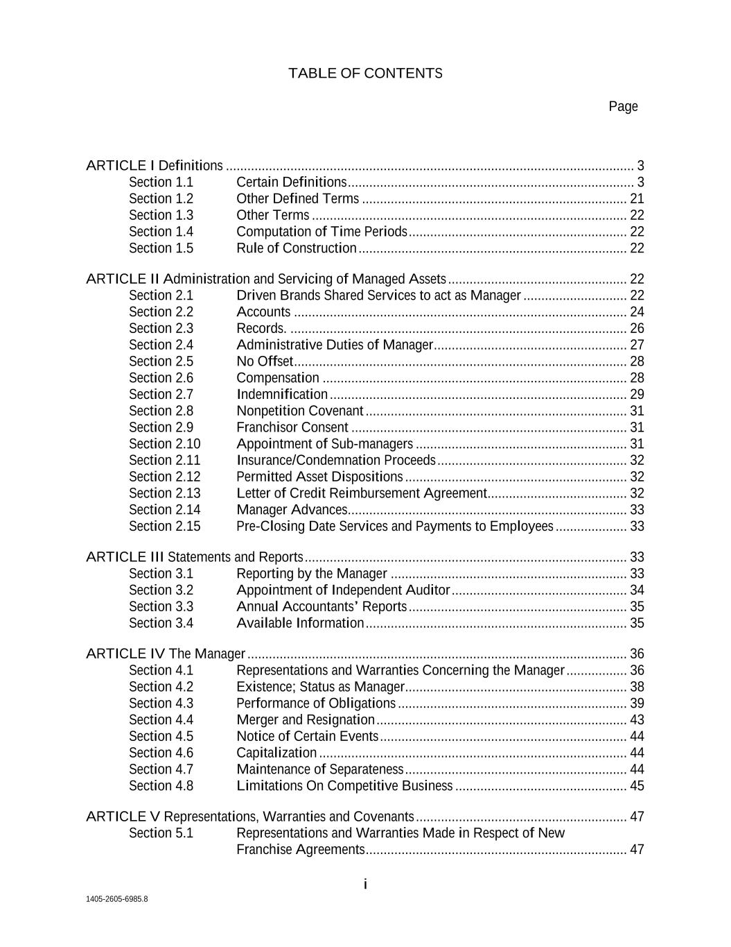 iii Section 7.17 Other Representations .......................................................................................... 82 Section 7.18 Insurance .............................................................................................................. 82 Section 7.19 Environmental Matters ........................................................................................ 82 Section 7.20 Intellectual Property ............................................................................................. 83 Section 7.21 Payments on the Notes ......................................................................................... 84 Article VIII COVENANTS ........................................................................................................................ 84 Section 8.1 Payment of Notes ................................................................................................. 84 Section 8.2 Maintenance of Office or Agency........................................................................ 84 Section 8.3 Payment and Performance of Obligations ........................................................... 85 Section 8.4 Maintenance of Existence .................................................................................... 85 Section 8.5 Compliance with Laws ........................................................................................ 85 Section 8.6 Inspection of Property; Books and Records ......................................................... 85 Section 8.7 Actions under the Transaction Documents .......................................................... 86 Section 8.8 Notice of Defaults and Other Events ................................................................... 88 Section 8.9 Notice of Material Proceedings ........................................................................... 88 Section 8.10 Further Requests .................................................................................................. 88 Section 8.11 Further Assurances .............................................................................................. 88 Section 8.12 Liens .................................................................................................................... 90 Section 8.13 Other Indebtedness .............................................................................................. 90 Section 8.14 Employee Benefit Plans ....................................................................................... 90 Section 8.15 Mergers ................................................................................................................ 91 Section 8.16 Asset Dispositions................................................................................................ 91 Section 8.17 Acquisition of Assets ........................................................................................... 92 Section 8.18 Dividends, Officers’ Compensation, etc. ............................................................. 92 Section 8.19 Legal Name, Location .......................................................................................... 93 Section 8.20 Charter Documents .............................................................................................. 93 Section 8.21 Investments .......................................................................................................... 93 Section 8.22 No Other Agreements .......................................................................................... 94 Section 8.23 Other Business ..................................................................................................... 94 Section 8.24 Maintenance of Separate Existence ..................................................................... 94 Section 8.25 Covenants Regarding the Securitization IP ......................................................... 96 Section 8.26 Insurance .............................................................................................................. 97 Section 8.27 Litigation .............................................................................................................. 97 Section 8.28 Environmental ...................................................................................................... 98 Section 8.29 Derivatives Generally .......................................................................................... 98 Section 8.30 Future Securitization Entities and Future Brands ................................................ 98 Section 8.31 Tax Lien Reserve Amount ................................................................................... 99 Section 8.32 Bankruptcy or Insolvency Proceedings. ............................................................ 100 Section 8.33 Take 5 Accounts. ............................................................................................... 100