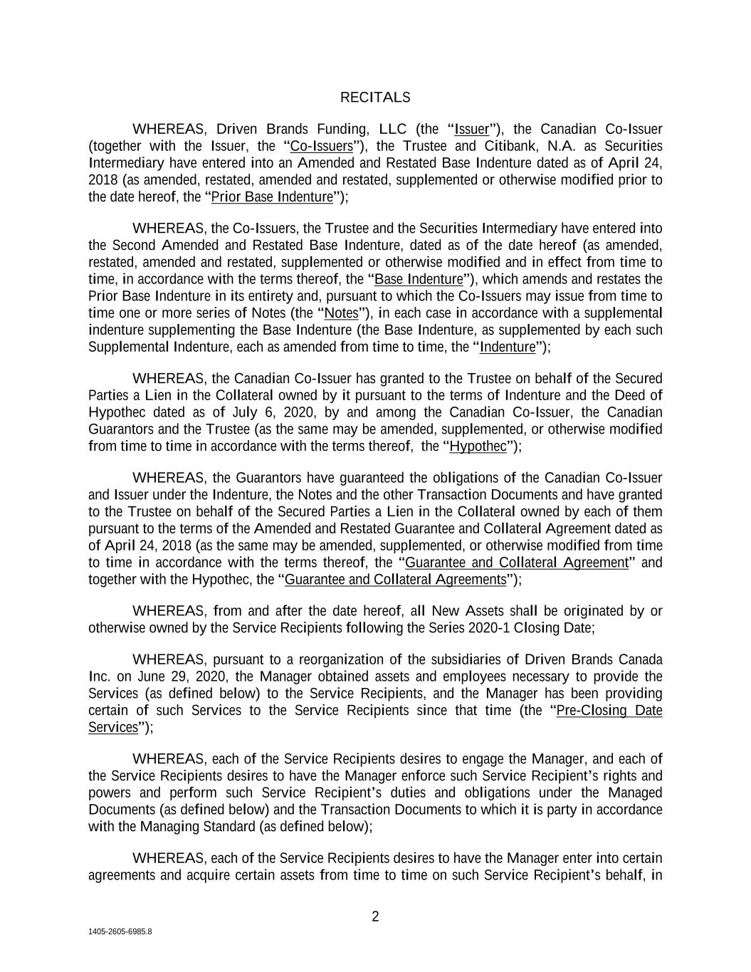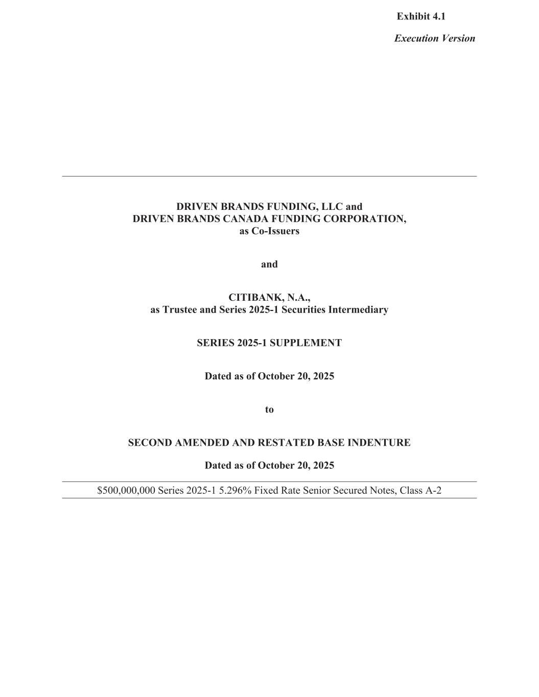 SECOND AMENDED AND RESTATED BASE INDENTURE, dated as of October 20, 2025 (as amended, amended and restated, supplemented or otherwise modified from time to time, exclusive of any Series Supplements, the “Base Indenture”), by and among DRIVEN BRANDS FUNDING, LLC, a Delaware limited liability company (the “Issuer”), DRIVEN BRANDS CANADA FUNDING CORPORATION, a corporation amalgamated under the laws of Canada (the “Canadian Co-Issuer” and together with the Issuer, the “Co-Issuers”), and CITIBANK, N.A., a national banking association, as trustee (in such capacity, the “Trustee”) and as securities intermediary. W I T N E S S E T H: WHEREAS, the Issuer and the Trustee previously entered into that certain Base Indenture, dated as of July 31, 2015 (the “Original Base Indenture”), to provide for the issuance from time to time of one or more series of notes (the “Notes”), and that certain Amended and Restated Base Indenture on April 24, 2018 (the “Prior Base Indenture”); WHEREAS, the Co-Issuers desire to amend and restate the Prior Base Indenture in the manner set forth herein, and to provide for the issuance from time to time of one or more series of Notes in the manner provided in this Base Indenture and in supplements to this Base Indenture and the Series Supplements hereto; and WHEREAS, each Co-Issuer has duly authorized the execution and delivery of this Base Indenture and all other things necessary to make this Base Indenture a legal, valid and binding agreement of such Co-Issuer, in accordance with its terms, have been done, and such Co-Issuer proposes to do all the things necessary to make the Notes, when executed by such Co-Issuer and authenticated and delivered by the Trustee (or registered in the case of Uncertificated Notes) hereunder and duly issued by such Co-Issuer, the legal, valid and binding obligations of such Co-Issuer as hereinafter provided; and WHEREAS, the Control Party, to the extent required pursuant to Section 13.2, has consented to the amendment and restatement of the Prior Base Indenture as set forth in this Base Indenture and the Trustee has received the Officers’ Certificate of the Co-Issuers and an Opinion of Counsel as described in Section 13.6 of the Prior Base Indenture. NOW, THEREFORE, for and in consideration of the premises and the receipt of the Notes by the Noteholders, it is mutually covenanted and agreed, for the equal and proportionate benefit of all Noteholders (in accordance with the priorities set forth herein and in any Series Supplement), as follows: ARTICLE I DEFINITIONS AND INCORPORATION BY REFERENCE Section 1.1 Definitions. (a) Capitalized terms used herein (including the preamble and the recitals hereto) and not otherwise defined herein shall have the meanings assigned to such terms in the Base Indenture Definitions List attached hereto as Annex A (as amended, supplemented or otherwise modified from time to time in accordance with the provisions hereof, the “Base Indenture Definitions List”). (b) Any terms used in the Indenture (including, without limitation, for purposes of Article III) that are defined in the UCC or the PPSA and pertaining to Collateral shall be construed and defined as set forth in the UCC or the PPSA, as applicable, as the context may require, unless otherwise defined in the Indenture.