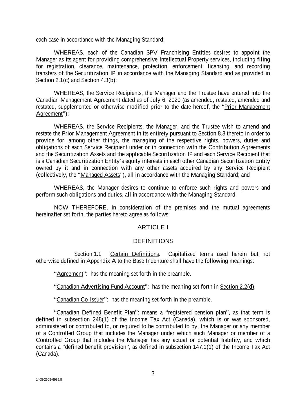 A-25 “Collateral Exclusions” means the following property of the Co-Issuers: (a) any real property constituting a lease and any other lease, license or other contract or permit, in each case solely to the extent that the grant of a lien or security interest in any of the Co-Issuer’s right, title and interest in, to or under such lease, license, contract or permit in the manner contemplated by the Indenture (i) is prohibited by the terms of such lease, license, contract or permit, (ii) would constitute or result in the abandonment, invalidation or unenforceability of any right, title or interest of such Co-Issuer therein or (iii) would otherwise result in a breach thereof or the termination or a right of termination thereof, except to the extent that any such prohibition, breach, termination or right of termination is rendered ineffective pursuant to the New York Uniform Commercial Code, the PPSA or any other applicable law, (b) the Excepted Securitization IP Assets; (c) the Excluded Locations, (d) the Excluded Amounts, (e) the Canadian Residual Account and any amount on deposit therein, (f) any franchise capital account that is not an Interest Reserve Account and any amount on deposit therein and (g) any amounts distributed to the Issuer pursuant to priority (xxix) of the Priority of Payments. “Collateral Protection Advance” means any advance of (a) payments of taxes, rent, assessments, insurance premiums and other related or similar costs and expenses necessary to protect, preserve or restore the Collateral (which, on and after the 2021 Springing Amendments Implementation Date, shall not exceed $30,000 in the aggregate with respect to costs and expenses with respect to the protection or preservation of patent or trademark Collateral except in the sole discretion of the Servicer (or the Trustee, if the Servicer fails to make such Collateral Protection Advance and the Trustee does not determine such Collateral Protection Advance is Nonrecoverable)) and (b) payments of any Securitization Operating Expenses (excluding (i) any indemnification obligations, (ii) business and/or asset-related operating expenses (which, on and after the 2021 Springing Amendments Implementation Date, for the avoidance of doubt, shall include all amounts in respect of sales taxes and other comparable taxes, payroll taxes, wage garnishments, lottery amounts and other amounts that are due and payable to a governmental authority or other unaffiliated third party and other operating expenses incurred in connection with Securitization-Owned Locations), (iii) fees and expenses of external legal counsel that are not directly related to the maintenance or preservation of the Collateral and (iv) damages, costs, or expenses relating to fraud, bad faith, willful misconduct, violations of law, bodily injury, property damage or misappropriation of funds), to the extent not previously paid pursuant to an applicable Manager Advance, in each case made by the Servicer pursuant to the Servicing Agreement in accordance with the Servicing Standard, or by the Trustee (if the Servicer fails to do so) pursuant to the Indenture. “Collateralized Letters of Credit” has the meaning set forth in Section 5.12(h) of the Base Indenture. “Collection Accounts” means, collectively, the U.S. Collection Account and the Canadian Collection Account. “Collection Account Administrative Accounts” has the meaning set forth in Section 5.6 of the Base Indenture. “Collections” means the U.S. Collections together with the Canadian Collections. “Commitment Fees Shortfall” has the meaning set forth in Section 5.12(d) of the Base Indenture. “Companies’ Creditors Arrangement Act” means the Companies’ Creditors Arrangement Act (Canada), as amended, and any successor statute of similar import, in each case as in effect from time to time.