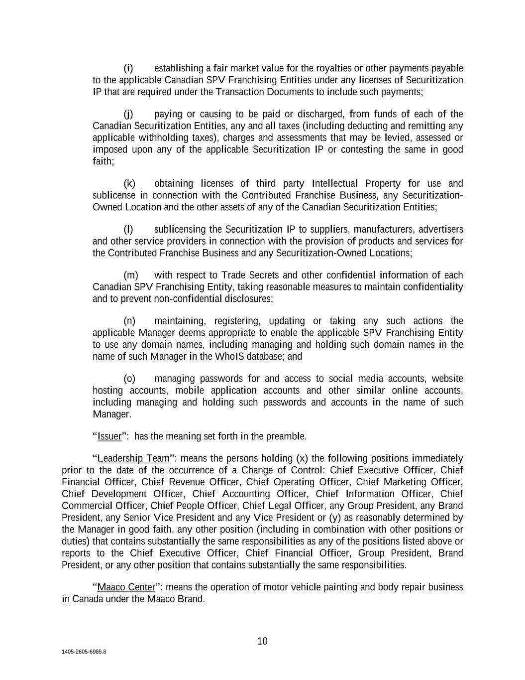 A-39 law now or hereafter in effect, or consents to the appointment of or taking possession by an interim receiver, receiver, receiver and manager, monitor, liquidator, assignee, trustee, custodian, sequestrator (or other similar official) for such Person or for any substantial part of its property, or makes any general assignment for the benefit of creditors; or (c) the board of directors, board of managers, or general partner (or similar body) of such Person votes to implement any of the actions set forth in clause (b) above. “Event of Default” means any of the events set forth in Section 9.2 of the Base Indenture. “Excepted Securitization IP Assets” means (i) any right to use third-party Intellectual Property pursuant to a license to the extent such rights are not able to be pledged; and (ii) any application for registration of a Trademark that would be invalidated, canceled, voided or abandoned due to the grant and/or enforcement of an assignment or security interest, including intent-to-use applications filed with the USPTO pursuant to 15 U.S.C. Section 1051(b) prior to the filing of a statement of use or amendment to allege use pursuant to 15 U.S.C. Section 1051(c) or (d); provided that at such time as the grant and/or enforcement of the assignment or security interest would not cause such application to be invalidated, canceled, voided or abandoned, such Trademark application will not be considered an “Excepted Securitization IP Asset”. “Excess Canadian Weekly Management Fee” has the meaning set forth in the Canadian Management Agreement. “Excess Class A-1 Notes Administrative Expenses Amount” means, for each Weekly Allocation Date, an amount equal to the amount by which (a) the Class A-1 Notes Administrative Expenses that have become due and payable prior to such Weekly Allocation Date and have not been previously paid exceed (b) the Capped Class A-1 Notes Administrative Expenses Amount for such Weekly Allocation Date. “Exchange Act” means the Securities Exchange Act of 1934, as amended. “Excluded Amounts” means (i) Advertising Fees (net of Maaco Net Advertising Commissions in the United States) including, without limitation, any such Advertising Fees transferred to the Advertising Fund Accounts; (ii) amounts in respect of income, withholding or other taxes required to be paid by the Canadian Securitization Entities or any other sales taxes and comparable taxes, payroll taxes, wage garnishments, lottery amounts or other amounts (if any) that are due and payable to a Governmental Authority or other unaffiliated third party; (iii) statutory foreign taxes (if any) included in Collections but required to be remitted to a Governmental Authority; (iv) amounts paid by Franchisees to a Manager in respect of fees or expenses payable to unaffiliated third parties for services provided to Franchisees, including, without limitation, bona fide third-party repairs and maintenance fees, advertising agency fees and production costs, and software licensing and subscription fees; (v) fees and expenses paid by or on behalf of any Securitization Entity in connection with registering, maintaining and enforcing the Securitization IP and paying to other Securitization Entities or third parties Intellectual Property licensing and subscription fees; (vi) any proceeds from or collections in respect of Non-Contributed Property; (vii) amounts paid by Franchisees to a Manager relating to corporate services provided by such Manager, including, without limitation, gift card administration and employee training, to the extent such services are not provided by such Manager pursuant to the applicable Management Agreement; (viii) gift card redemption amounts and initial sale proceeds of gift cards; (ix) account expenses and fees paid to the banks at which the Management Accounts are held; (x) tenant improvement allowances and similar amounts received from landlords (if any); (xi) payments to certain developers (if any); (xii) Distribution Obligations; (xiii) proceeds of directors and officers insurance; (xiv) actual or estimated franchise fee commissions; (xv) hotel and travel costs in connection with software and other Franchisee employee training programs; (xvi) Franchisee Payments in respect of rent or equipment deposits and costs associated with sublease revenue
