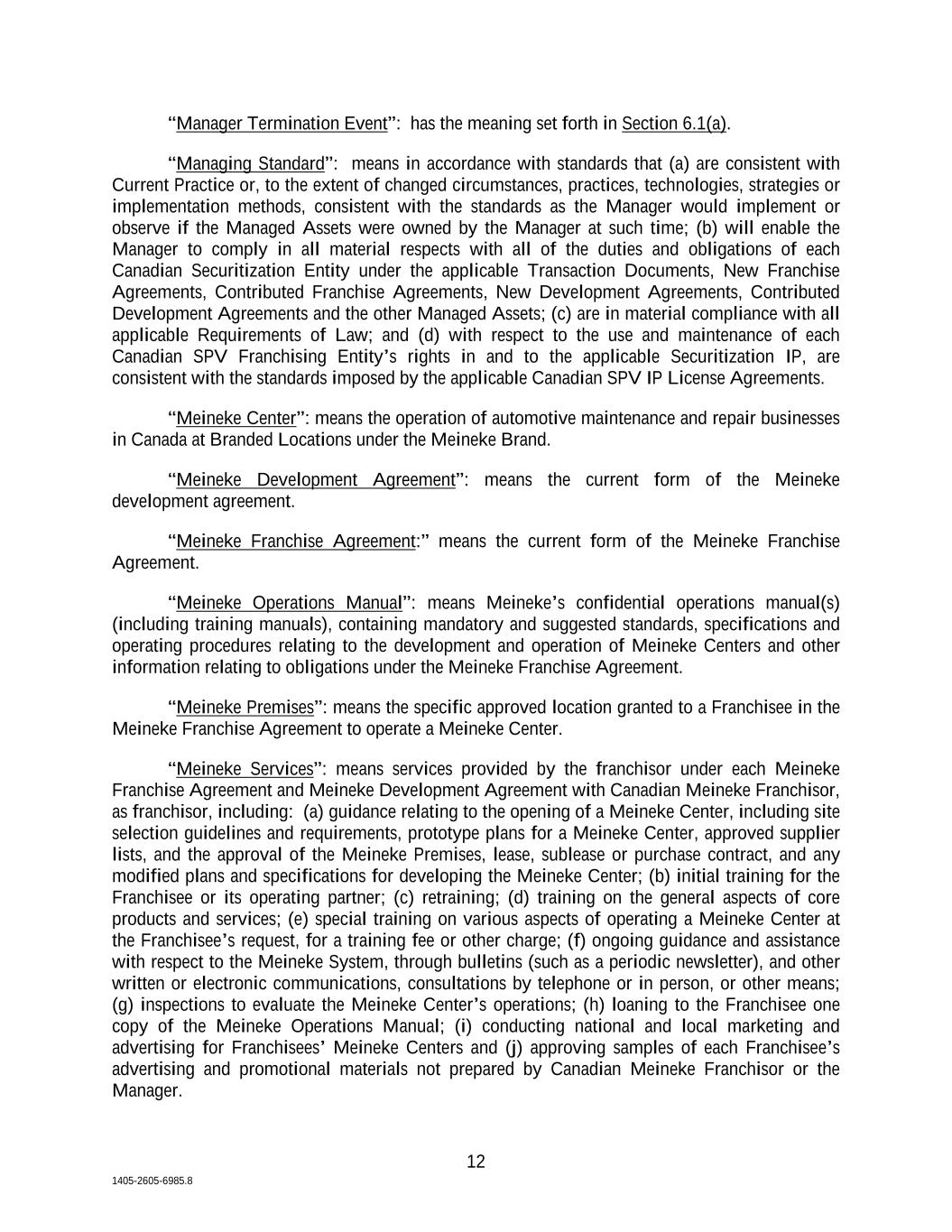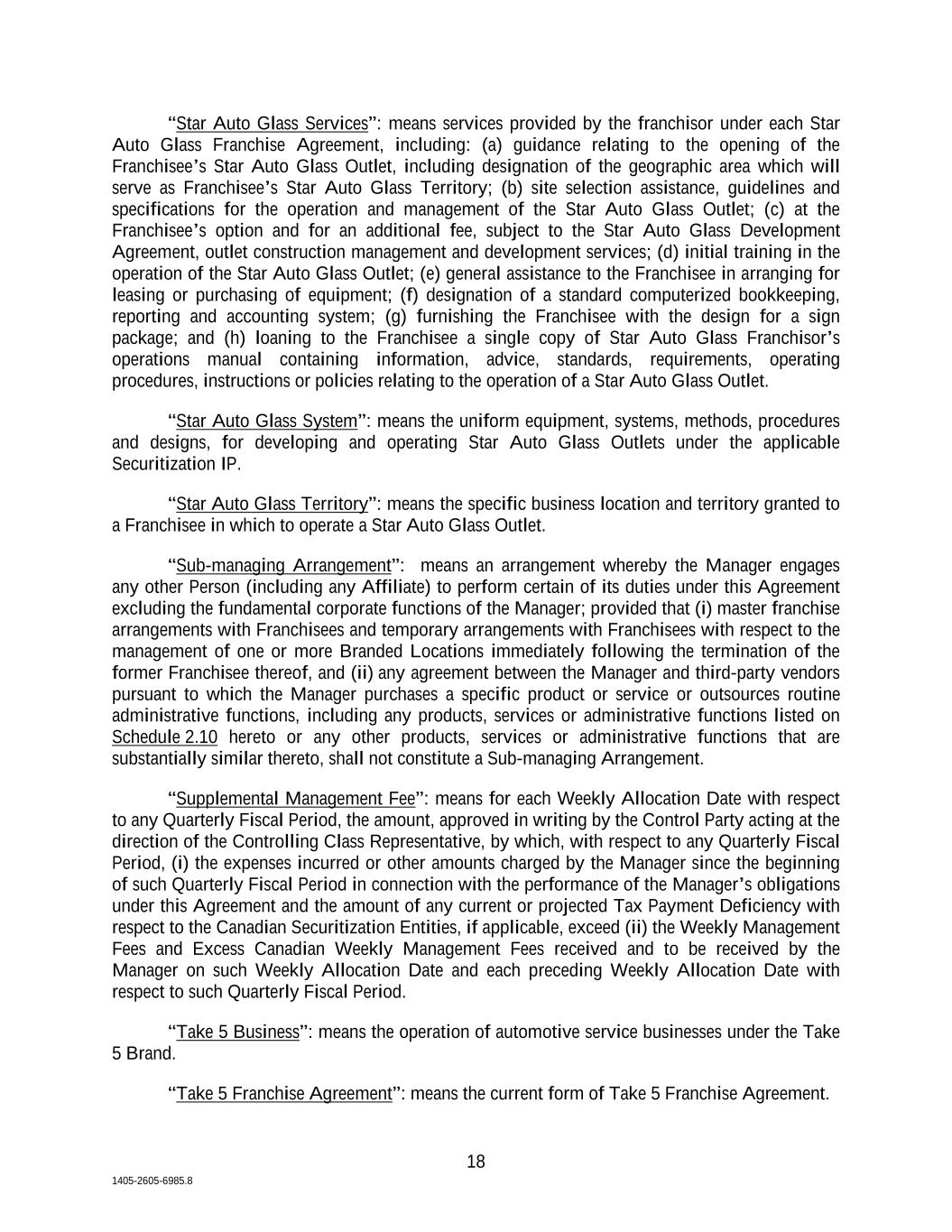 A-17 “Canadian Maaco Franchisor GP” means Maaco Canada SPV GP Corporation, a special purpose Canadian corporation and a direct, wholly-owned subsidiary of the Canadian Co-Issuer, and the general partner of Canadian Maaco Franchisor. “Canadian Management Agreement” means the Amended and Restated Management Agreement, dated as of the Series 2025-1 Closing Date, by and among the Canadian Manager, the Canadian Securitization Entities and the Trustee, solely for the purposes of Section 2.15 thereof, Carstar Canada Partnership, as amended, amended and restated, supplemented or otherwise modified from time to time. “Canadian Manager” means Driven Brands Canada Shared Services Inc., as manager under the Canadian Management Agreement, and any successor thereto. “Canadian Meineke Franchisor” means Meineke Canada SPV LP, a special purpose Ontario limited partnership. “Canadian Meineke Franchisor GP” means Meineke Canada SPV GP Corporation, a special purpose Canadian corporation and a direct, wholly-owned subsidiary of the Canadian Co-Issuer, and the general partner of Canadian Meineke Franchisor. “Canadian Product Sourcing Business” means the Product Sourcing Business operated by one or more Canadian Securitization Entities (including, without limitation, Driven Canada Product Sourcing) as of the Series 2020-1 Closing Date and thereafter. “Canadian Residual Account” means an account maintained in the name of and for the benefit of the Canadian Co-Issuer, or any other Canadian Securitization Entity, to which the Canadian Residual Amount, or a portion thereof attributable to such other Canadian Securitization Entity, will be paid on each Weekly Allocation Date. The Canadian Residual Amount, and any amount on deposit therein, will not be pledged as Collateral. “Canadian Securitization Entity GPs” means Driven Canada Claims Management GP and, together with Canadian CARSTAR GP, Canadian Maaco Franchisor GP, Canadian Meineke Franchisor GP, Canadian Take 5 GP, Go! Glass Franchisor GP, Star Auto Glass Franchisor GP and Driven Canada Product Sourcing GP, for their respective limited partnerships. “Canadian Residual Amount” means, for any Weekly Allocation Date with respect to any Quarterly Fiscal Period, the amount, if any, by which the amount allocated to the Canadian Collection Account on such Weekly Allocation Date exceeds the sum of the amounts to be paid and/or allocated on such Weekly Allocation Date pursuant to priorities (i) through (xxviii) of the Priority of Payments. “Canadian Securitization Entities” means the Canadian Co-Issuer and the Canadian Guarantors and each Future Securitization Entity organized in Canada, or any province or territory thereof. “Canadian Shortfall Payment Amount” means, with respect to each Weekly Allocation Date or Quarterly Payment Date (or any other applicable date), any Shortfall Payment paid or allocated by the Canadian Co-Issuer. “Canadian Take 5” means Take 5 Canada SPV LP, a special purpose Ontario limited partnership. “Canadian Take 5 GP” means Take 5 Canada SPV GP Corporation, a special purpose Canadian corporation and a direct, wholly-owned subsidiary of the Canadian Co-Issuer, and the general partner of Canadian Take 5.