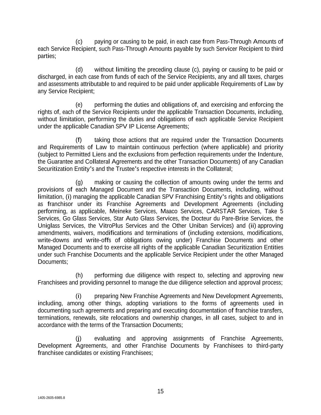 A-40 (including payment of lease obligations) in respect of Securitization-Owned Locations; (xvii) payments from fleet customers in respect of services performed by Franchisees, (xviii) any other amounts deposited into the Concentration Accounts that are not required to be deposited into the Collection Accounts; (xix) insurance company rebates and other fees and payments payable to Franchisees, locations owned by Non- Securitization Entities, Excluded Locations or third-parties in connection with insurance referrals and claims management; (xx) any portion of a supplier rebate required to be remitted to a Franchisee, Excluded Location, locations owned by Non-Securitization Entities or third-parties, (xxi) any costs and expenses associated with distribution margin or supplier rebates, (xxii) revenues (if any) that are due and payable to Governmental Authorities or other unaffiliated third parties as sales taxes and comparable taxes, payroll taxes, wage garnishments, lottery amounts or other amounts (the items set forth in clause (xxii) collectively, “Pass-Through Amounts”) and (xxiii) amounts that would constitute Retained Collections of the Canadian Co-Issuer with respect to an Excluded Location. “Excluded IP” means (i) any Software licensed to or on behalf of a Non-Securitization Entity and (ii) any proprietary software owned by a Non-Securitization Entity (other than the Contributed Software). “Excluded Location” means the following locations and businesses, together with their respective revenue and any account (and the amount on deposit therein) in which such revenue is collected and the related assets used in the operation of their respective businesses: (i) the company-owned locations for the Docteur du Pare-Brise Brand, the Uniglass Brand, the VitroPlus Brand and certain other Uniban Brands (and, in each case, any future company-owned locations for such Driven Securitization Brands acquired, opened or converted after the Series 2020-1 Closing Date) and (ii) the distribution center company-owned locations previously owned by Vitretech Inc. and 9404244 Canada Inc., respectively, immediately prior to the Series 2020-1 Closing Date and owned by the Canadian Co-Issuer in Canada on the Series 2020-1 Closing Date. “Excluded Operating Expenses” means any operating expenses comprised of Pass- Through Amounts excluded from any applicable determination of revenue, and, with respect to the Canadian Securitization Entities, Weekly Management Fees, Excess Canadian Weekly Management Fees and any lease or similar expenses to the extent payable pursuant to priority (xxvi) of the Priority of Payments. “Existing Local Securitization-Owned Location Accounts” has the meaning specified in Section 5.7(a)(ii) of the Base Indenture. “Extension Period” means, with respect to any Series or any Class of any Series of Notes, the period from the Series Anticipated Repayment Date (or any previously extended Series Anticipated Repayment Date) with respect to such Series or Class to the Series Anticipated Repayment Date with respect to such Series or Class as extended in connection with the provisions of the applicable Series Supplement. “FDIC” means the U.S. Federal Deposit Insurance Corporation. “Final Series Legal Final Maturity Date” means the Series Legal Final Maturity Date with respect to the last Series of Notes Outstanding. “Financial Assets” has the meaning set forth in Section 5.8(b) of the Base Indenture. “Financing Lease Obligations” of any person means, at the time any determination thereof is to be made, the amount of the liability in respect of a financing lease that would at such time be required to be capitalized and reflected as a liability on a balance sheet (excluding the footnotes thereto) in accordance with GAAP; provided that any liability of Parent and the Parent Consolidated Subsidiaries in