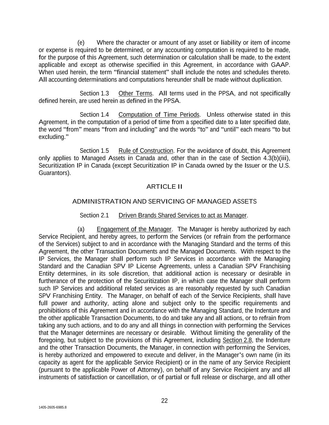2 Section 1.2 Cross-References. Unless otherwise specified, references in the Indenture and in each other Transaction Document to any Article or Section are references to such Article or Section of the Indenture or such other Transaction Document, as the case may be, and, unless otherwise specified, references in any Article, Section or definition to any clause are references to such clause of such Article, Section or definition. Section 1.3 Accounting and Financial Determinations; No Duplication. Where the character or amount of any asset or liability or item of income or expense is required to be determined, or any accounting computation is required to be made, for the purpose of the Indenture or any other Transaction Document, such determination or calculation shall be made, to the extent applicable and except as otherwise specified in the Indenture or such other Transaction Document, in accordance with GAAP. When used herein, the term “financial statement” shall include the notes and schedules thereto. All accounting determinations and computations hereunder or under any other Transaction Documents shall be made without duplication. Section 1.4 Rules of Construction. In the Indenture and the other Transaction Documents, unless the context otherwise requires: (a) the singular includes the plural and vice versa; (b) reference to any Person includes such Person’s successors and assigns but, if applicable, only if such successors and assigns are permitted by the Indenture and the other applicable Transaction Documents, as the case may be, and reference to any Person in a particular capacity only refers to such Person in such capacity; (c) reference to any gender includes the other gender; (d) reference to any Requirement of Law means such Requirement of Law as amended, modified, codified or reenacted, in whole or in part, and in effect from time to time; (e) “including” (and with correlative meaning “include”) means including without limiting the generality of any description preceding such term; (f) the word “or” is always used inclusively herein (for example, the phrase “A or B” means “A or B or both”, not “either A or B but not both”), unless used in an “either ... or” construction; (g) reference to any contract or agreement, including any Transaction Document, means such contract or agreement as amended, restated, amended and restated, supplemented or otherwise modified from time to time; (h) with respect to the determination of any period of time, except as otherwise specified, “from” means “from and including” and “to” means “to but excluding”; (i) without derogation of the joint and several liability of the Co-Issuers under the Indenture and unless the context otherwise requires, no reference to representations, warranties, covenants and agreements of the Canadian Co-Issuer, as to itself and the other Canadian Securitization Entities (as of the Series 2020-1 Closing Date), herein or any other Transaction Document shall be made as of, or from, respectively, any date prior to the Series 2020-1 Closing Date;