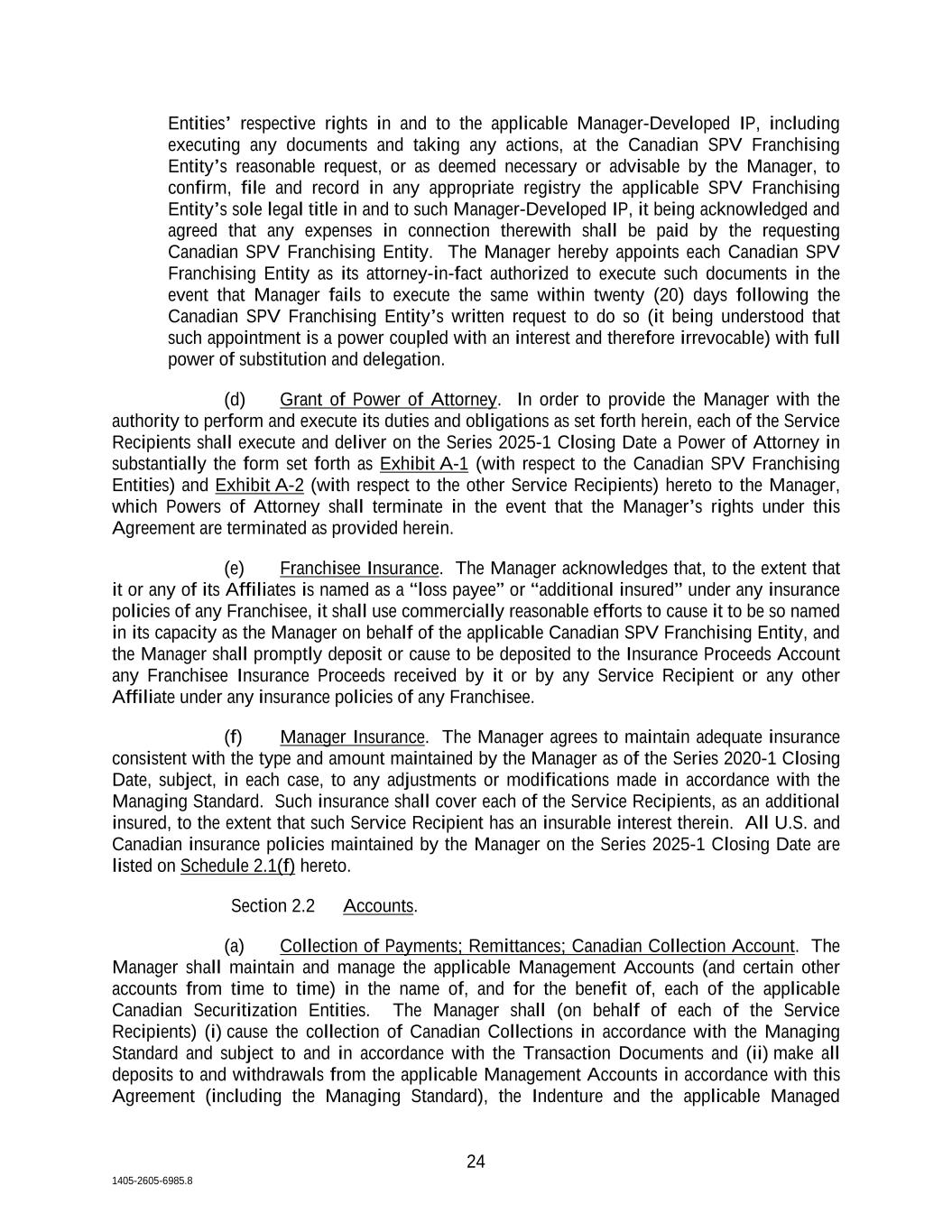 31 an Eligible Account, (B) pledged by the Issuer, the Canadian Co-Issuer, or such other Securitization Entity to the Trustee for the benefit of the Secured Parties pursuant to Section 3.1 or the applicable Guarantee and Collateral Agreement, and (C) if not established with the Trustee, subject to an Account Control Agreement. (b) Administration of the Management Accounts. The Issuer or the Canadian Co- Issuer (or the applicable Manager or Sub-Manager on its behalf) may invest any amounts held in the applicable Management Accounts in Eligible Investments, and such amounts may be transferred by the Issuer or the Canadian Co-Issuer (or the applicable Manager or Sub-Manager on its behalf), on behalf of itself or as such agent, as applicable, into an investment account for the sole purpose of investing in Eligible Investments so long as such investment account is (A) an Eligible Account, (B) pledged by the applicable Securitization Entity to the Trustee for the benefit of the Secured Parties pursuant to Section 3.1 or the applicable Guarantee and Collateral Agreement and (C) if not established with the Trustee, subject to an Account Control Agreement; provided that any such investment in any Management Account (or in any such investment account) shall mature not later than the Business Day prior to the next succeeding Weekly Calculation Date. Notwithstanding anything herein or in any other Transaction Document, no Co-Issuer or Manager shall transfer any funds into any such investment account pursuant to this Section 5.1(b) until such time as an Account Control Agreement is entered into with respect thereto (if such account is not established with the Trustee), it being agreed that the execution and delivery of such Account Control Agreement shall not be required as a condition precedent to the issuance of Notes on any Series Closing Date. All income or other gain from such Eligible Investments shall be credited to the related Management Account, and any loss resulting from such Eligible Investments shall be charged to the related Management Account (and the Issuer or Canadian Co-Issuer, or the other Securitization Entities, respectively). No Co-Issuer (or other Securitization Entity) shall direct (or permit) the disposal of any Eligible Investments prior to the maturity thereof if such disposal would result in a loss of any portion of the initial purchase price of such Eligible Investment. Prior to any Sub-Manager acting on behalf of any U.S. Securitization Entity or Canadian Securitization Entity, as applicable, in accordance with this Section, it will provide to the Trustee all applicable know-your-customer documentation required by the Trustee. (c) Earnings from the Management Accounts. All interest and earnings (net of losses and investment expenses) paid on funds on deposit in the Management Accounts shall be deemed to be Investment Income of the Issuer or Canadian Co-Issuer, or the other Canadian Securitization Entities, as applicable, for distribution to the applicable Collection Account in accordance with Section 5.10. (d) No Duty to Monitor. The Trustee shall have no duty or responsibility to monitor the amounts of deposits into or withdrawals from any Management Account. Section 5.2 Senior Notes Interest Reserve Accounts. (a) Establishment of the Senior Notes Interest Reserve Accounts. As of the Series 2015-1 Closing Date, the Issuer has established with the Trustee an account attributable to the Issuer (denominated in U.S. Dollars) in the name of the Issuer and subject to the lien of the Trustee for the benefit of the Senior Noteholders and the Trustee, solely in its capacity as trustee for the Senior Noteholders, bearing a designation clearly indicating that the funds deposited therein are held for the benefit of the foregoing Secured Parties (the “Issuer Interest Reserve Account for Senior Notes”). As of the Series 2020- 1 Closing Date, the Canadian Co-Issuer has established with the Trustee an account attributable to the Canadian Co-Issuer (denominated in U.S. Dollars) in the name of the Canadian Co-Issuer and subject to the lien of the Trustee for the benefit of the Senior Noteholders and the Trustee, solely in its capacity as trustee for the Senior Noteholders, bearing a designation clearly indicating that the funds deposited therein are held for the benefit of the foregoing Secured Parties (the “Canadian Co-Issuer Interest Reserve Account for Senior Notes” and together with the Issuer Interest Reserve Account for Senior Notes, the “Senior Notes Interest Reserve Accounts”). The Senior Notes Interest Reserve Accounts shall be Eligible Accounts.