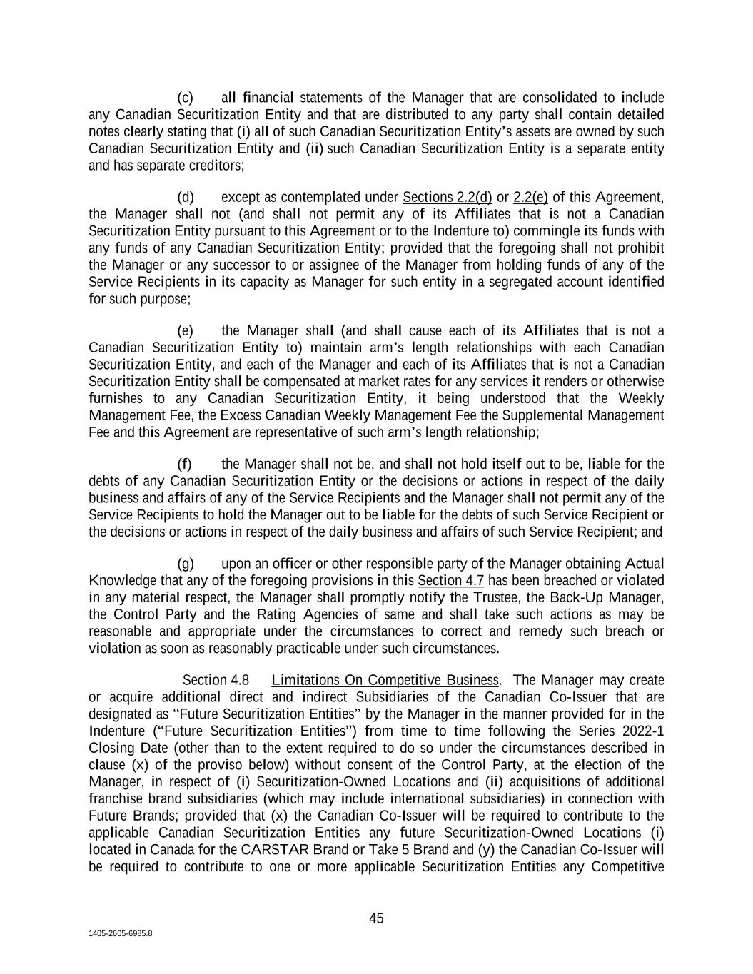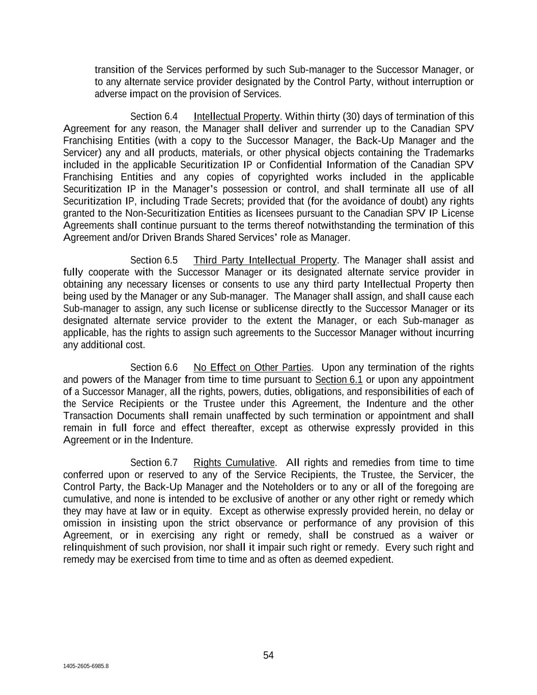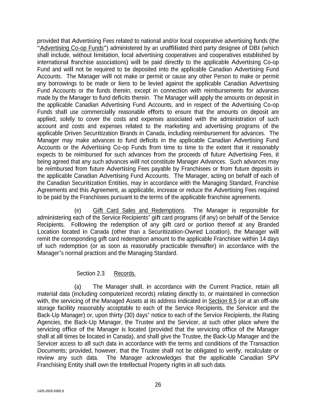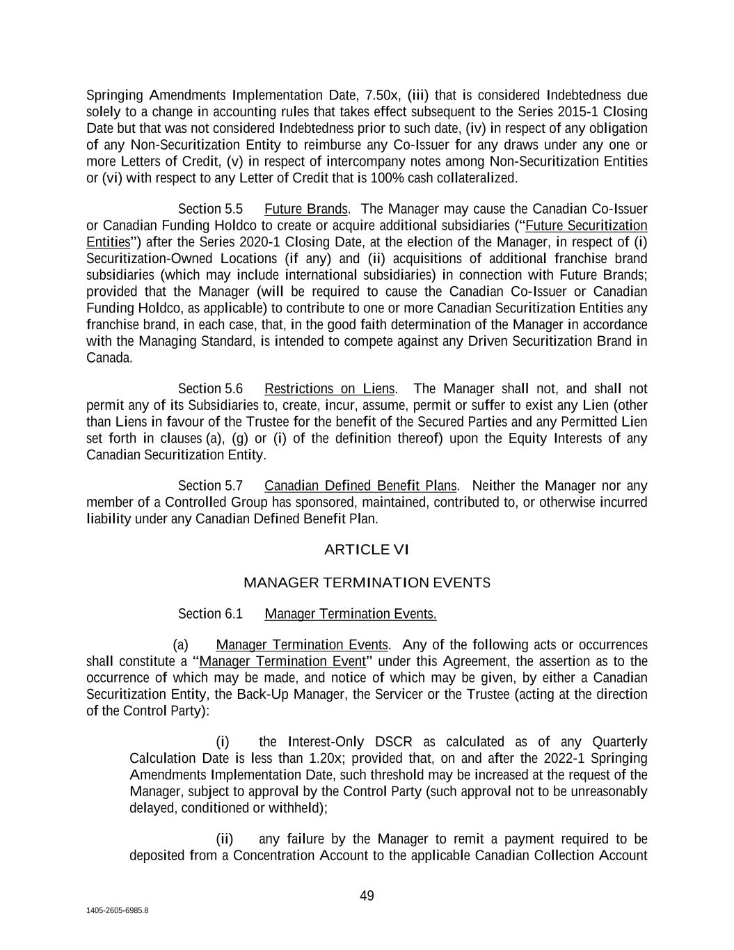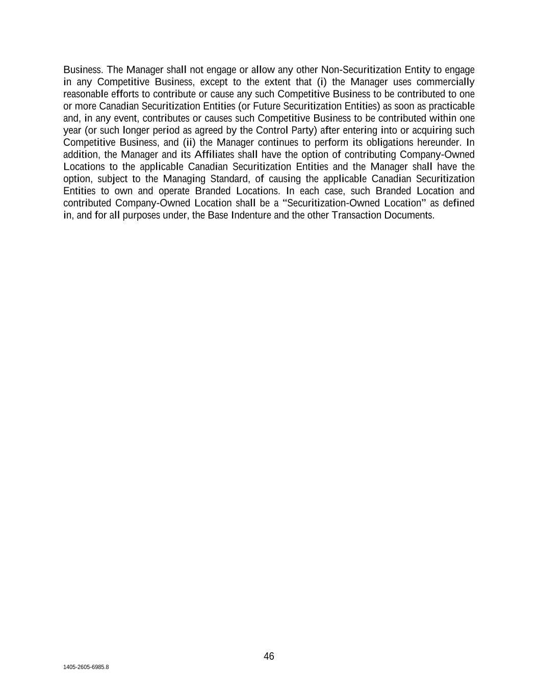 92 (c) For the avoidance of doubt, neither the Managers nor any of the Securitization Entities will be permitted to sell, transfer, lease, license, liquidate or otherwise dispose of any of the Driven Securitization Brands other than pursuant to a Permitted Brand Disposition. Section 8.17 Acquisition of Assets. The Co-Issuers will not, and will not permit any other Securitization Entity to, acquire, by long-term or operating lease or otherwise, any property (i) if such acquisition when effected on behalf of any Securitization Entity by the applicable Manager would constitute a breach by such Manager of the applicable Management Agreement or (ii) that is a lease, license or other contract or permit, if the grant of a lien or security interest in any of the applicable Securitization Entity’s right, title and interest in, to or under such lease, license, contract or permit in the manner contemplated by the Indenture and the Guarantee and Collateral Agreements (a) would be prohibited by the terms of such lease, license, contract or permit, (b) would constitute or result in the abandonment, invalidation or unenforceability of any right, title or interest of the applicable Securitization Entity therein or (c) would otherwise result in a breach thereof or the termination or a right of termination thereof, except to the extent that any such prohibition, breach, termination or right of termination is rendered ineffective pursuant to the UCC or PPSA or any other applicable law. Notwithstanding any language to the contrary in this Section 8.17, in the case of clause (ii) above, each Co-Issuer and each Securitization Entity will be in compliance with this Section 8.17, if each Issuer and each Securitization Entity uses commercially reasonable efforts to comply with clause (ii). Section 8.18 Dividends, Officers’ Compensation, etc.. The Issuer will not declare or pay any distributions on any of its limited liability company interests and the Canadian Co-Issuer will not declare or pay any distributions on any of its shares; provided that, in each case, so long as no Potential Rapid Amortization Event, Rapid Amortization Event, Default or Event of Default has occurred and is continuing with respect to any Series of Notes Outstanding or would result therefrom, the Co-Issuers may declare and pay distributions to the extent permitted under applicable law and their respective Charter Documents, including in respect of any Permitted Asset Disposition described in clause (xix) of the definition thereof and any amount on deposit in the Canadian Residual Account and any Residual Amount paid to the Issuer pursuant to the Priority of Payments. No Co-Issuer will, nor will it permit any other Securitization Entity that is a Subsidiary of such Co-Issuer to, pay any wages or salaries or other compensation to its officers, directors, managers or other agents except out of earnings computed in accordance with GAAP or except for the fees paid to its Independent Managers or to the extent required by the Canadian Management Agreement. The Co-Issuers will not, and will not permit any other Securitization Entity to, redeem, purchase, retire or otherwise acquire for value any Equity Interest in or issued by such Securitization Entity or set aside or otherwise segregate any amounts for any such purpose except as expressly permitted by the Indenture or as consented to by the Control Party. The Co-Issuers may draw on Class A-1 Note Commitments with respect to any Series of Class A-1 Notes for general corporate purposes of the Securitization Entities and the Non-Securitization Entities, including to fund any acquisition by any Securitization Entity or Non-Securitization Entity; provided that the Co-Issuers shall not draw on such Class A-1 Note Commitments to pay dividends on Parent shares or to repurchase Parent shares. Notwithstanding the foregoing, (a) each applicable Securitization Entity shall be permitted to make a distribution of any Large Franchisor Exemption Amount contributed to such Securitization Entity by any Non-Securitization Affiliate on or prior to any applicable Series Closing Date, or such other date of contribution, with respect to a Future Securitization Entity to such Non-Securitization Affiliate, (b) each U.S. Securitization Entity shall be permitted to make a distribution of any Tax Lien Reserve Amount to any other U.S. Securitization Entity or the direct parent of Funding Holdco solely to the extent permitted by, and in accordance with, Section 8.31(a) and (c) each Canadian Securitization Entity shall be permitted to