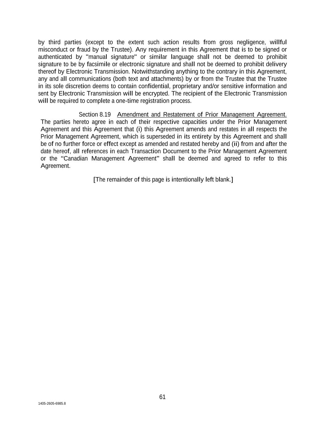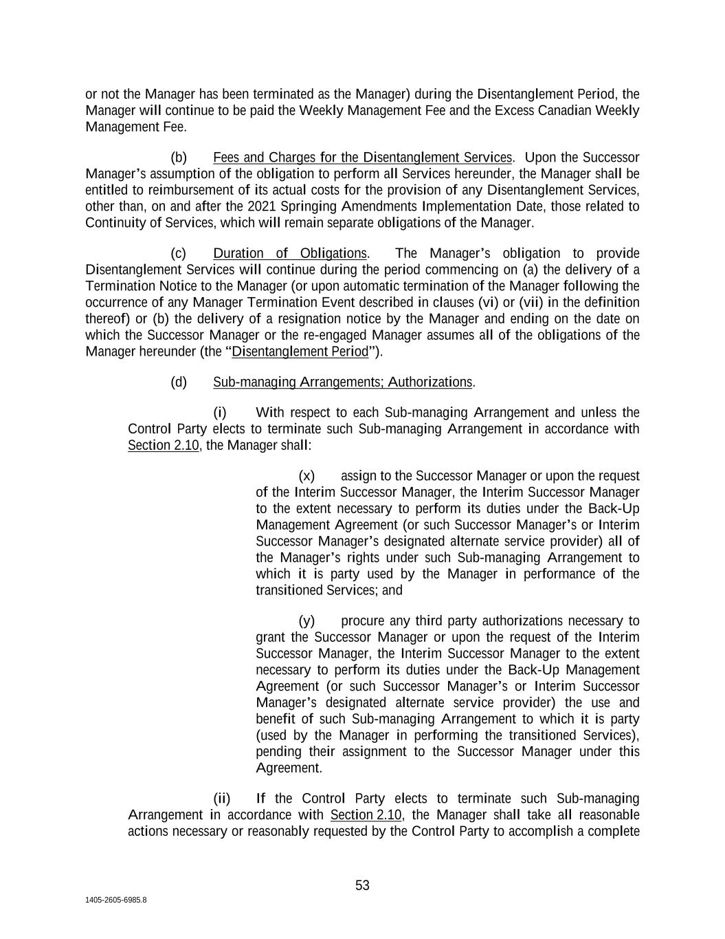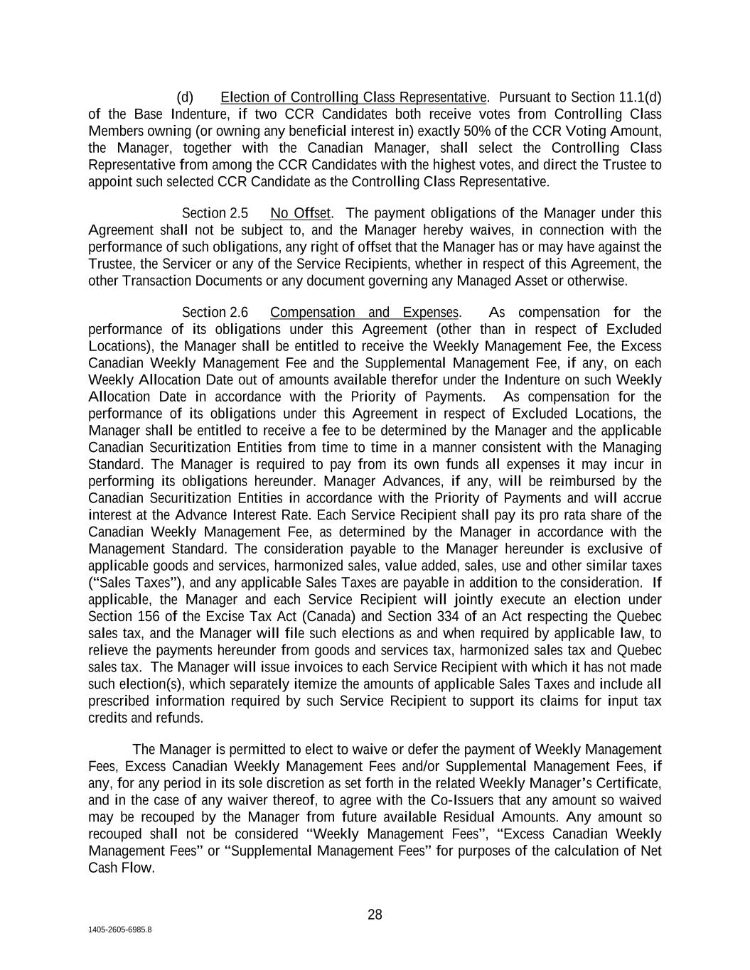 55 (ii) second, (A) from the U.S. Collection Accounts to reimburse the Trustee and, then, the Servicer, and, on and after the 2021 Springing Amendments Implementation Date, then, the Back-Up Manager, for any unreimbursed Advances (and accrued interest thereon at the Advance Interest Rate), then (B) from the U.S. Collection Accounts, to reimburse the U.S. Manager for any unreimbursed Manager Advances (and accrued interest thereon at the Advance Interest Rate) and from the Canadian Collection Accounts, to reimburse the Canadian Manager for any unreimbursed Manager Advances (and accrued interest thereon at the Advance Interest Rate), and then (C) from the U.S. Collection Accounts, to pay the Servicer all applicable Servicing Fees, Liquidation Fees and Workout Fees for such Weekly Allocation Date and, on and after the 2022 Springing Amendments Implementation Date, together with any previously accrued and unpaid Servicing Fees, Liquidation Fees and Workout Fees; (iii) third, from the U.S. Collection Accounts, to pay Successor Manager Transition Expenses, if any, to any Successor Manager of the U.S. Manager and any Interim Successor Manager of the U.S. Manager, and from the Canadian Collection Accounts, to pay any Successor Manager Transition Expenses, if any, to any Successor Manager of the Canadian Manager and the Interim Successor Manager of the Canadian Manager; (iv) fourth, from the U.S. Collection Accounts, to pay the portion of the Weekly Management Fee allocable to the U.S. Manager and, on and after the 2022 Springing Amendments Implementation Date, together with any previously accrued and unpaid Weekly Management Fee allocable to the U.S. Manager and from the Canadian Collection Accounts, to pay the portion of the Weekly Management Fee allocable to the Canadian Manager and on and after the 2022 Springing Amendments Implementation Date, together with any previously accrued and unpaid Weekly Management Fee allocable to the Canadian Manager; (v) fifth, (x) prior to the Amendment No. 4 Trigger Date, from the U.S. Collection Accounts, or Canadian Collection Accounts in respect of any Canadian Direct Payment Amount, pro rata, (A) to deposit to the applicable Securitization Operating Expense Account, an amount equal to any previously accrued and unpaid Securitization Operating Expenses together with any Securitization Operating Expenses that are expected to be payable prior to the immediately following Weekly Allocation Date, in an aggregate amount not to exceed the Capped Securitization Operating Expense Amount with respect to the annual period in which such Weekly Allocation Date occurs after giving effect to all deposits previously made to the applicable Securitization Operating Expense Account in such annual period, to be distributed pro rata based on the amount of each type of Securitization Operating Expense payable on such Weekly Allocation Date pursuant to this priority (v), and (B) so long as an Event of Default has occurred and is continuing, to the Trustee for payment of the Post- Default Capped Trustee Expenses Amount for such Weekly Allocation Date, and (y) on and after the Amendment No. 4 Trigger Date, from the U.S. Collection Accounts, or Canadian Collection Accounts in respect of any Canadian Direct Payment Amount, pro rata, to deposit to the applicable Securitization Operating Expense Account, an amount equal to any previously accrued and unpaid Securitization Operating Expenses together with any Securitization Operating Expenses that are expected to be payable prior to the immediately following Weekly Allocation Date, in an aggregate amount not to exceed the Capped Securitization Operating Expense Amount with respect to the annual period in which such Weekly Allocation Date occurs after giving effect to all deposits previously made to the applicable Securitization Operating Expense Account in such annual period, to be distributed pro rata based on the amount of each type of Securitization Operating Expense payable on such Weekly Allocation Date pursuant to this priority (v), provided, that the deposit to the Securitization Operating