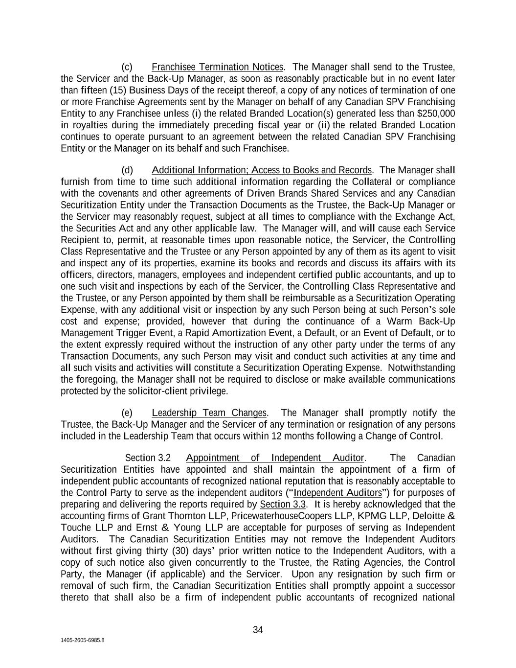 88 (e) Upon the occurrence of a Manager Termination Event under a Management Agreement, (i) the applicable Co-Issuer will not, nor will it permit any other applicable Service Recipient to, without the prior written consent of the Control Party, terminate the applicable Manager and appoint any Successor Manager in accordance with such Management Agreement and (ii) the applicable Co-Issuer will, and will cause each other applicable Service Recipient to, terminate the applicable Manager and appoint one or more Successor Managers in accordance with such Management Agreement if and when so directed by the Control Party. Section 8.8 Notice of Defaults and Other Events. Promptly (and in any event within two (2) Business Days) upon becoming aware of (i) any Potential Rapid Amortization Event, (ii) any Rapid Amortization Event, (iii) any Potential Manager Termination Event, (iv) any Manager Termination Event, (v) any Default, (vi) any Event of Default or (vii) any other default under any other Transaction Document, the applicable Co-Issuer shall give the Trustee, the Servicer, the Control Party, the Managers, the Back-Up Manager, the Controlling Class Representative and each Rating Agency with respect to each Series of Notes Outstanding notice thereof, together with an Officers’ Certificate setting forth the details thereof and any action with respect thereto taken or contemplated to be taken by the such Co-Issuer. The Co-Issuers shall, at their expense, promptly provide to the Servicer, the Managers, the Back-Up Manager, the Controlling Class Representative and the Trustee such additional information as the Servicer, the Managers, the Back-Up Manager, the Controlling Class Representative or the Trustee may reasonably request from time to time in connection with the matters so reported, and the actions so taken or contemplated to be taken. Section 8.9 Notice of Material Proceedings. Without limiting Section 8.27 or Section 8.25(b), promptly (and in any event within five (5) Business Days) upon the determination by either the Chief Financial Officer or the General Counsel of DBI that the commencement or existence of any litigation, arbitration or other proceeding with respect to any Driven Brands Entity would be reasonably likely to have a Material Adverse Effect, the Co-Issuers shall give written notice thereof to the Trustee, the Servicer, the Back-Up Manager and each Rating Agency. Section 8.10 Further Requests. The Co-Issuers will, and will cause each other Service Recipient to, promptly furnish to the Trustee such other information as, and in such form as, the Trustee may reasonably request in connection with the transactions contemplated hereby or by any Series Supplement. Section 8.11 Further Assurances. (a) Each Co-Issuer will, and will cause each other Securitization Entity to, do such further acts and things, and execute and deliver to the Trustee and the Servicer such additional assignments, agreements, powers and instruments, as are necessary or desirable to obtain or maintain the security interest of the Trustee in the Collateral on behalf of the Secured Parties as a perfected security interest subject to no prior Liens (other than Permitted Liens), to carry into effect the purposes of the Indenture or the other Transaction Documents or to better assure and confirm unto the Trustee, the Servicer, the Noteholders or the other Secured Parties their rights, powers and remedies hereunder including, without limitation, the filing of any financing statements, financing change statements, continuation statements or amendments or other instruments under the UCC or PPSA in effect in any jurisdiction with respect to the liens and security interests granted hereby and by the Guarantee and Collateral Agreements, except in each case as set forth on Schedule 8.11 and in each case subject to Section 8.25(c) or Section 8.25(d). Each Co-Issuer and the Guarantors intends the security interests granted pursuant to the Indenture and the Guarantee and Collateral Agreements in favor of the Secured Parties to be prior to all other Liens (other than Permitted Liens) in