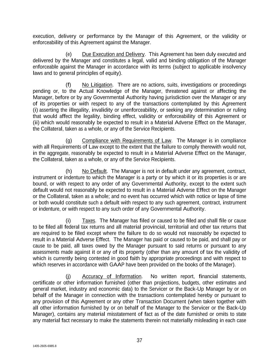 82 Section 7.14 Transaction Documents. The Indenture Documents, the Account Agreements, the Depository Agreements and the other Transaction Documents are in full force and effect. There are no outstanding defaults thereunder nor have events occurred which, with the giving of notice, the passage of time or both, would constitute a default thereunder. Section 7.15 Non-Existence of Other Agreements. Other than as permitted by Section 8.22, (a) no Securitization Entity is a party to any contract or agreement of any kind or nature and (b) no Securitization Entity is subject to any material obligations or liabilities of any kind or nature in favor of any third party, including, without limitation, Contingent Obligations. No U.S. Securitization Entity has engaged in any activities since its formation (other than those incidental to its formation, the authorization and the issuance of any Series of Notes, the execution of the Transaction Documents to which such Securitization Entity is a party and the performance of the activities referred to in or contemplated by such agreements). Section 7.16 Compliance with Contractual Obligations and Laws. No Service Recipient is in violation of (a) its Charter Documents, (b) any Requirement of Law with respect to such Service Recipient or (c) any Contractual Obligation with respect to such Service Recipient except, solely with respect to clauses (b) and (c), to the extent such violation could not reasonably be expected to result in a Material Adverse Effect. Section 7.17 Other Representations. All representations and warranties of each Service Recipient made in each Transaction Document to which it is a party are true and correct (i) if qualified as to materiality, in all respects and (ii) if not qualified as to materiality, in all material respects (unless stated to relate solely to an earlier date, in which case such representations and warranties were true and correct in all respects or in all material respects, as applicable, as of such earlier date), and are repeated herein as though fully set forth herein. Section 7.18 Insurance. The Securitization Entities maintain the insurance coverages (or self-insure for such risks) described on Schedule 7.18 hereto, in such amounts and covering such risks as is adequate for the conduct of their respective businesses and the value of their respective properties and as is customary for companies engaged in similar businesses in similar industries. All policies of insurance of the Securitization Entities are in full force and effect, and the Securitization Entities are in compliance with the terms of such policies in all material respects. None of the Securitization Entities has any reason to believe that it will not be able to renew its existing insurance coverage as and when such coverage expires or to obtain similar coverage from similar insurers as may be necessary to continue its business at a cost that would not reasonably be expected to have a Material Adverse Effect. All such insurance is primary coverage, all premiums therefor due on or before the date hereof have been paid in full, and the terms and conditions thereof are no less favorable to the Securitization Entities than the terms and conditions of insurance maintained by their Affiliates that are not Securitization Entities. Section 7.19 Environmental Matters. (a) None of the Service Recipients is subject to any liabilities or obligations pursuant to any Environmental Law or with respect to any Materials of Environmental Concern that could, individually or in the aggregate, reasonably be expected to have a Material Adverse Effect.
