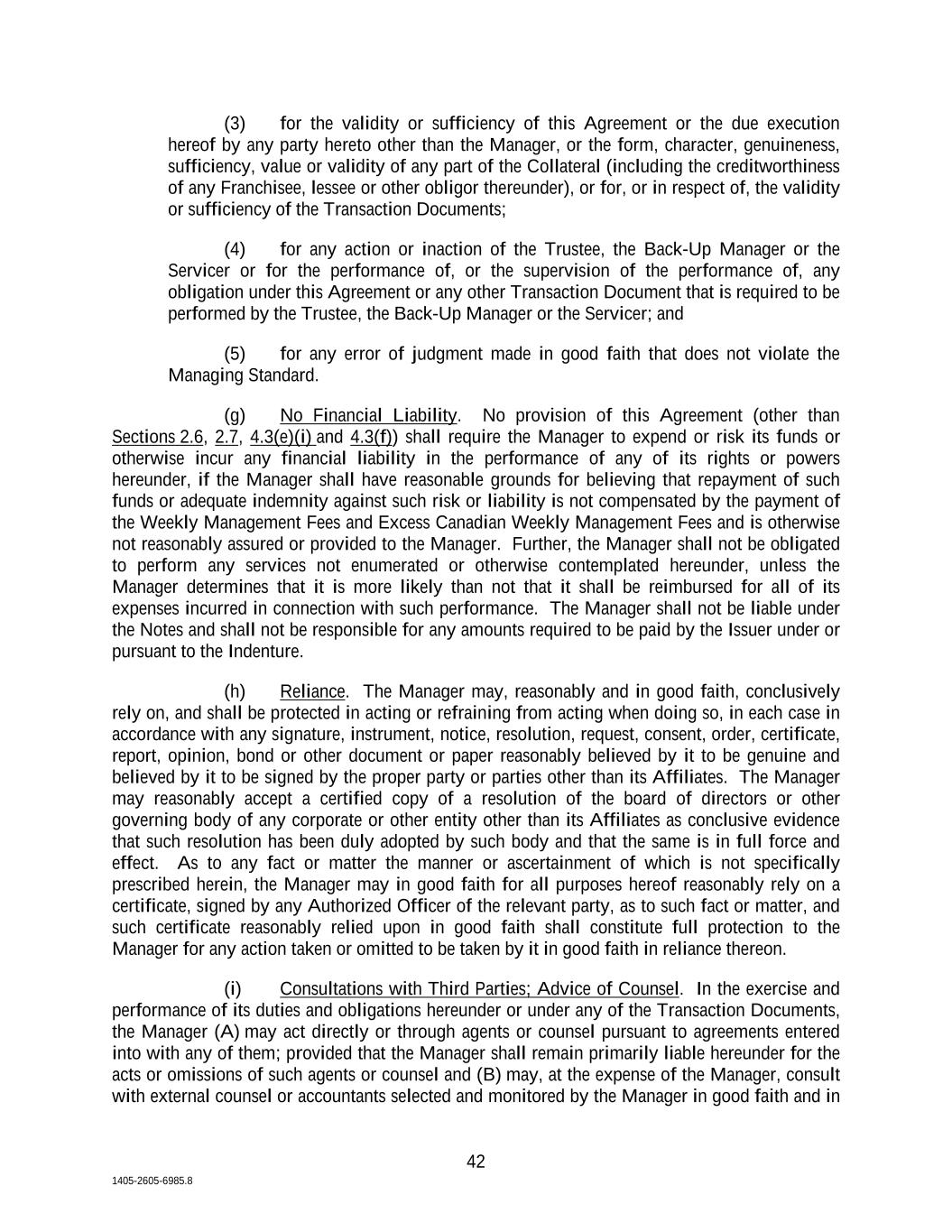 20 with respect to any Series of Notes, as otherwise stated in the applicable Series Supplement or in the applicable provisions of this Base Indenture). (c) The parties hereto agree and acknowledge that each certificated Equity Interest may be held by a custodian on behalf of the Trustee. (d) Each Co-Issuer confirms that value has been given by the Secured Parties to such Co-Issuer, that such Co-Issuer has rights in its Indenture Collateral existing at the date of this Base Indenture and that such Co-Issuer and the Trustee have not agreed to postpone the time for attachment of the security interests granted pursuant to Section 3.1(a) to any of the Indenture Collateral of such Co-Issuer. The security interests granted pursuant to Section 3.1(a) with respect to the Indenture Collateral of the Canadian Co- Issuer created by this Base Indenture shall have effect and be deemed to be effective whether or not the Obligations of the Canadian Co-Issuer or any part thereof are owing or in existence before or after or upon the date of this Base Indenture. Neither the execution and delivery of this Base Indenture nor the provision of any financial accommodation by any Secured Party shall oblige any Secured Party to make any financial accommodation or further financial accommodation available to the Canadian Co-Issuer or any other Person. Section 3.2 Certain Rights and Obligations of the Issuer Unaffected. (a) Notwithstanding the grant of the security interest in the Indenture Collateral hereunder to the Trustee, on behalf of the Secured Parties, each Co-Issuer acknowledges that the U.S. Manager, on behalf of the Issuer and the Service Recipients organized in the United States or any State thereof, and the Canadian Manager, on behalf of the Canadian Co-Issuer and the Service Recipients organized in Canada or any province or territory thereof, shall, subject to the terms and conditions of the applicable Management Agreement, nevertheless have the right, subject to the Trustee’s right to revoke such right, in whole or in part, in the event of the occurrence of an Event of Default, (i) to give, in accordance with the applicable Managing Standard, all consents, requests, notices, directions, approvals, extensions and waivers, if any, which are required or permitted to be given by such Co-Issuer under the Collateral Documents, and to enforce all rights, remedies, powers, privileges and claims of such Co-Issuer under the Collateral Documents, (ii) to give, in accordance with the applicable Managing Standard, all consents, requests, notices, directions and approvals, if any, which are required or permitted to be given by such Co- Issuer under any IP License Agreement to which such Co-Issuer is a party and (iii) to take any other actions required or permitted under the terms of the applicable Management Agreement. (b) The grant of the security interest by each Co-Issuer in the Indenture Collateral to the Trustee on behalf of the Secured Parties shall not (i) relieve such Co-Issuer from the performance of any term, covenant, condition or agreement on such Co-Issuer’s part to be performed or observed under or in connection with any of the Collateral Documents or (ii) impose any obligation on the Trustee or any of the other Secured Parties to perform or observe any such term, covenant, condition or agreement on such Co-Issuer’s part to be so performed or observed or impose any liability on the Trustee or any of the other Secured Parties for any act or omission on the part of such Co-Issuer or from any breach of any representation or warranty on the part of such Co-Issuer. (c) Each Co-Issuer hereby, jointly and severally, agrees to indemnify and hold harmless the Trustee and each other Secured Party (including their respective directors, officers, employees and agents) from and against any and all losses, liabilities (including liabilities for penalties), claims, demands, actions, suits, judgments, reasonable out-of-pocket costs and expenses arising out of or resulting from the security interest granted hereby, whether arising by virtue of any act or omission on the part of such Co-Issuer, the other Co-Issuer or otherwise, including, without limitation, the reasonable out-of-pocket costs, expenses and disbursements (including reasonable attorneys’ fees and expenses) incurred by the Trustee or any other Secured Party in enforcing the Indenture or any other Transaction Document or