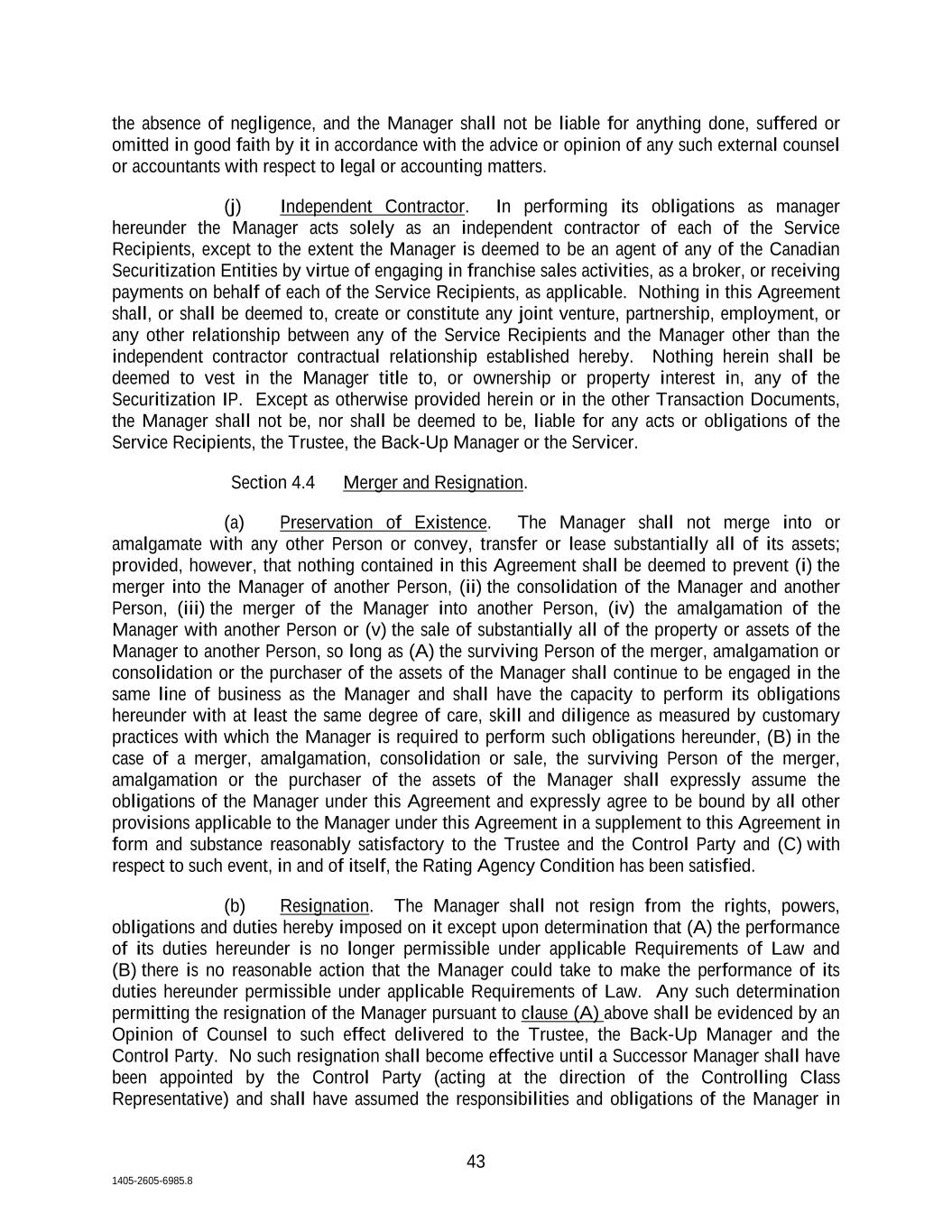 91 Section 8.15 Mergers. On and after the Series 2020-1 Closing Date, no Co-Issuers will, nor will it permit any other Securitization Entity to, merge, amalgamate or consolidate with or into any other Person (whether by means of a single transaction or a series of related transactions), other than (i) any merger or consolidation of any U.S. Securitization Entity with any other U.S. Securitization Entity or any other entity to which the Control Party has given prior written consent or (ii) any merger, amalgamation or consolidation (including a consolidation effected by a series of steps including a dissolution of a Canadian Securitization Entity into, or transfer of assets to, another Canadian Securitization Entity) of any Canadian Securitization Entity with any other Canadian Securitization Entity or any other entity to which the Control Party has given prior written consent. Section 8.16 Asset Dispositions. (a) No Co-Issuer will, nor will it permit any other applicable Securitization Entity to, sell, transfer, lease, license, liquidate or otherwise dispose of any of its property (whether by means of a single transaction or a series of related transactions), including any Equity Interests of any other applicable Securitization Entity, except in the case of (i) Permitted Asset Dispositions and (ii) Permitted Brand Dispositions. (b) In connection with any Permitted Brand Disposition, the applicable Securitization Entities (or the applicable Manager on their behalf) will deposit the related Release Price to the applicable Collection Account. The Release Price will be applied in accordance with priority (i) of the Priority of Payments, and any applicable Prepayment Consideration shall be due in connection with such mandatory prepayment. (i) The Canadian Co-Issuer will hold proceeds of any Permitted Brand Disposition attributable to another Canadian Securitization Entity as agent for such Canadian Securitization Entity until such proceeds are applied pursuant to the Priority of Payments or reinvested in Eligible Assets in accordance with Section 8.16(b). The Canadian Co-Issuer may enter into transactions with the other Canadian Securitization Entities to the extent permitted by Section 8.13, Section 8.18 and Section 8.21 to the extent necessary or helpful to give effect to the Priority of Payments (as determined by the Canadian Manager in accordance with the applicable Managing Standard) in order to acquire any such proceeds of any Permitted Brand Disposition. (ii) Immediately prior to any application of the Release Price in connection with any Permitted Brand Disposition in accordance with priority (i) of the Priority of Payments, the applicable Co-Issuer (or the Manager on its behalf) shall be permitted to disregard the requirements of the Priority of Payments and deem all or a portion of such amount as a payment of the Residual Amount to the Issuer or the Canadian Residual Account, as applicable, so long as (x) such Co-Issuer immediately thereafter uses such Residual Amount to make a loan to the other Co-Issuer in accordance with Section 8.13 with interest at a rate determined by the applicable Manager in accordance with the applicable Managing Standard, (y) after giving effect to such payment of such Residual Amount and such loan, the loaned amount is applied pursuant to the Priority of Payments by the Co-Issuers as if such loaned amount was Release Price payable by the recipient Co-Issuer in connection with such Permitted Brand Disposition and (z) the deemed payment of such Residual Amount is disregarded for purposes of the Weekly Manager’s Certificate.