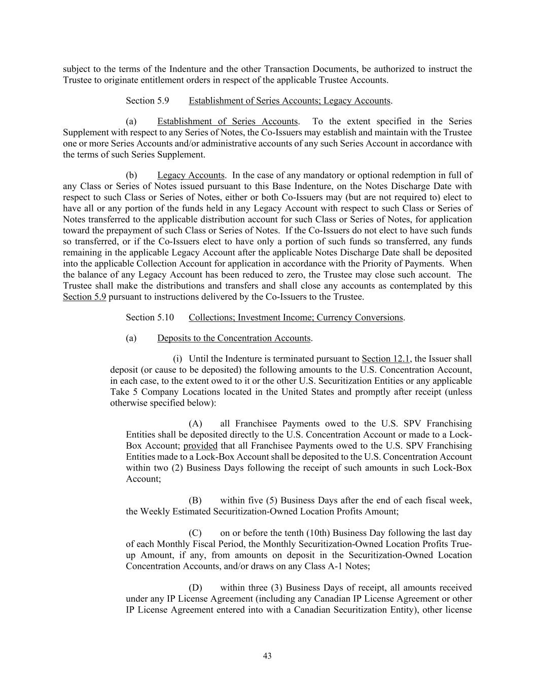 43 subject to the terms of the Indenture and the other Transaction Documents, be authorized to instruct the Trustee to originate entitlement orders in respect of the applicable Trustee Accounts. Section 5.9 Establishment of Series Accounts; Legacy Accounts. (a) Establishment of Series Accounts. To the extent specified in the Series Supplement with respect to any Series of Notes, the Co-Issuers may establish and maintain with the Trustee one or more Series Accounts and/or administrative accounts of any such Series Account in accordance with the terms of such Series Supplement. (b) Legacy Accounts. In the case of any mandatory or optional redemption in full of any Class or Series of Notes issued pursuant to this Base Indenture, on the Notes Discharge Date with respect to such Class or Series of Notes, either or both Co-Issuers may (but are not required to) elect to have all or any portion of the funds held in any Legacy Account with respect to such Class or Series of Notes transferred to the applicable distribution account for such Class or Series of Notes, for application toward the prepayment of such Class or Series of Notes. If the Co-Issuers do not elect to have such funds so transferred, or if the Co-Issuers elect to have only a portion of such funds so transferred, any funds remaining in the applicable Legacy Account after the applicable Notes Discharge Date shall be deposited into the applicable Collection Account for application in accordance with the Priority of Payments. When the balance of any Legacy Account has been reduced to zero, the Trustee may close such account. The Trustee shall make the distributions and transfers and shall close any accounts as contemplated by this Section 5.9 pursuant to instructions delivered by the Co-Issuers to the Trustee. Section 5.10 Collections; Investment Income; Currency Conversions. (a) Deposits to the Concentration Accounts. (i) Until the Indenture is terminated pursuant to Section 12.1, the Issuer shall deposit (or cause to be deposited) the following amounts to the U.S. Concentration Account, in each case, to the extent owed to it or the other U.S. Securitization Entities or any applicable Take 5 Company Locations located in the United States and promptly after receipt (unless otherwise specified below): (A) all Franchisee Payments owed to the U.S. SPV Franchising Entities shall be deposited directly to the U.S. Concentration Account or made to a Lock- Box Account; provided that all Franchisee Payments owed to the U.S. SPV Franchising Entities made to a Lock-Box Account shall be deposited to the U.S. Concentration Account within two (2) Business Days following the receipt of such amounts in such Lock-Box Account; (B) within five (5) Business Days after the end of each fiscal week, the Weekly Estimated Securitization-Owned Location Profits Amount; (C) on or before the tenth (10th) Business Day following the last day of each Monthly Fiscal Period, the Monthly Securitization-Owned Location Profits True- up Amount, if any, from amounts on deposit in the Securitization-Owned Location Concentration Accounts, and/or draws on any Class A-1 Notes; (D) within three (3) Business Days of receipt, all amounts received under any IP License Agreement (including any Canadian IP License Agreement or other IP License Agreement entered into with a Canadian Securitization Entity), other license