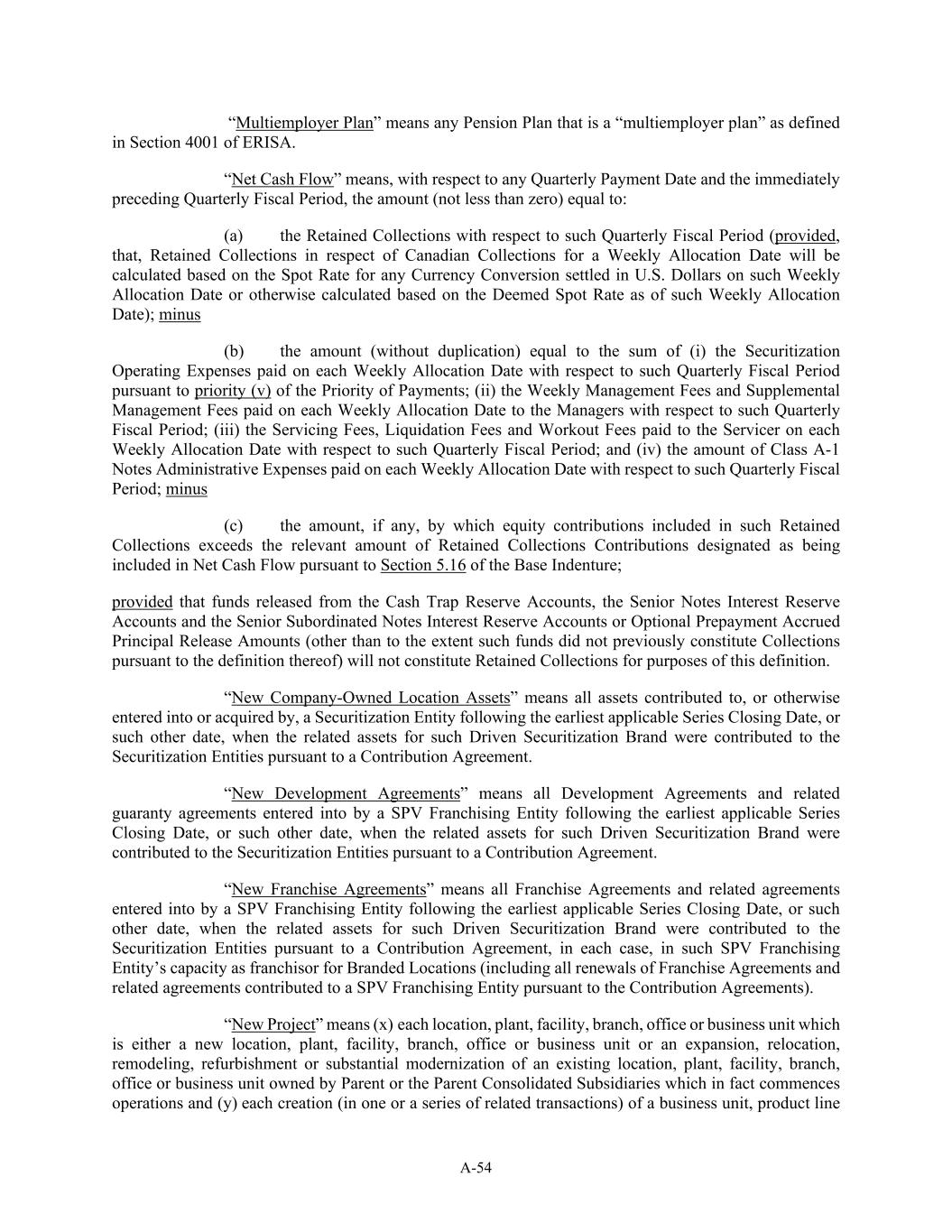 A-54 “Multiemployer Plan” means any Pension Plan that is a “multiemployer plan” as defined in Section 4001 of ERISA. “Net Cash Flow” means, with respect to any Quarterly Payment Date and the immediately preceding Quarterly Fiscal Period, the amount (not less than zero) equal to: (a) the Retained Collections with respect to such Quarterly Fiscal Period (provided, that, Retained Collections in respect of Canadian Collections for a Weekly Allocation Date will be calculated based on the Spot Rate for any Currency Conversion settled in U.S. Dollars on such Weekly Allocation Date or otherwise calculated based on the Deemed Spot Rate as of such Weekly Allocation Date); minus (b) the amount (without duplication) equal to the sum of (i) the Securitization Operating Expenses paid on each Weekly Allocation Date with respect to such Quarterly Fiscal Period pursuant to priority (v) of the Priority of Payments; (ii) the Weekly Management Fees and Supplemental Management Fees paid on each Weekly Allocation Date to the Managers with respect to such Quarterly Fiscal Period; (iii) the Servicing Fees, Liquidation Fees and Workout Fees paid to the Servicer on each Weekly Allocation Date with respect to such Quarterly Fiscal Period; and (iv) the amount of Class A-1 Notes Administrative Expenses paid on each Weekly Allocation Date with respect to such Quarterly Fiscal Period; minus (c) the amount, if any, by which equity contributions included in such Retained Collections exceeds the relevant amount of Retained Collections Contributions designated as being included in Net Cash Flow pursuant to Section 5.16 of the Base Indenture; provided that funds released from the Cash Trap Reserve Accounts, the Senior Notes Interest Reserve Accounts and the Senior Subordinated Notes Interest Reserve Accounts or Optional Prepayment Accrued Principal Release Amounts (other than to the extent such funds did not previously constitute Collections pursuant to the definition thereof) will not constitute Retained Collections for purposes of this definition. “New Company-Owned Location Assets” means all assets contributed to, or otherwise entered into or acquired by, a Securitization Entity following the earliest applicable Series Closing Date, or such other date, when the related assets for such Driven Securitization Brand were contributed to the Securitization Entities pursuant to a Contribution Agreement. “New Development Agreements” means all Development Agreements and related guaranty agreements entered into by a SPV Franchising Entity following the earliest applicable Series Closing Date, or such other date, when the related assets for such Driven Securitization Brand were contributed to the Securitization Entities pursuant to a Contribution Agreement. “New Franchise Agreements” means all Franchise Agreements and related agreements entered into by a SPV Franchising Entity following the earliest applicable Series Closing Date, or such other date, when the related assets for such Driven Securitization Brand were contributed to the Securitization Entities pursuant to a Contribution Agreement, in each case, in such SPV Franchising Entity’s capacity as franchisor for Branded Locations (including all renewals of Franchise Agreements and related agreements contributed to a SPV Franchising Entity pursuant to the Contribution Agreements). “New Project” means (x) each location, plant, facility, branch, office or business unit which is either a new location, plant, facility, branch, office or business unit or an expansion, relocation, remodeling, refurbishment or substantial modernization of an existing location, plant, facility, branch, office or business unit owned by Parent or the Parent Consolidated Subsidiaries which in fact commences operations and (y) each creation (in one or a series of related transactions) of a business unit, product line