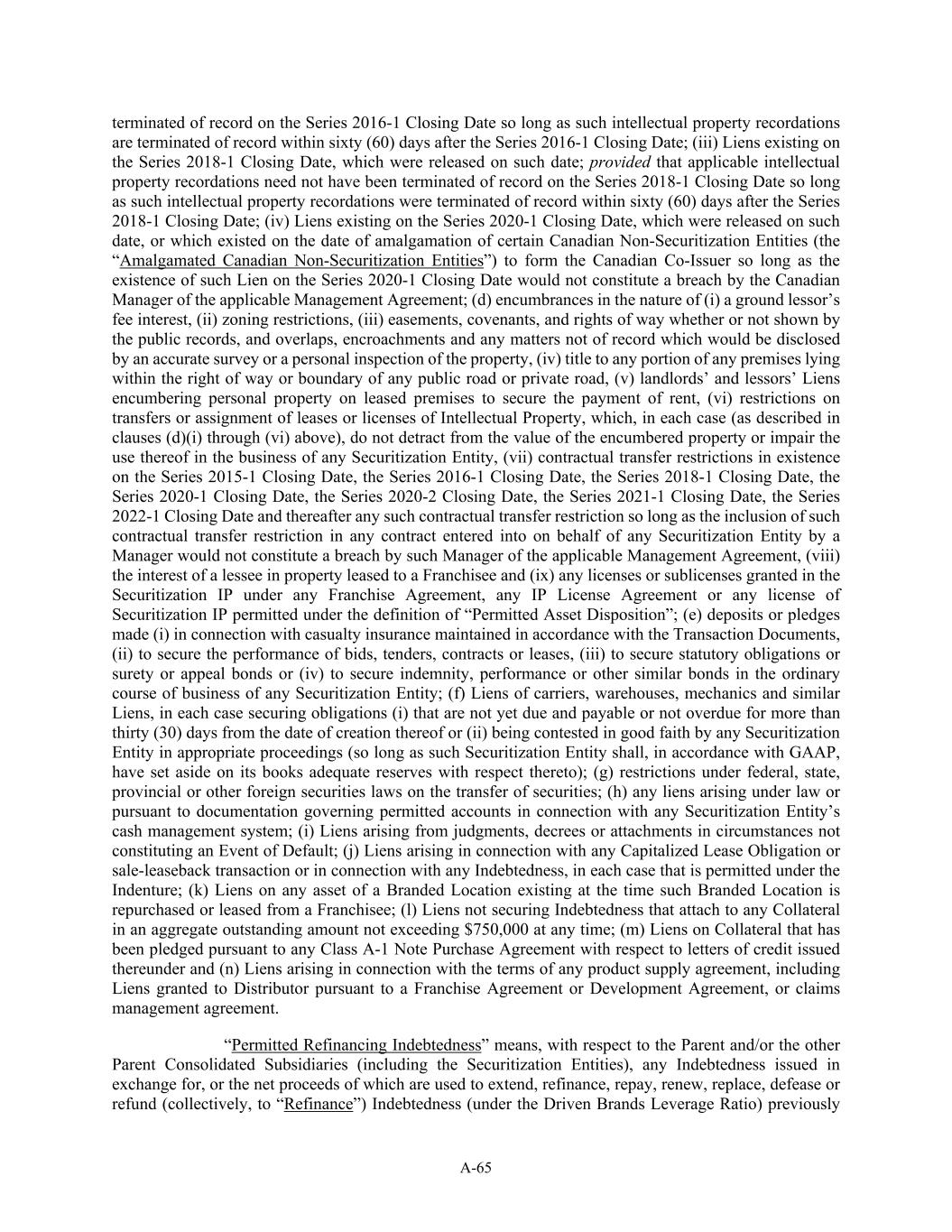 A-65 terminated of record on the Series 2016-1 Closing Date so long as such intellectual property recordations are terminated of record within sixty (60) days after the Series 2016-1 Closing Date; (iii) Liens existing on the Series 2018-1 Closing Date, which were released on such date; provided that applicable intellectual property recordations need not have been terminated of record on the Series 2018-1 Closing Date so long as such intellectual property recordations were terminated of record within sixty (60) days after the Series 2018-1 Closing Date; (iv) Liens existing on the Series 2020-1 Closing Date, which were released on such date, or which existed on the date of amalgamation of certain Canadian Non-Securitization Entities (the “Amalgamated Canadian Non-Securitization Entities”) to form the Canadian Co-Issuer so long as the existence of such Lien on the Series 2020-1 Closing Date would not constitute a breach by the Canadian Manager of the applicable Management Agreement; (d) encumbrances in the nature of (i) a ground lessor’s fee interest, (ii) zoning restrictions, (iii) easements, covenants, and rights of way whether or not shown by the public records, and overlaps, encroachments and any matters not of record which would be disclosed by an accurate survey or a personal inspection of the property, (iv) title to any portion of any premises lying within the right of way or boundary of any public road or private road, (v) landlords’ and lessors’ Liens encumbering personal property on leased premises to secure the payment of rent, (vi) restrictions on transfers or assignment of leases or licenses of Intellectual Property, which, in each case (as described in clauses (d)(i) through (vi) above), do not detract from the value of the encumbered property or impair the use thereof in the business of any Securitization Entity, (vii) contractual transfer restrictions in existence on the Series 2015-1 Closing Date, the Series 2016-1 Closing Date, the Series 2018-1 Closing Date, the Series 2020-1 Closing Date, the Series 2020-2 Closing Date, the Series 2021-1 Closing Date, the Series 2022-1 Closing Date and thereafter any such contractual transfer restriction so long as the inclusion of such contractual transfer restriction in any contract entered into on behalf of any Securitization Entity by a Manager would not constitute a breach by such Manager of the applicable Management Agreement, (viii) the interest of a lessee in property leased to a Franchisee and (ix) any licenses or sublicenses granted in the Securitization IP under any Franchise Agreement, any IP License Agreement or any license of Securitization IP permitted under the definition of “Permitted Asset Disposition”; (e) deposits or pledges made (i) in connection with casualty insurance maintained in accordance with the Transaction Documents, (ii) to secure the performance of bids, tenders, contracts or leases, (iii) to secure statutory obligations or surety or appeal bonds or (iv) to secure indemnity, performance or other similar bonds in the ordinary course of business of any Securitization Entity; (f) Liens of carriers, warehouses, mechanics and similar Liens, in each case securing obligations (i) that are not yet due and payable or not overdue for more than thirty (30) days from the date of creation thereof or (ii) being contested in good faith by any Securitization Entity in appropriate proceedings (so long as such Securitization Entity shall, in accordance with GAAP, have set aside on its books adequate reserves with respect thereto); (g) restrictions under federal, state, provincial or other foreign securities laws on the transfer of securities; (h) any liens arising under law or pursuant to documentation governing permitted accounts in connection with any Securitization Entity’s cash management system; (i) Liens arising from judgments, decrees or attachments in circumstances not constituting an Event of Default; (j) Liens arising in connection with any Capitalized Lease Obligation or sale-leaseback transaction or in connection with any Indebtedness, in each case that is permitted under the Indenture; (k) Liens on any asset of a Branded Location existing at the time such Branded Location is repurchased or leased from a Franchisee; (l) Liens not securing Indebtedness that attach to any Collateral in an aggregate outstanding amount not exceeding $750,000 at any time; (m) Liens on Collateral that has been pledged pursuant to any Class A-1 Note Purchase Agreement with respect to letters of credit issued thereunder and (n) Liens arising in connection with the terms of any product supply agreement, including Liens granted to Distributor pursuant to a Franchise Agreement or Development Agreement, or claims management agreement. “Permitted Refinancing Indebtedness” means, with respect to the Parent and/or the other Parent Consolidated Subsidiaries (including the Securitization Entities), any Indebtedness issued in exchange for, or the net proceeds of which are used to extend, refinance, repay, renew, replace, defease or refund (collectively, to “Refinance”) Indebtedness (under the Driven Brands Leverage Ratio) previously