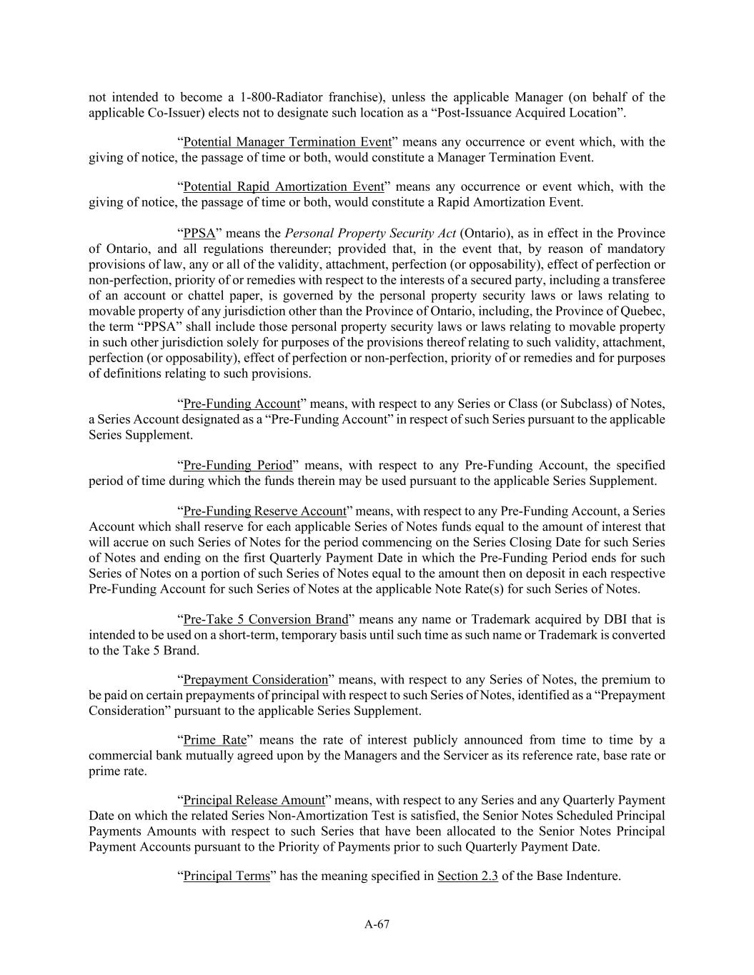 A-67 not intended to become a 1-800-Radiator franchise), unless the applicable Manager (on behalf of the applicable Co-Issuer) elects not to designate such location as a “Post-Issuance Acquired Location”. “Potential Manager Termination Event” means any occurrence or event which, with the giving of notice, the passage of time or both, would constitute a Manager Termination Event. “Potential Rapid Amortization Event” means any occurrence or event which, with the giving of notice, the passage of time or both, would constitute a Rapid Amortization Event. “PPSA” means the Personal Property Security Act (Ontario), as in effect in the Province of Ontario, and all regulations thereunder; provided that, in the event that, by reason of mandatory provisions of law, any or all of the validity, attachment, perfection (or opposability), effect of perfection or non-perfection, priority of or remedies with respect to the interests of a secured party, including a transferee of an account or chattel paper, is governed by the personal property security laws or laws relating to movable property of any jurisdiction other than the Province of Ontario, including, the Province of Quebec, the term “PPSA” shall include those personal property security laws or laws relating to movable property in such other jurisdiction solely for purposes of the provisions thereof relating to such validity, attachment, perfection (or opposability), effect of perfection or non-perfection, priority of or remedies and for purposes of definitions relating to such provisions. “Pre-Funding Account” means, with respect to any Series or Class (or Subclass) of Notes, a Series Account designated as a “Pre-Funding Account” in respect of such Series pursuant to the applicable Series Supplement. “Pre-Funding Period” means, with respect to any Pre-Funding Account, the specified period of time during which the funds therein may be used pursuant to the applicable Series Supplement. “Pre-Funding Reserve Account” means, with respect to any Pre-Funding Account, a Series Account which shall reserve for each applicable Series of Notes funds equal to the amount of interest that will accrue on such Series of Notes for the period commencing on the Series Closing Date for such Series of Notes and ending on the first Quarterly Payment Date in which the Pre-Funding Period ends for such Series of Notes on a portion of such Series of Notes equal to the amount then on deposit in each respective Pre-Funding Account for such Series of Notes at the applicable Note Rate(s) for such Series of Notes. “Pre-Take 5 Conversion Brand” means any name or Trademark acquired by DBI that is intended to be used on a short-term, temporary basis until such time as such name or Trademark is converted to the Take 5 Brand. “Prepayment Consideration” means, with respect to any Series of Notes, the premium to be paid on certain prepayments of principal with respect to such Series of Notes, identified as a “Prepayment Consideration” pursuant to the applicable Series Supplement. “Prime Rate” means the rate of interest publicly announced from time to time by a commercial bank mutually agreed upon by the Managers and the Servicer as its reference rate, base rate or prime rate. “Principal Release Amount” means, with respect to any Series and any Quarterly Payment Date on which the related Series Non-Amortization Test is satisfied, the Senior Notes Scheduled Principal Payments Amounts with respect to such Series that have been allocated to the Senior Notes Principal Payment Accounts pursuant to the Priority of Payments prior to such Quarterly Payment Date. “Principal Terms” has the meaning specified in Section 2.3 of the Base Indenture.