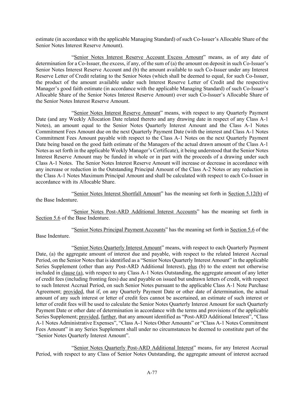 A-77 estimate (in accordance with the applicable Managing Standard) of such Co-Issuer’s Allocable Share of the Senior Notes Interest Reserve Amount). “Senior Notes Interest Reserve Account Excess Amount” means, as of any date of determination for a Co-Issuer, the excess, if any, of the sum of (a) the amount on deposit in such Co-Issuer’s Senior Notes Interest Reserve Account and (b) the amount available to such Co-Issuer under any Interest Reserve Letter of Credit relating to the Senior Notes (which shall be deemed to equal, for such Co-Issuer, the product of the amount available under such Interest Reserve Letter of Credit and the respective Manager’s good faith estimate (in accordance with the applicable Managing Standard) of such Co-Issuer’s Allocable Share of the Senior Notes Interest Reserve Amount) over such Co-Issuer’s Allocable Share of the Senior Notes Interest Reserve Amount. “Senior Notes Interest Reserve Amount” means, with respect to any Quarterly Payment Date (and any Weekly Allocation Date related thereto and any drawing date in respect of any Class A-1 Notes), an amount equal to the Senior Notes Quarterly Interest Amount and the Class A-1 Notes Commitment Fees Amount due on the next Quarterly Payment Date (with the interest and Class A-1 Notes Commitment Fees Amount payable with respect to the Class A-1 Notes on the next Quarterly Payment Date being based on the good faith estimate of the Managers of the actual drawn amount of the Class A-1 Notes as set forth in the applicable Weekly Manager’s Certificate), it being understood that the Senior Notes Interest Reserve Amount may be funded in whole or in part with the proceeds of a drawing under such Class A-1 Notes. The Senior Notes Interest Reserve Amount will increase or decrease in accordance with any increase or reduction in the Outstanding Principal Amount of the Class A-2 Notes or any reduction in the Class A-1 Notes Maximum Principal Amount and shall be calculated with respect to each Co-Issuer in accordance with its Allocable Share. “Senior Notes Interest Shortfall Amount” has the meaning set forth in Section 5.12(b) of the Base Indenture. “Senior Notes Post-ARD Additional Interest Accounts” has the meaning set forth in Section 5.6 of the Base Indenture. “Senior Notes Principal Payment Accounts” has the meaning set forth in Section 5.6 of the Base Indenture. “Senior Notes Quarterly Interest Amount” means, with respect to each Quarterly Payment Date, (a) the aggregate amount of interest due and payable, with respect to the related Interest Accrual Period, on the Senior Notes that is identified as a “Senior Notes Quarterly Interest Amount” in the applicable Series Supplement (other than any Post-ARD Additional Interest), plus (b) to the extent not otherwise included in clause (a), with respect to any Class A-1 Notes Outstanding, the aggregate amount of any letter of credit fees (including fronting fees) due and payable on issued but undrawn letters of credit, with respect to such Interest Accrual Period, on such Senior Notes pursuant to the applicable Class A-1 Note Purchase Agreement; provided, that if, on any Quarterly Payment Date or other date of determination, the actual amount of any such interest or letter of credit fees cannot be ascertained, an estimate of such interest or letter of credit fees will be used to calculate the Senior Notes Quarterly Interest Amount for such Quarterly Payment Date or other date of determination in accordance with the terms and provisions of the applicable Series Supplement; provided, further, that any amount identified as “Post-ARD Additional Interest”, “Class A-1 Notes Administrative Expenses”, “Class A-1 Notes Other Amounts” or “Class A-1 Notes Commitment Fees Amount” in any Series Supplement shall under no circumstances be deemed to constitute part of the “Senior Notes Quarterly Interest Amount”. “Senior Notes Quarterly Post-ARD Additional Interest” means, for any Interest Accrual Period, with respect to any Class of Senior Notes Outstanding, the aggregate amount of interest accrued