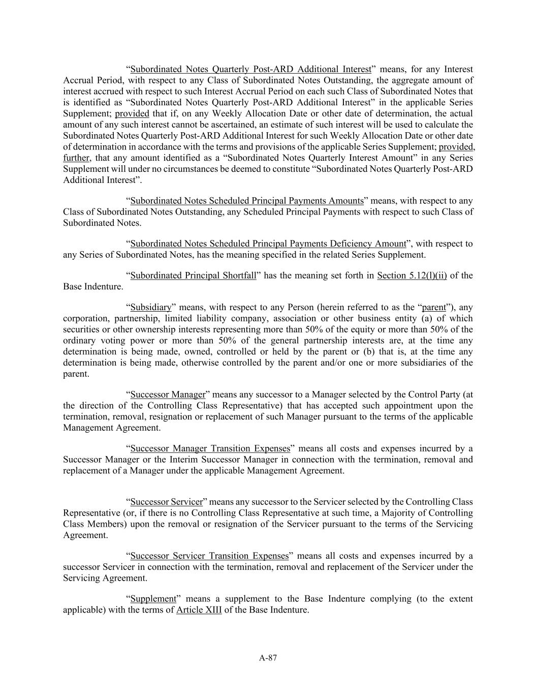 A-87 “Subordinated Notes Quarterly Post-ARD Additional Interest” means, for any Interest Accrual Period, with respect to any Class of Subordinated Notes Outstanding, the aggregate amount of interest accrued with respect to such Interest Accrual Period on each such Class of Subordinated Notes that is identified as “Subordinated Notes Quarterly Post-ARD Additional Interest” in the applicable Series Supplement; provided that if, on any Weekly Allocation Date or other date of determination, the actual amount of any such interest cannot be ascertained, an estimate of such interest will be used to calculate the Subordinated Notes Quarterly Post-ARD Additional Interest for such Weekly Allocation Date or other date of determination in accordance with the terms and provisions of the applicable Series Supplement; provided, further, that any amount identified as a “Subordinated Notes Quarterly Interest Amount” in any Series Supplement will under no circumstances be deemed to constitute “Subordinated Notes Quarterly Post-ARD Additional Interest”. “Subordinated Notes Scheduled Principal Payments Amounts” means, with respect to any Class of Subordinated Notes Outstanding, any Scheduled Principal Payments with respect to such Class of Subordinated Notes. “Subordinated Notes Scheduled Principal Payments Deficiency Amount”, with respect to any Series of Subordinated Notes, has the meaning specified in the related Series Supplement. “Subordinated Principal Shortfall” has the meaning set forth in Section 5.12(l)(ii) of the Base Indenture. “Subsidiary” means, with respect to any Person (herein referred to as the “parent”), any corporation, partnership, limited liability company, association or other business entity (a) of which securities or other ownership interests representing more than 50% of the equity or more than 50% of the ordinary voting power or more than 50% of the general partnership interests are, at the time any determination is being made, owned, controlled or held by the parent or (b) that is, at the time any determination is being made, otherwise controlled by the parent and/or one or more subsidiaries of the parent. “Successor Manager” means any successor to a Manager selected by the Control Party (at the direction of the Controlling Class Representative) that has accepted such appointment upon the termination, removal, resignation or replacement of such Manager pursuant to the terms of the applicable Management Agreement. “Successor Manager Transition Expenses” means all costs and expenses incurred by a Successor Manager or the Interim Successor Manager in connection with the termination, removal and replacement of a Manager under the applicable Management Agreement. “Successor Servicer” means any successor to the Servicer selected by the Controlling Class Representative (or, if there is no Controlling Class Representative at such time, a Majority of Controlling Class Members) upon the removal or resignation of the Servicer pursuant to the terms of the Servicing Agreement. “Successor Servicer Transition Expenses” means all costs and expenses incurred by a successor Servicer in connection with the termination, removal and replacement of the Servicer under the Servicing Agreement. “Supplement” means a supplement to the Base Indenture complying (to the extent applicable) with the terms of Article XIII of the Base Indenture.