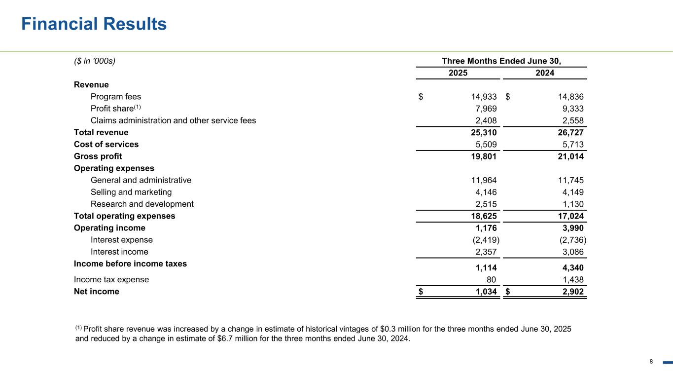 -2025 年第 2 四半期の総収益は、2024 年第 2 四半期の 2,670 万ドルに対し、2,530 万ドルであった。2025年第2四半期は、2024年第2四半期の670万ドルの減少に対し、過去のヴィンテージの事業に関連する推定利益分配収益が0.3百万ドル増加したことによる影響を受けた。
