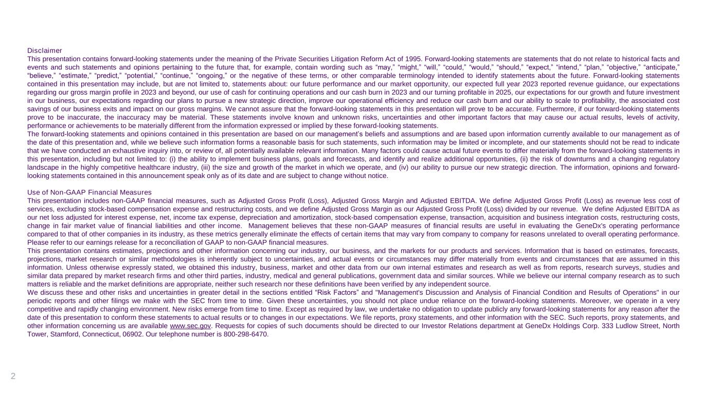 本日報告されたGeneDxのプロフォーマ業績には、Legacy GeneDxとLegacy Sema4のデータ・情報事業のみの統合が含まれ、2022年の全期間においてLegacy GeneDxが所有されていたと仮定している。継続事業には、現在廃止されているレガシーSema4の診断検査事業の収益と費用は含まれていない。