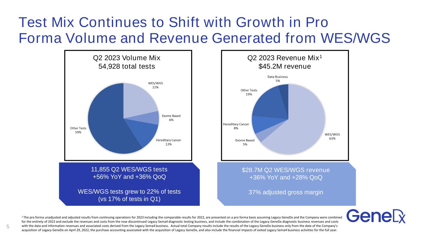 -収益:2023年第2四半期のプロフォーマ売上高は、2022年第2四半期の4,010万ドルに対し4,520万ドルで、前年同期比13%増となった。全エクソーム・ゲノム検査の売上は、2022年第2四半期の2,110万ドルに対し2,870万ドルで、前年同期比36%増、前四半期比28%増となった。