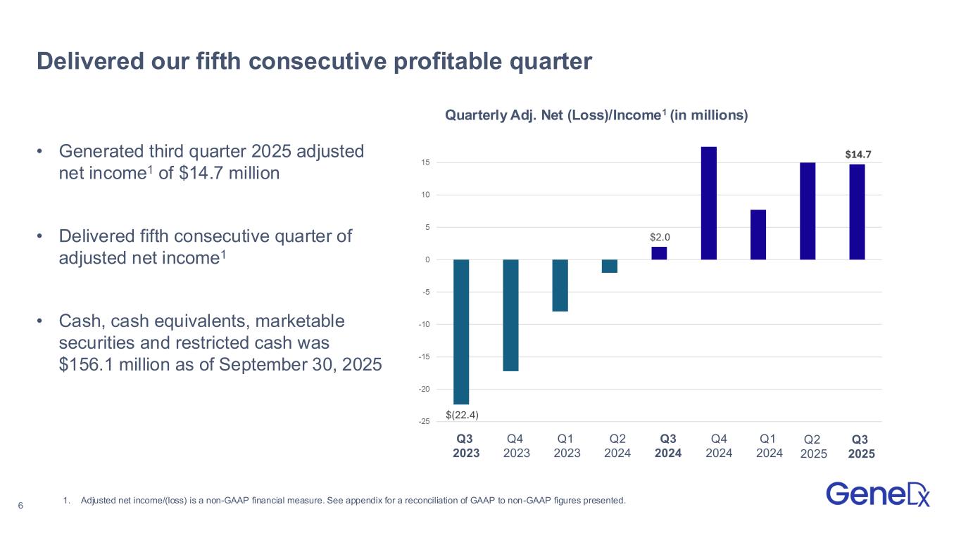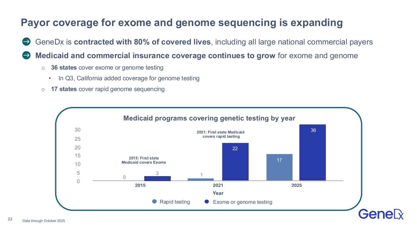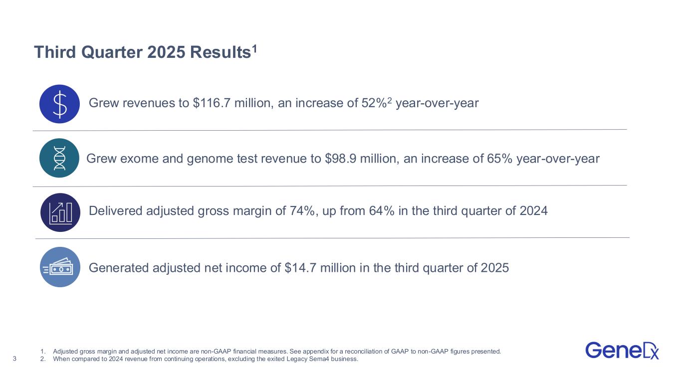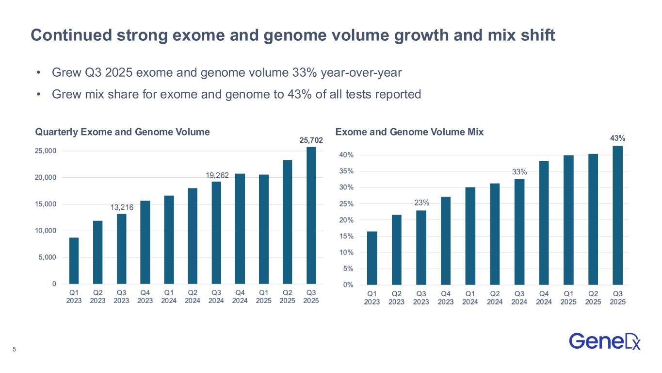 -2025年第3四半期の売上高は1億1670万ドルで、エクソームおよびゲノム検査の売上高は前年同期比65%の伸びを達成