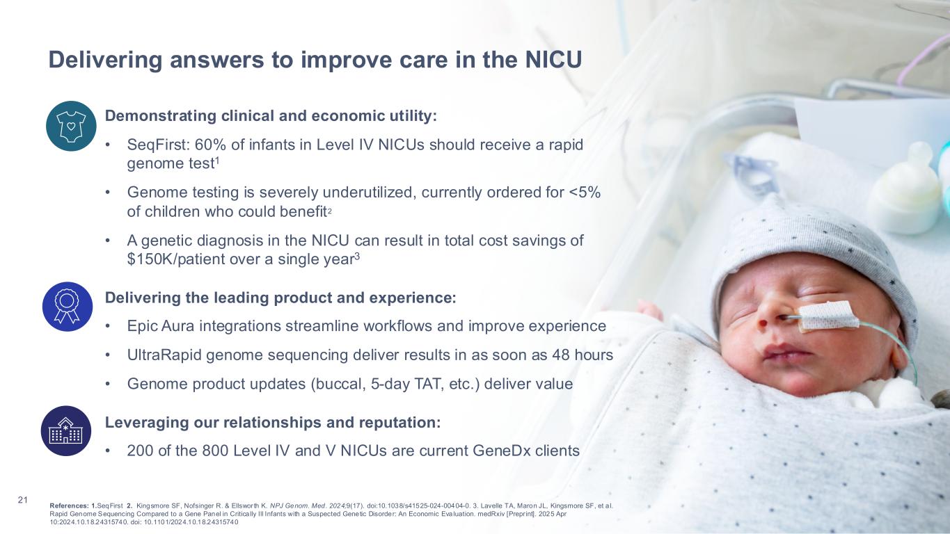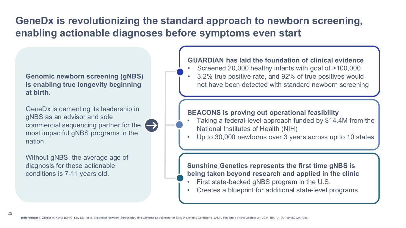 -NIH BEACONSイニシアチブおよびSunshine Genetics Networkを含む新しいgNBSプログラムの唯一の商業的検査プロバイダーとして、ゲノム新生児スクリーニング(gNBS)において全米をリードする。
