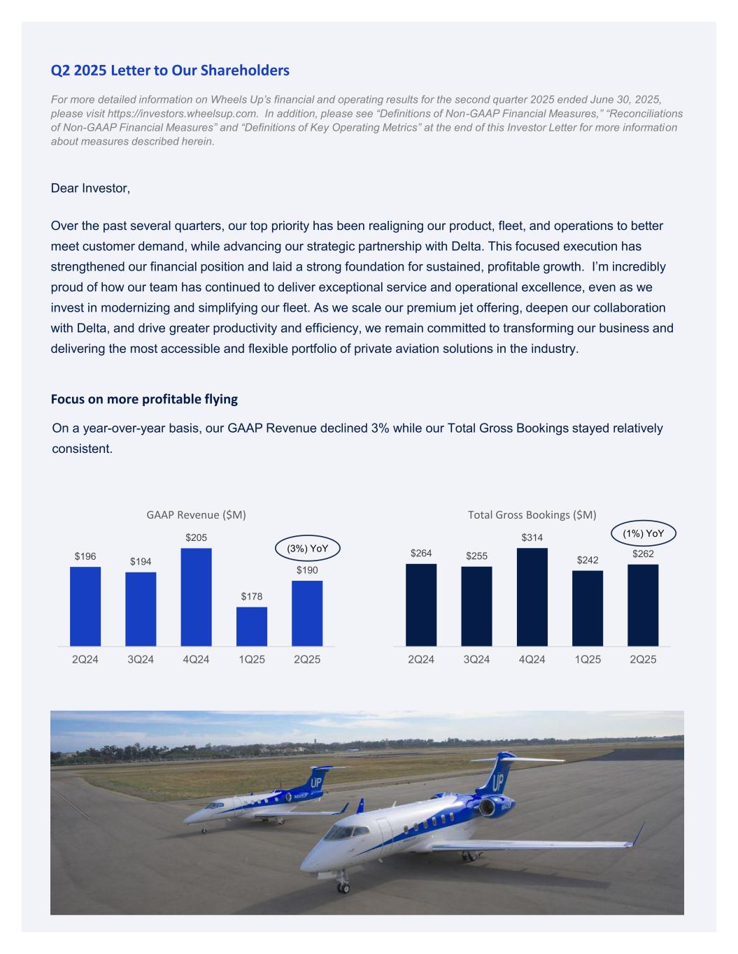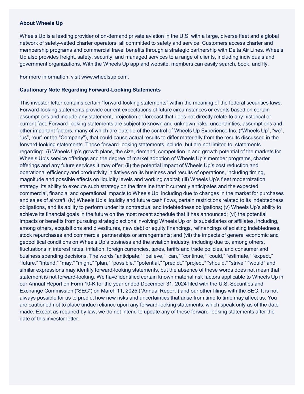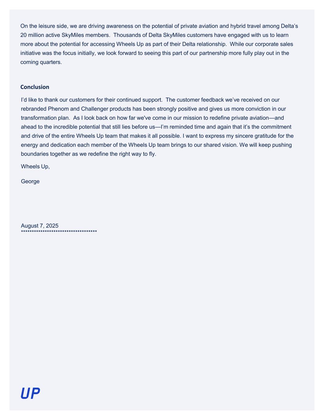 2025年6月30日に終了した第2四半期の財務および営業業績に関するウィールス・アップのジョージ・マトソン最高経営責任者のコメントは、ウィールス・アップの投資家向けウェブサイト(https://investors.wheelsup.com)に掲載されているインベスター・レターに掲載されている。
