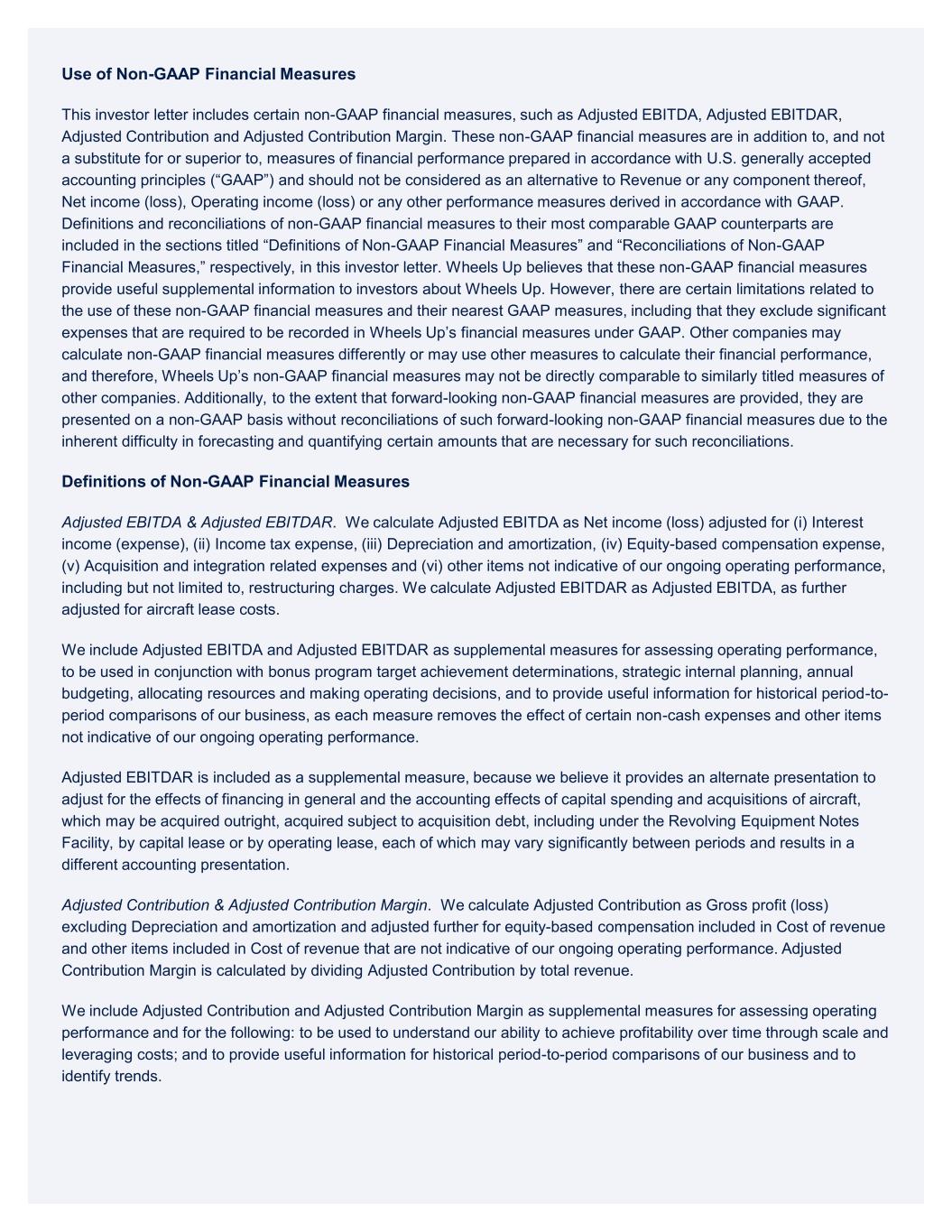 本プレスリリースには、調整後EBITDA、調整後EBITDAR、調整後貢献度、調整後貢献度マージンなど、特定の非GAAP財務指標が含まれています。これらの非GAAPベースの財務指標は、米国で一般に公正妥当と認められた会計原則(以下「GAAP」)に準拠して作成された財務業績の指標に追加されるものであり、これに代わるものでも優越するものでもなく、売上高またはその構成要素、純利益(損失)、営業利益(損失)、またはGAAPに準拠して算出されたその他の業績指標の代替とみなされるべきではありません。非GAAP財務指標の定義および最も比較可能なGAAP財務指標への調整は、本プレスリリースの「非GAAP財務指標の定義」および「非GAAP財務指標の調整」にそれぞれ記載されています。ホイール・アップは、これらの非GAAP財務指標がホイール・アップに関する有益な補足情報を投資家に提供すると考えている。ただし、これらの非GAAP財務指標およびそれに最も近いGAAP財務指標の使用には、GAAPに基づくホイール・アップの財務指標に計上が義務付けられている重要な費用を除外することを含め、一定の制限がある。他の企業は、非GAAP財務指標を異なる方法で計算する可能性があり、または財務実績を計算するために他の指標を使用する可能性があるため、Wheels Upの非GAAP財務指標は、他の企業の同様のタイトルを持つ財務指標と直接比較できない可能性がある。さらに、将来予想に関する非GAAP財務指標が提供される限りにおいて、そのような将来予想に関する非GAAP財務指標は、そのような調整に必要な特定の金額を予測および定量化することが本質的に困難であるため、調整なしで非GAAPベースで表示されます。