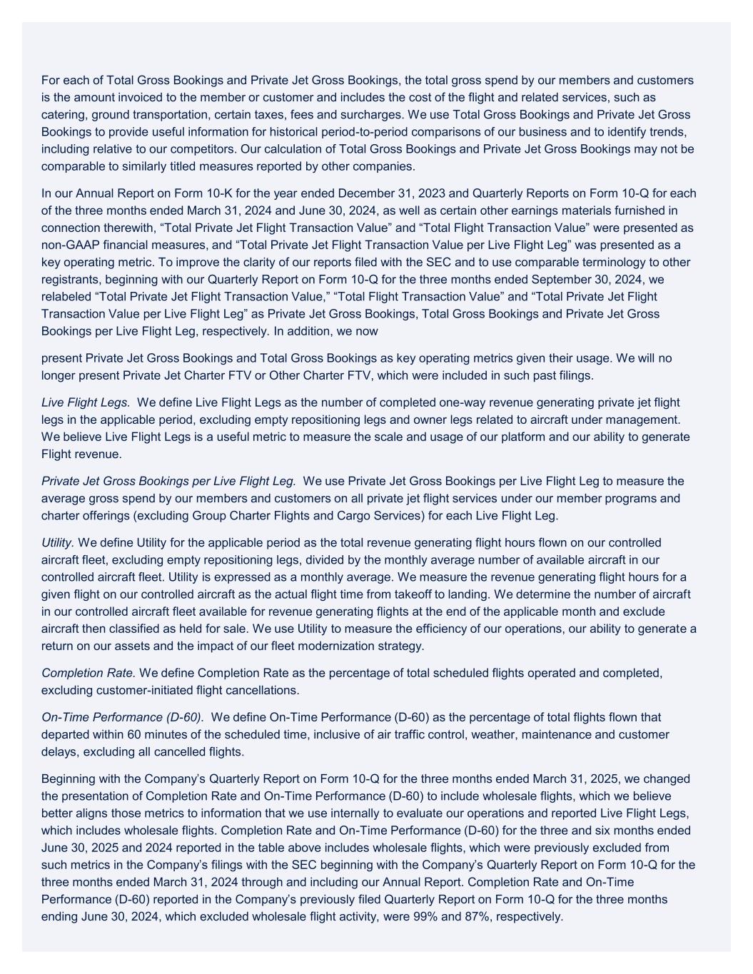 (2)2025年6月30日に終了した第1四半期において、当社の管理下にある航空機のうち、エンブラエル・フェノム300シリーズおよびボンバルディア・チャレンジャー300シリーズの利用時間はそれぞれ49時間および54時間でした。2024年6月30日に終了した第1四半期において、当社の管理機材にエンブラエル・フェノム300シリーズおよびボンバルディア・チャレンジャー300シリーズの航空機はありませんでした。