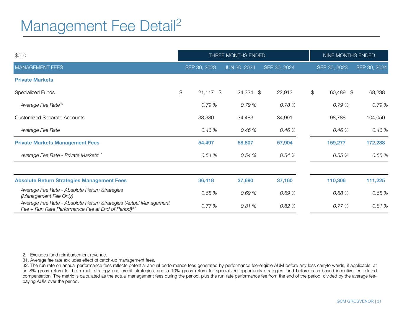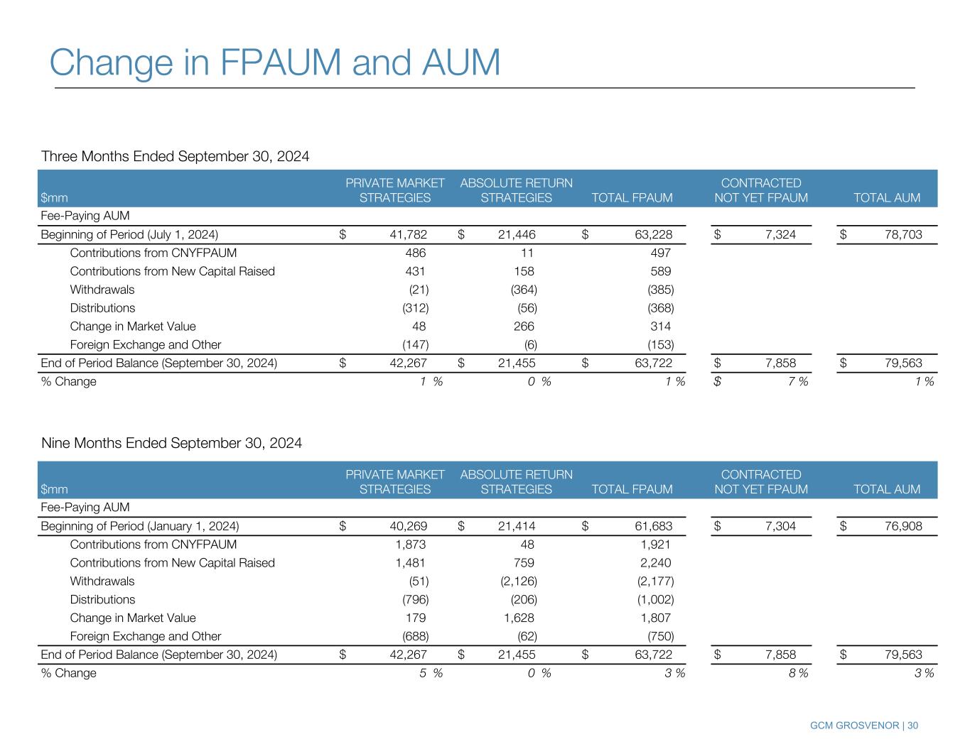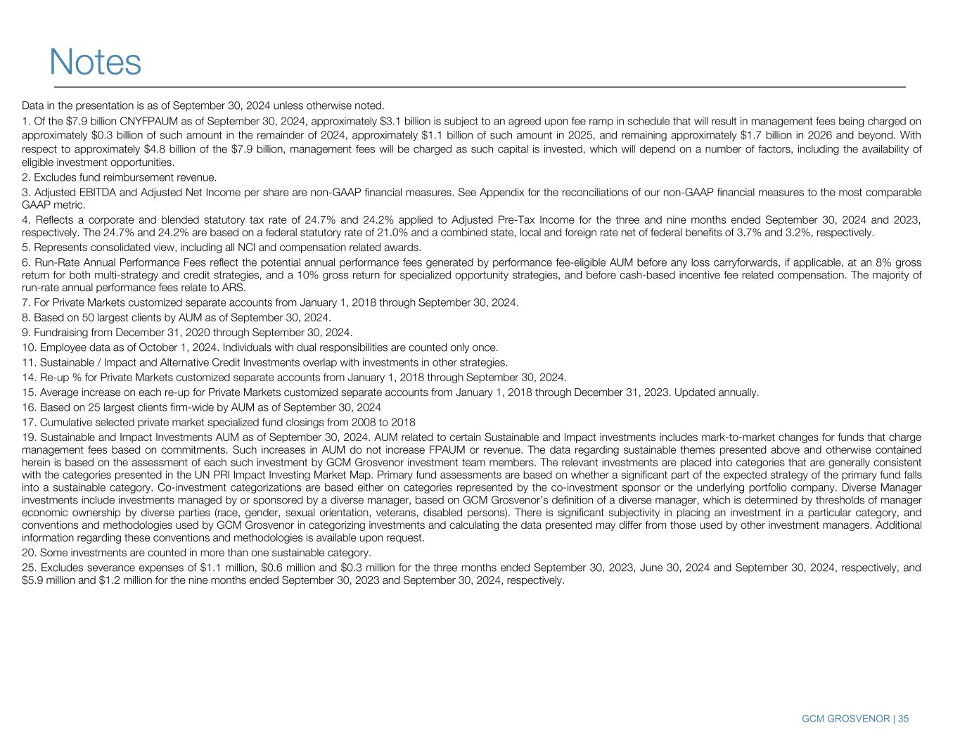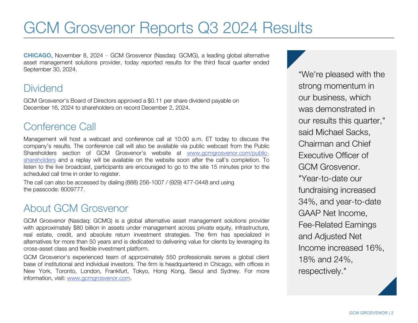 GCM GROSVENOR | 2 GCM Grosvenor Reports Q3 2024 Results CHICAGO, November 8, 2024 – GCM Grosvenor (Nasdaq: GCMG), a leading global alternative asset management solutions provider, today reported results for the third fiscal quarter ended September 30, 2024. Dividend GCM Grosvenor's Board of Directors approved a $0.11 per share dividend payable on December 16, 2024 to shareholders on record December 2, 2024. Conference Call Management will host a webcast and conference call at 10:00 a.m. ET today to discuss the company’s results. The conference call will also be available via public webcast from the Public Shareholders section of GCM Grosvenor’s website at www.gcmgrosvenor.com/public- shareholders and a replay will be available on the website soon after the call’s completion. To listen to the live broadcast, participants are encouraged to go to the site 15 minutes prior to the scheduled call time in order to register. The call can also be accessed by dialing (888) 256-1007 / (929) 477-0448 and using the passcode: 8009777. About GCM Grosvenor GCM Grosvenor (Nasdaq: GCMG) is a global alternative asset management solutions provider with approximately $80 billion in assets under management across private equity, infrastructure, real estate, credit, and absolute return investment strategies. The firm has specialized in alternatives for more than 50 years and is dedicated to delivering value for clients by leveraging its cross-asset class and flexible investment platform. GCM Grosvenor’s experienced team of approximately 550 professionals serves a global client base of institutional and individual investors. The firm is headquartered in Chicago, with offices in New York, Toronto, London, Frankfurt, Tokyo, Hong Kong, Seoul and Sydney. For more information, visit: www.gcmgrosvenor.com. “We're pleased with the strong momentum in our business, which was demonstrated in our results this quarter," said Michael Sacks, Chairman and Chief Executive Officer of GCM Grosvenor. "Year-to-date our fundraising increased 34%, and year-to-date GAAP Net Income, Fee-Related Earnings and Adjusted Net Income increased 16%, 18% and 24%, respectively."