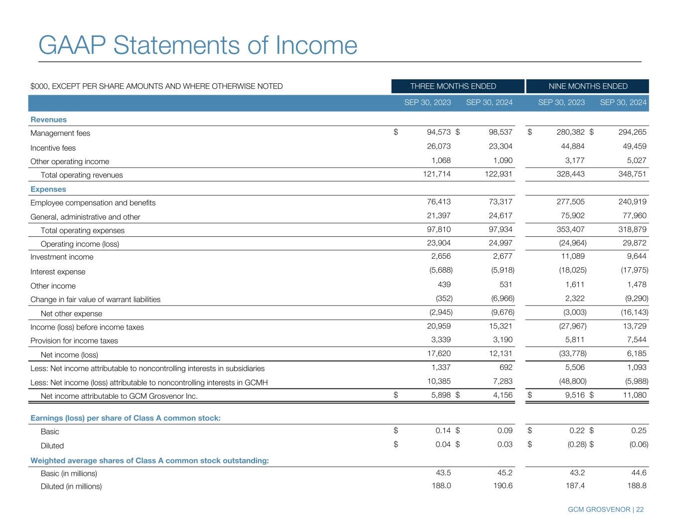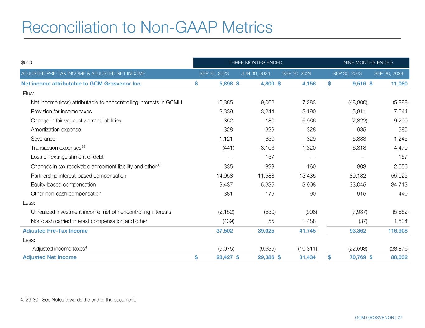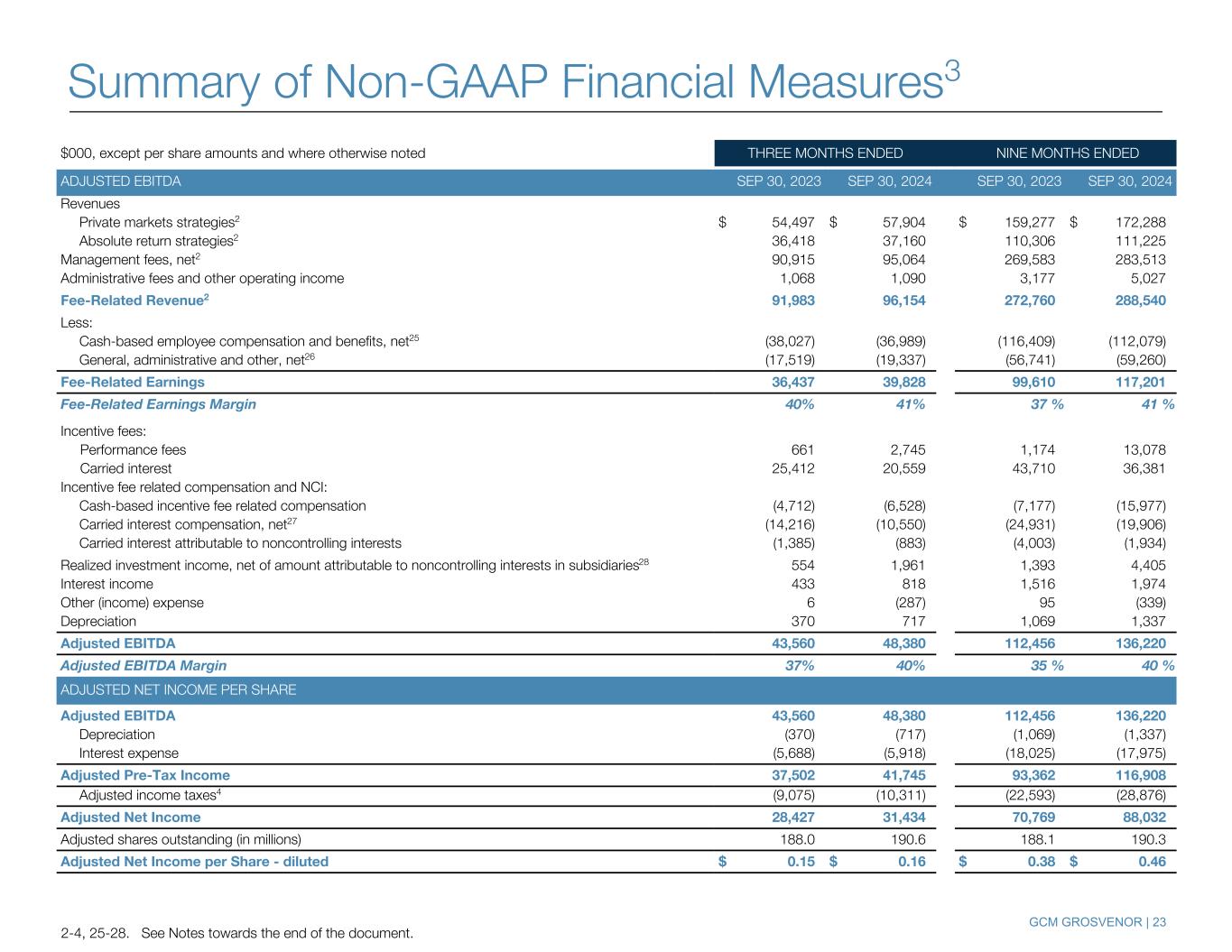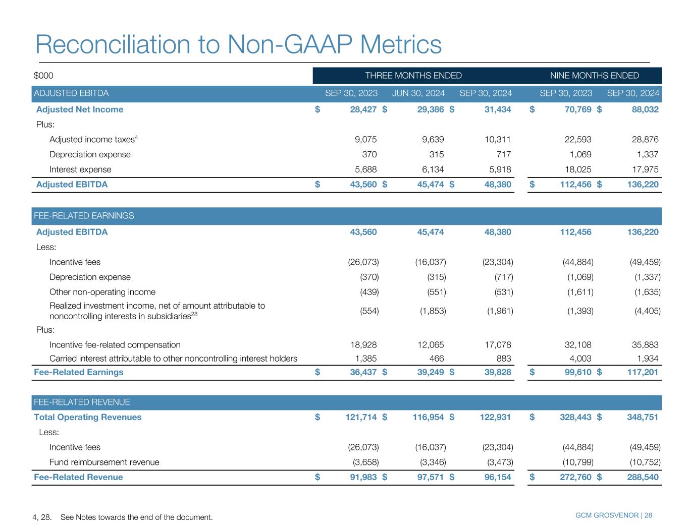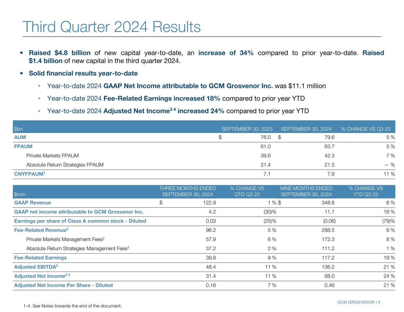 GCMグロブナーが2024年第3四半期の決算を発表、年初来の資金調達額は34%増加、年初来のGAAPベースの純利益、手数料関連利益、調整後純利益はそれぞれ前年同期比16%、18%、24%増加。