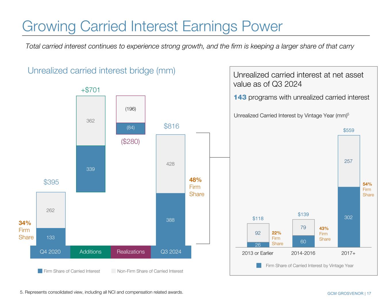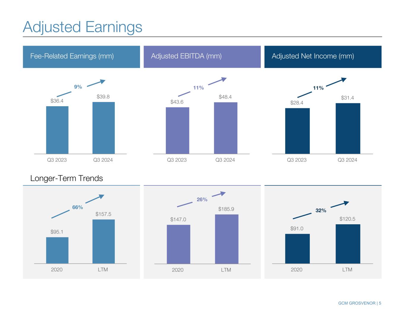 GCM GROSVENOR | 4 Third Quarter 2023 Results $bn SEPTEMBER 30, 2023 SEPTEMBER 30, 2024 % CHANGE VS Q3 23 AUM $ 76.0 $ 79.6 5 % FPAUM 61.0 63.7 5 % Private Markets FPAUM 39.6 42.3 7 % Absolute Return Strategies FPAUM 21.4 21.5 — % CNYFPAUM1 7.1 7.9 11 % $mm THREE MONTHS ENDED SEPTEMBER 30, 2024 % CHANGE VS QTD Q3 23 NINE MONTHS ENDED SEPTEMBER 30, 2024 % CHANGE VS YTD Q3 23 GAAP Revenue $ 122.9 1 % $ 348.8 6 % GAAP net income attributable to GCM Grosvenor Inc. 4.2 (30) % 11.1 16 % Earnings per share of Class A common stock - Diluted 0.03 (25) % (0.06) (79) % Fee-Related Revenue2 96.2 5 % 288.5 6 % Private Markets Management Fees2 57.9 6 % 172.3 8 % Absolute Return Strategies Management Fees2 37.2 2 % 111.2 1 % Fee-Related Earnings 39.8 9 % 117.2 18 % Adjusted EBITDA3 48.4 11 % 136.2 21 % Adjusted Net Income3 4 31.4 11 % 88.0 24 % Adjusted Net Income Per Share - Diluted 0.16 7 % 0.46 21 % • Raised $4.8 billion of new capital year-to-date, an increase of 34% compared to prior year-to-date. Raised $1.4 billion of new capital in the third quarter 2024. • Solid financial results year-to-date ◦ Year-to-date 2024 GAAP Net Income attributable to GCM Grosvenor Inc. was $11.1 million ◦ Year-to-date 2024 Fee-Related Earnings increased 18% compared to prior year YTD ◦ Year-to-date 2024 Adjusted Net Income3 4 increased 24% compared to prior year YTD 1-4. See Notes towards the end of the document. Third Quarter 2024 Results