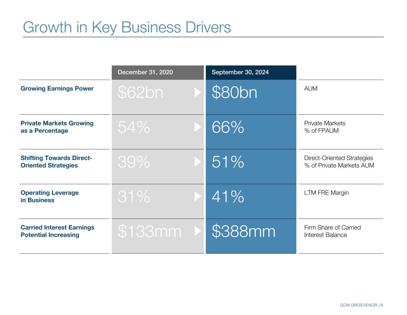 GCM GROSVENOR | 5 Adjusted Earnings Fee-Related Earnings (mm) Adjusted EBITDA (mm) Adjusted Net Income (mm) Longer-Term Trends $91.0 $120.5 91.0 120.5 2020 LTM $95.1 $157.5 2020 LTM $147.0 $185.9 2020 LTM 26% 32% 66% $28.4 $31.4 28.4 31.4 Q3 2023 Q3 2024 $36.4 $39.8 Q3 2023 Q3 2024 $43.6 $48.4 Q3 2023 Q3 2024 11% 11%9%