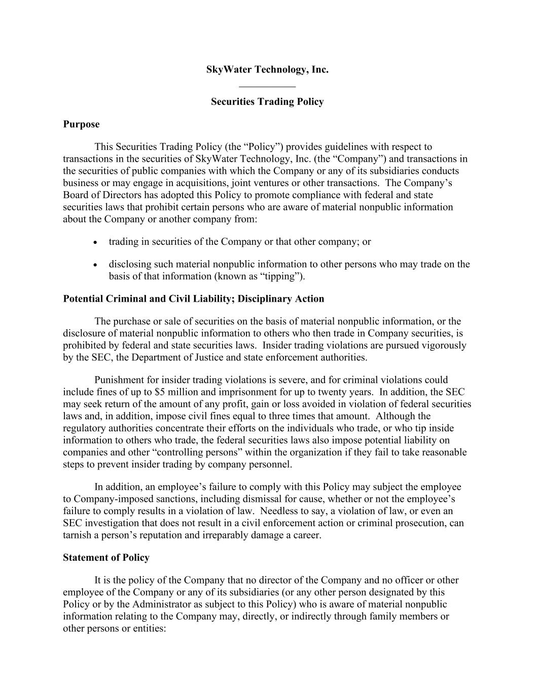 SkyWater Technology, Inc. __________ Securities Trading Policy Purpose This Securities Trading Policy (the “Policy”) provides guidelines with respect to transactions in the securities of SkyWater Technology, Inc. (the “Company”) and transactions in the securities of public companies with which the Company or any of its subsidiaries conducts business or may engage in acquisitions, joint ventures or other transactions. The Company’s Board of Directors has adopted this Policy to promote compliance with federal and state securities laws that prohibit certain persons who are aware of material nonpublic information about the Company or another company from: • trading in securities of the Company or that other company; or • disclosing such material nonpublic information to other persons who may trade on the basis of that information (known as “tipping”). Potential Criminal and Civil Liability; Disciplinary Action The purchase or sale of securities on the basis of material nonpublic information, or the disclosure of material nonpublic information to others who then trade in Company securities, is prohibited by federal and state securities laws. Insider trading violations are pursued vigorously by the SEC, the Department of Justice and state enforcement authorities. Punishment for insider trading violations is severe, and for criminal violations could include fines of up to $5 million and imprisonment for up to twenty years. In addition, the SEC may seek return of the amount of any profit, gain or loss avoided in violation of federal securities laws and, in addition, impose civil fines equal to three times that amount. Although the regulatory authorities concentrate their efforts on the individuals who trade, or who tip inside information to others who trade, the federal securities laws also impose potential liability on companies and other “controlling persons” within the organization if they fail to take reasonable steps to prevent insider trading by company personnel. In addition, an employee’s failure to comply with this Policy may subject the employee to Company-imposed sanctions, including dismissal for cause, whether or not the employee’s failure to comply results in a violation of law. Needless to say, a violation of law, or even an SEC investigation that does not result in a civil enforcement action or criminal prosecution, can tarnish a person’s reputation and irreparably damage a career. Statement of Policy It is the policy of the Company that no director of the Company and no officer or other employee of the Company or any of its subsidiaries (or any other person designated by this Policy or by the Administrator as subject to this Policy) who is aware of material nonpublic information relating to the Company may, directly, or indirectly through family members or other persons or entities: