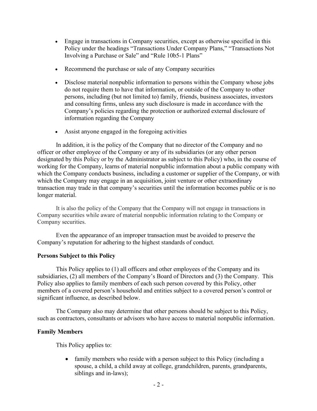 - 2 - • Engage in transactions in Company securities, except as otherwise specified in this Policy under the headings “Transactions Under Company Plans,” “Transactions Not Involving a Purchase or Sale” and “Rule 10b5-1 Plans” • Recommend the purchase or sale of any Company securities • Disclose material nonpublic information to persons within the Company whose jobs do not require them to have that information, or outside of the Company to other persons, including (but not limited to) family, friends, business associates, investors and consulting firms, unless any such disclosure is made in accordance with the Company’s policies regarding the protection or authorized external disclosure of information regarding the Company • Assist anyone engaged in the foregoing activities In addition, it is the policy of the Company that no director of the Company and no officer or other employee of the Company or any of its subsidiaries (or any other person designated by this Policy or by the Administrator as subject to this Policy) who, in the course of working for the Company, learns of material nonpublic information about a public company with which the Company conducts business, including a customer or supplier of the Company, or with which the Company may engage in an acquisition, joint venture or other extraordinary transaction may trade in that company’s securities until the information becomes public or is no longer material. It is also the policy of the Company that the Company will not engage in transactions in Company securities while aware of material nonpublic information relating to the Company or Company securities. Even the appearance of an improper transaction must be avoided to preserve the Company’s reputation for adhering to the highest standards of conduct. Persons Subject to this Policy This Policy applies to (1) all officers and other employees of the Company and its subsidiaries, (2) all members of the Company’s Board of Directors and (3) the Company. This Policy also applies to family members of each such person covered by this Policy, other members of a covered person’s household and entities subject to a covered person’s control or significant influence, as described below. The Company also may determine that other persons should be subject to this Policy, such as contractors, consultants or advisors who have access to material nonpublic information. Family Members This Policy applies to: • family members who reside with a person subject to this Policy (including a spouse, a child, a child away at college, grandchildren, parents, grandparents, siblings and in-laws);