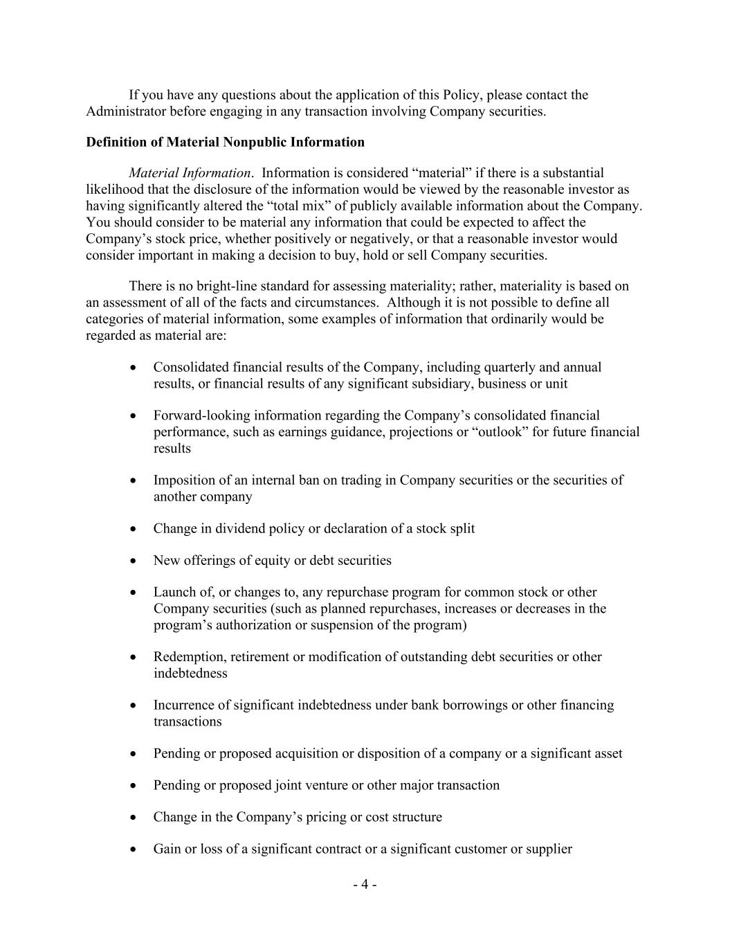 - 4 - If you have any questions about the application of this Policy, please contact the Administrator before engaging in any transaction involving Company securities. Definition of Material Nonpublic Information Material Information. Information is considered “material” if there is a substantial likelihood that the disclosure of the information would be viewed by the reasonable investor as having significantly altered the “total mix” of publicly available information about the Company. You should consider to be material any information that could be expected to affect the Company’s stock price, whether positively or negatively, or that a reasonable investor would consider important in making a decision to buy, hold or sell Company securities. There is no bright-line standard for assessing materiality; rather, materiality is based on an assessment of all of the facts and circumstances. Although it is not possible to define all categories of material information, some examples of information that ordinarily would be regarded as material are: • Consolidated financial results of the Company, including quarterly and annual results, or financial results of any significant subsidiary, business or unit • Forward-looking information regarding the Company’s consolidated financial performance, such as earnings guidance, projections or “outlook” for future financial results • Imposition of an internal ban on trading in Company securities or the securities of another company • Change in dividend policy or declaration of a stock split • New offerings of equity or debt securities • Launch of, or changes to, any repurchase program for common stock or other Company securities (such as planned repurchases, increases or decreases in the program’s authorization or suspension of the program) • Redemption, retirement or modification of outstanding debt securities or other indebtedness • Incurrence of significant indebtedness under bank borrowings or other financing transactions • Pending or proposed acquisition or disposition of a company or a significant asset • Pending or proposed joint venture or other major transaction • Change in the Company’s pricing or cost structure • Gain or loss of a significant contract or a significant customer or supplier