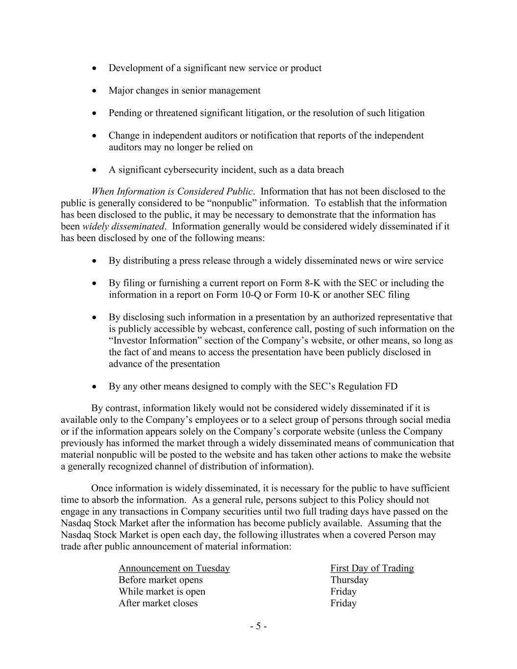 - 5 - • Development of a significant new service or product • Major changes in senior management • Pending or threatened significant litigation, or the resolution of such litigation • Change in independent auditors or notification that reports of the independent auditors may no longer be relied on • A significant cybersecurity incident, such as a data breach When Information is Considered Public. Information that has not been disclosed to the public is generally considered to be “nonpublic” information. To establish that the information has been disclosed to the public, it may be necessary to demonstrate that the information has been widely disseminated. Information generally would be considered widely disseminated if it has been disclosed by one of the following means: • By distributing a press release through a widely disseminated news or wire service • By filing or furnishing a current report on Form 8-K with the SEC or including the information in a report on Form 10-Q or Form 10-K or another SEC filing • By disclosing such information in a presentation by an authorized representative that is publicly accessible by webcast, conference call, posting of such information on the “Investor Information” section of the Company’s website, or other means, so long as the fact of and means to access the presentation have been publicly disclosed in advance of the presentation • By any other means designed to comply with the SEC’s Regulation FD By contrast, information likely would not be considered widely disseminated if it is available only to the Company’s employees or to a select group of persons through social media or if the information appears solely on the Company’s corporate website (unless the Company previously has informed the market through a widely disseminated means of communication that material nonpublic will be posted to the website and has taken other actions to make the website a generally recognized channel of distribution of information). Once information is widely disseminated, it is necessary for the public to have sufficient time to absorb the information. As a general rule, persons subject to this Policy should not engage in any transactions in Company securities until two full trading days have passed on the Nasdaq Stock Market after the information has become publicly available. Assuming that the Nasdaq Stock Market is open each day, the following illustrates when a covered Person may trade after public announcement of material information: Announcement on Tuesday First Day of Trading Before market opens Thursday While market is open Friday After market closes Friday